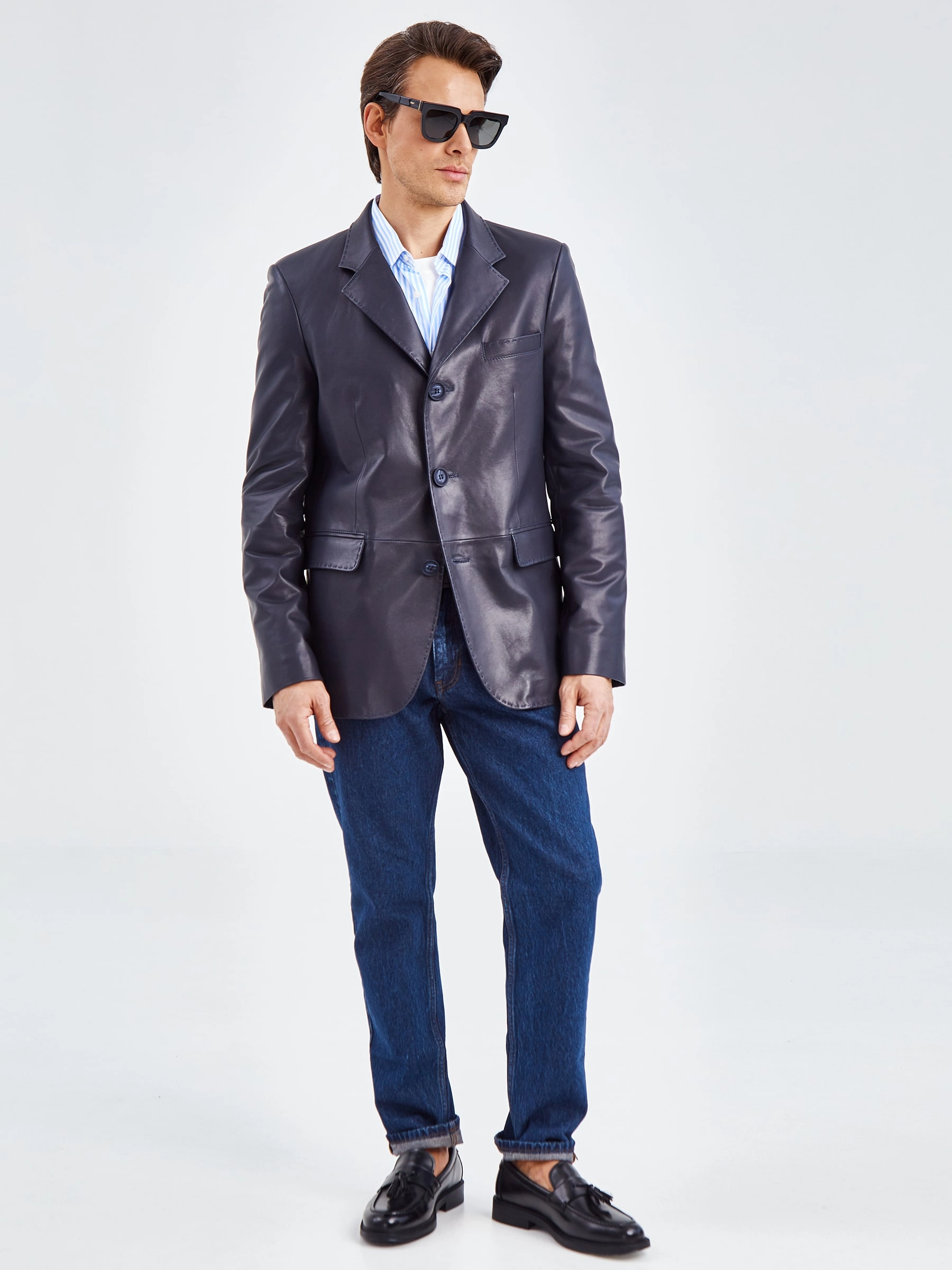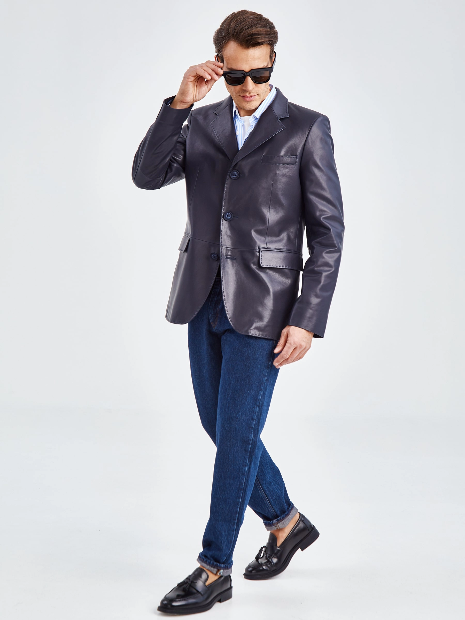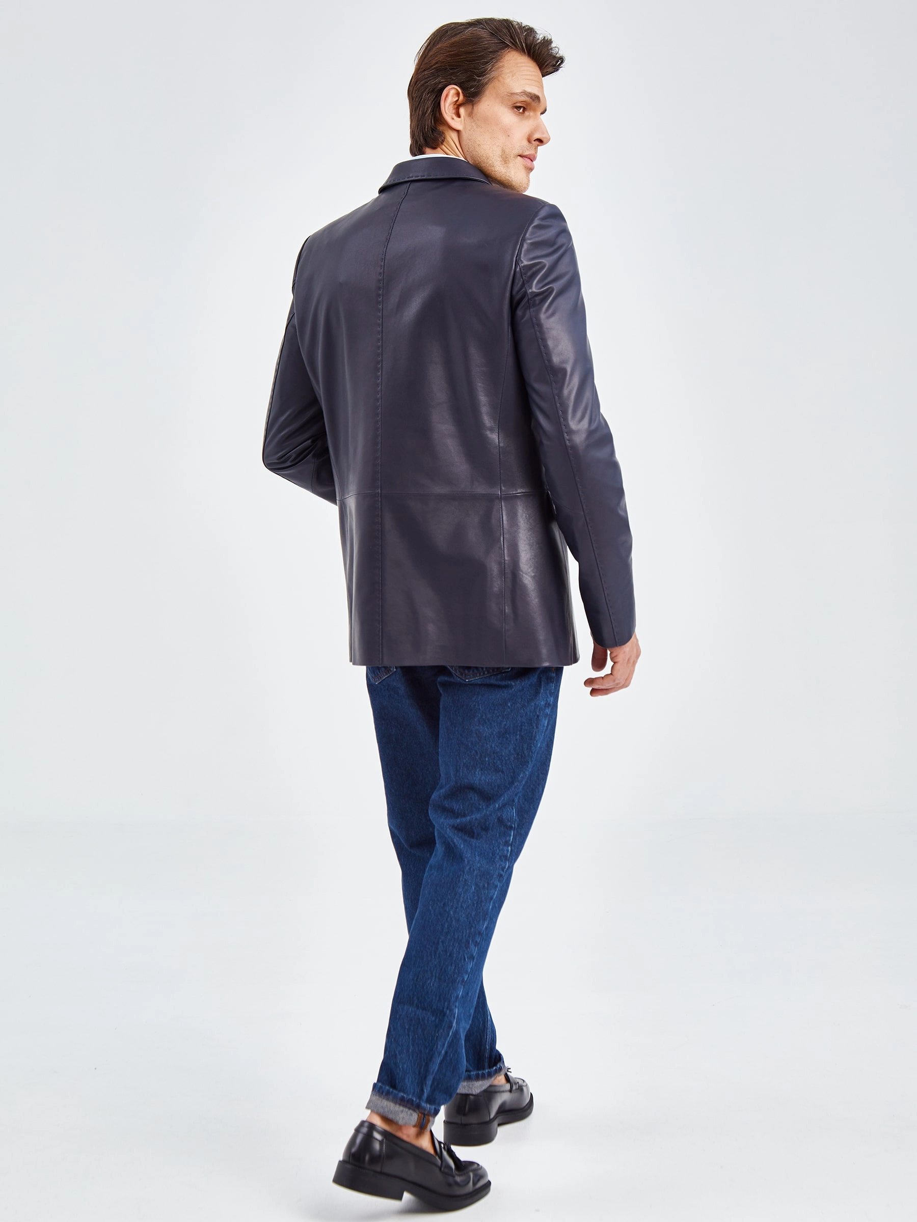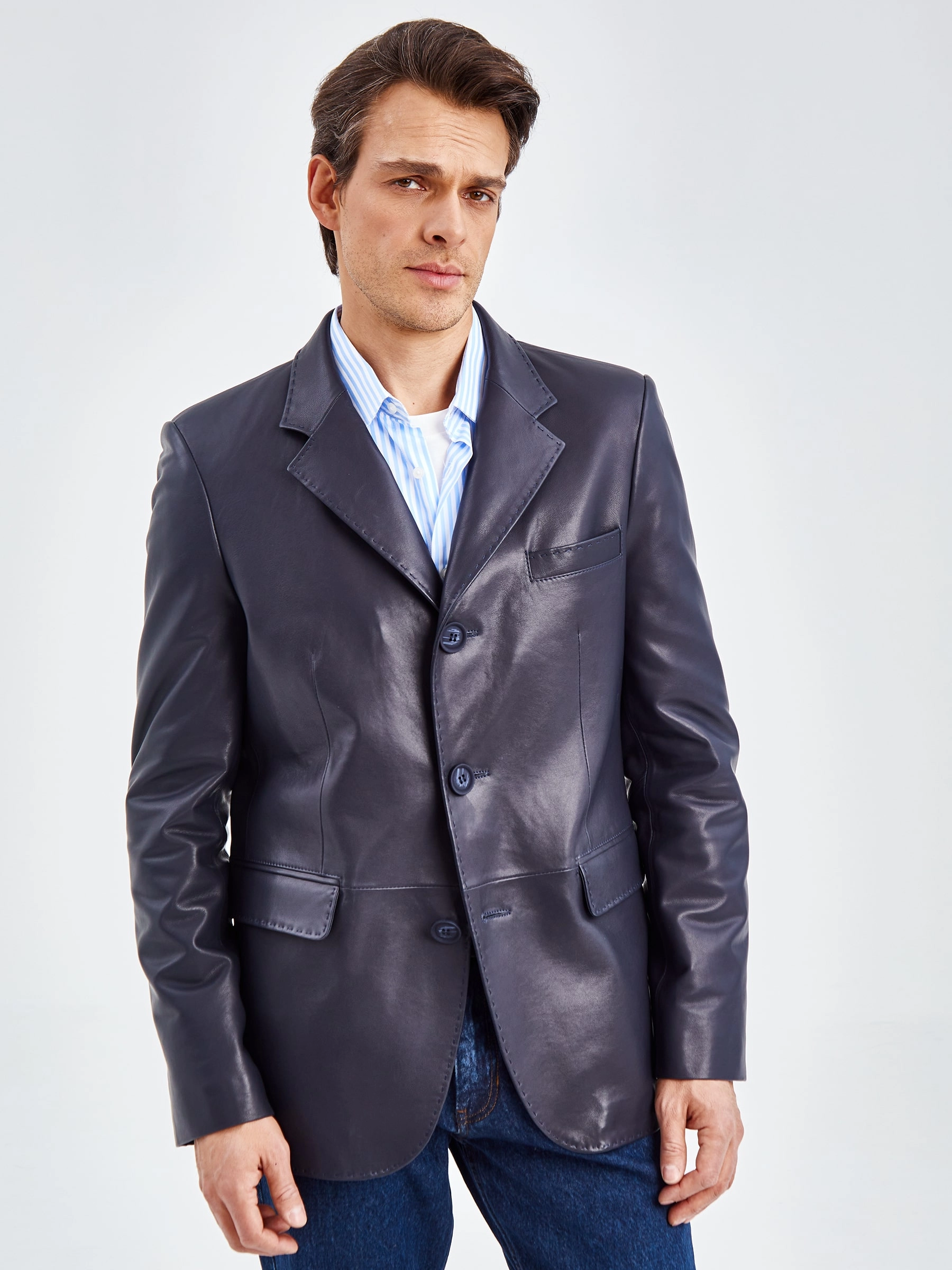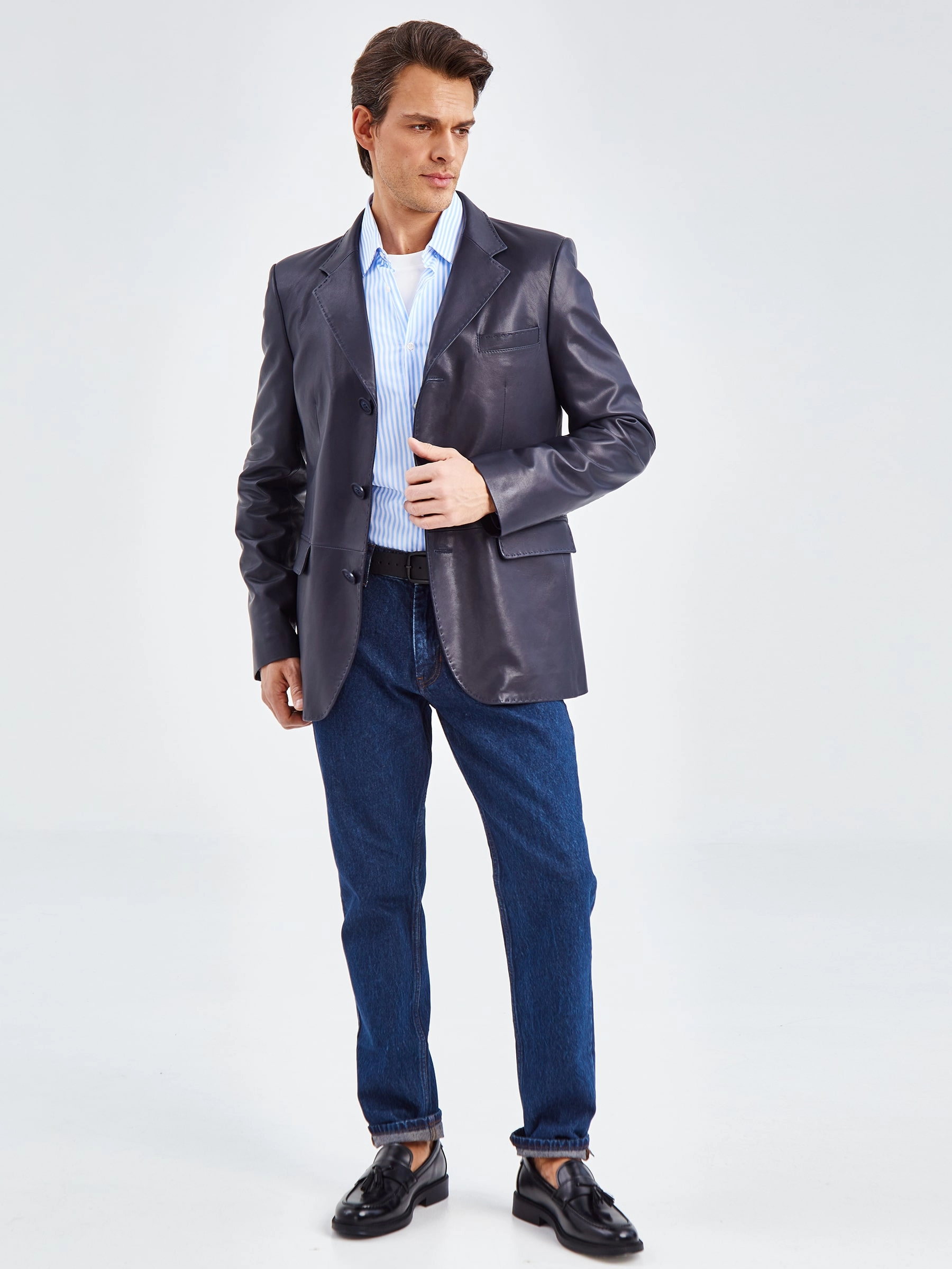 Товар мужской кожаный пиджак на ручном стежке премиум класса 543, синий, размер 50, артикул 27320 выполнен из натуральной кожи с застежкой пуговицы. Рассчитан на сезон: весна-лето. Длина изделия 78 см, силуэт полуприлегающий.
