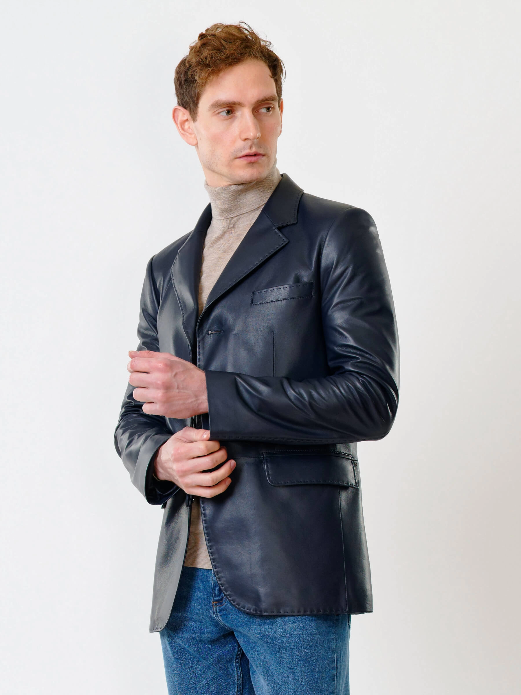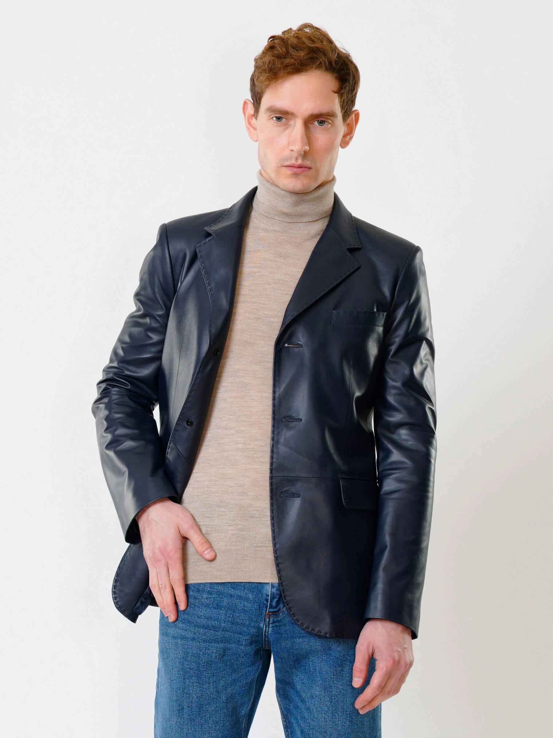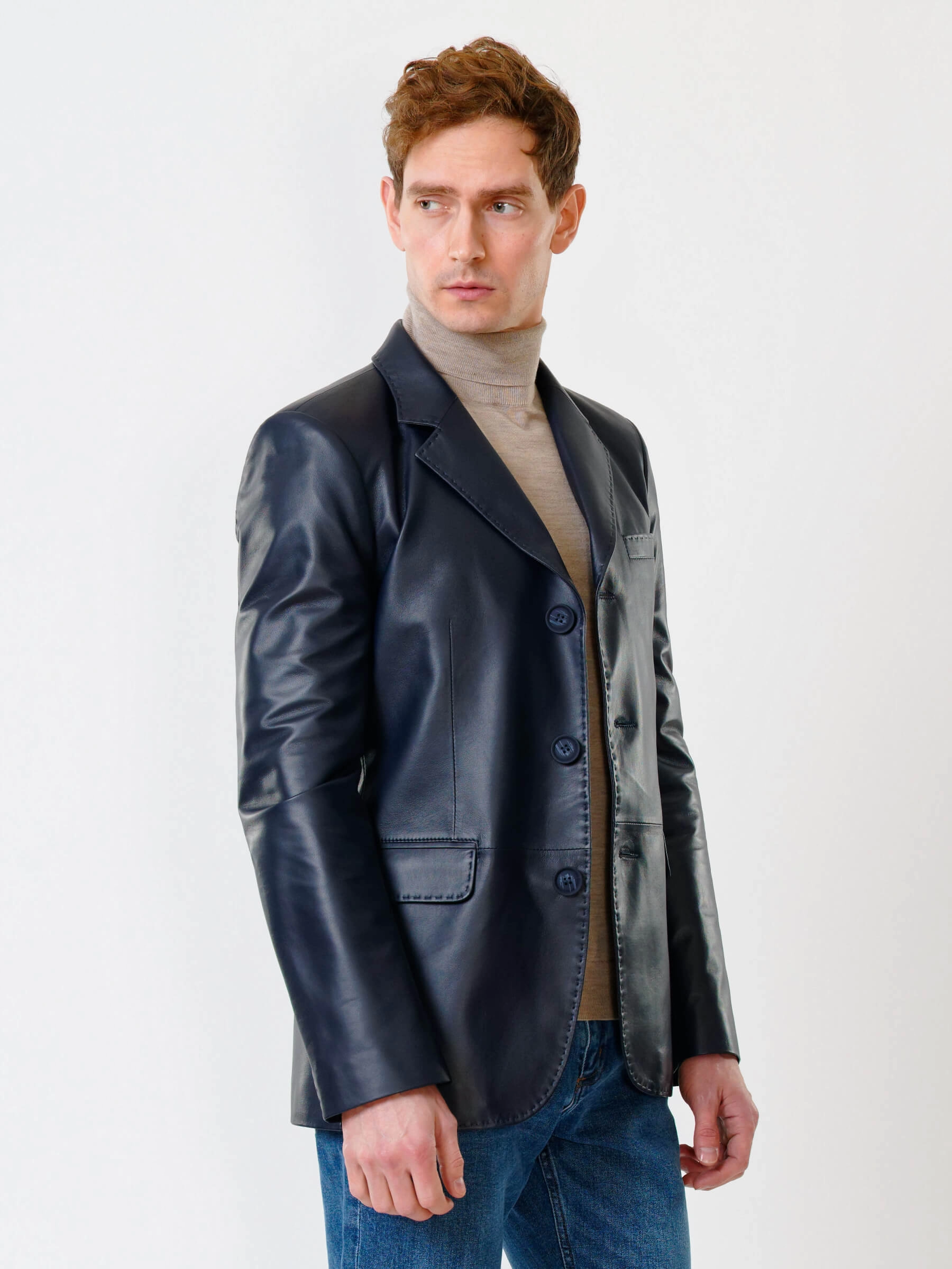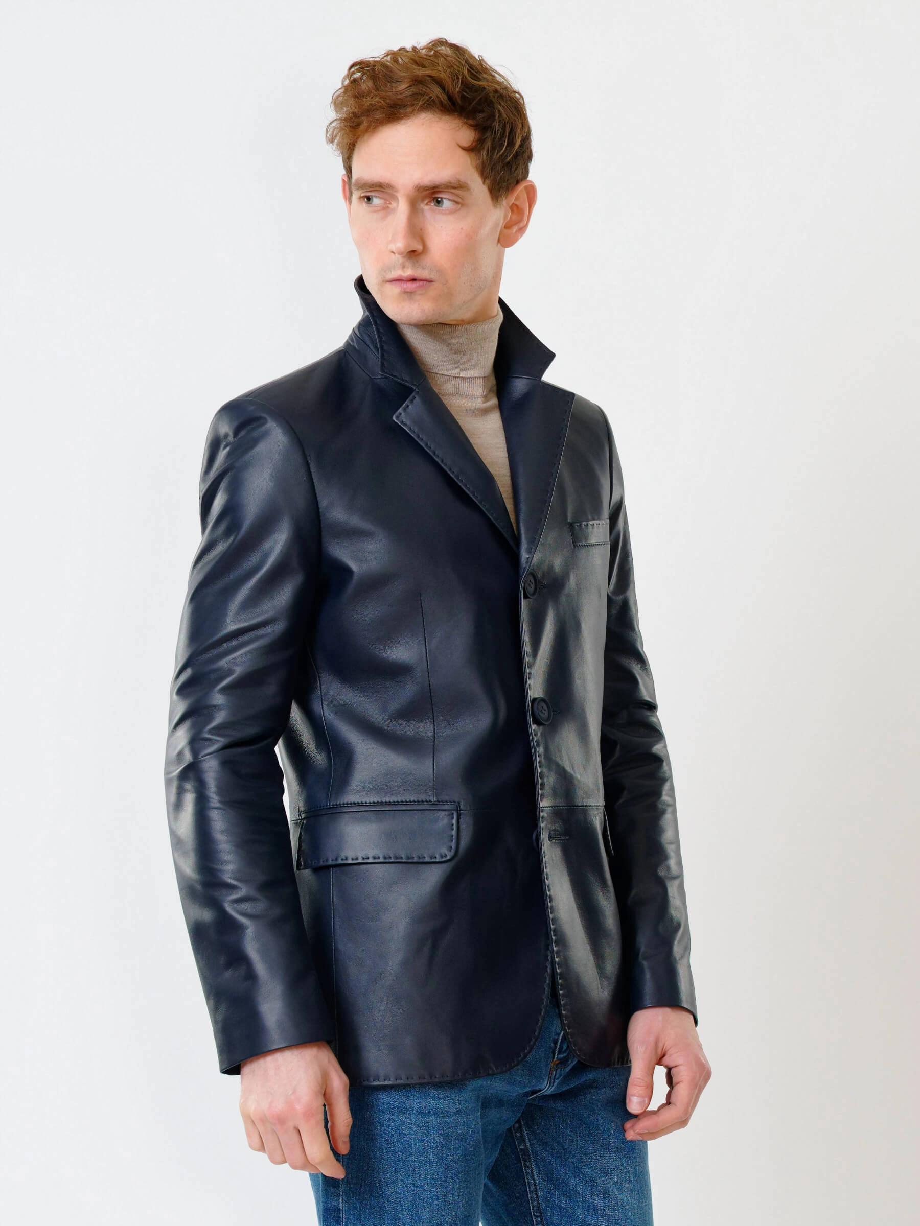 Товар мужской кожаный пиджак на ручном стежке премиум класса 543, синий, размер 50, артикул 28441 выполнен из натуральной кожи с застежкой пуговицы. Рассчитан на сезон: весна-лето. Длина изделия 78 см, силуэт полуприлегающий.