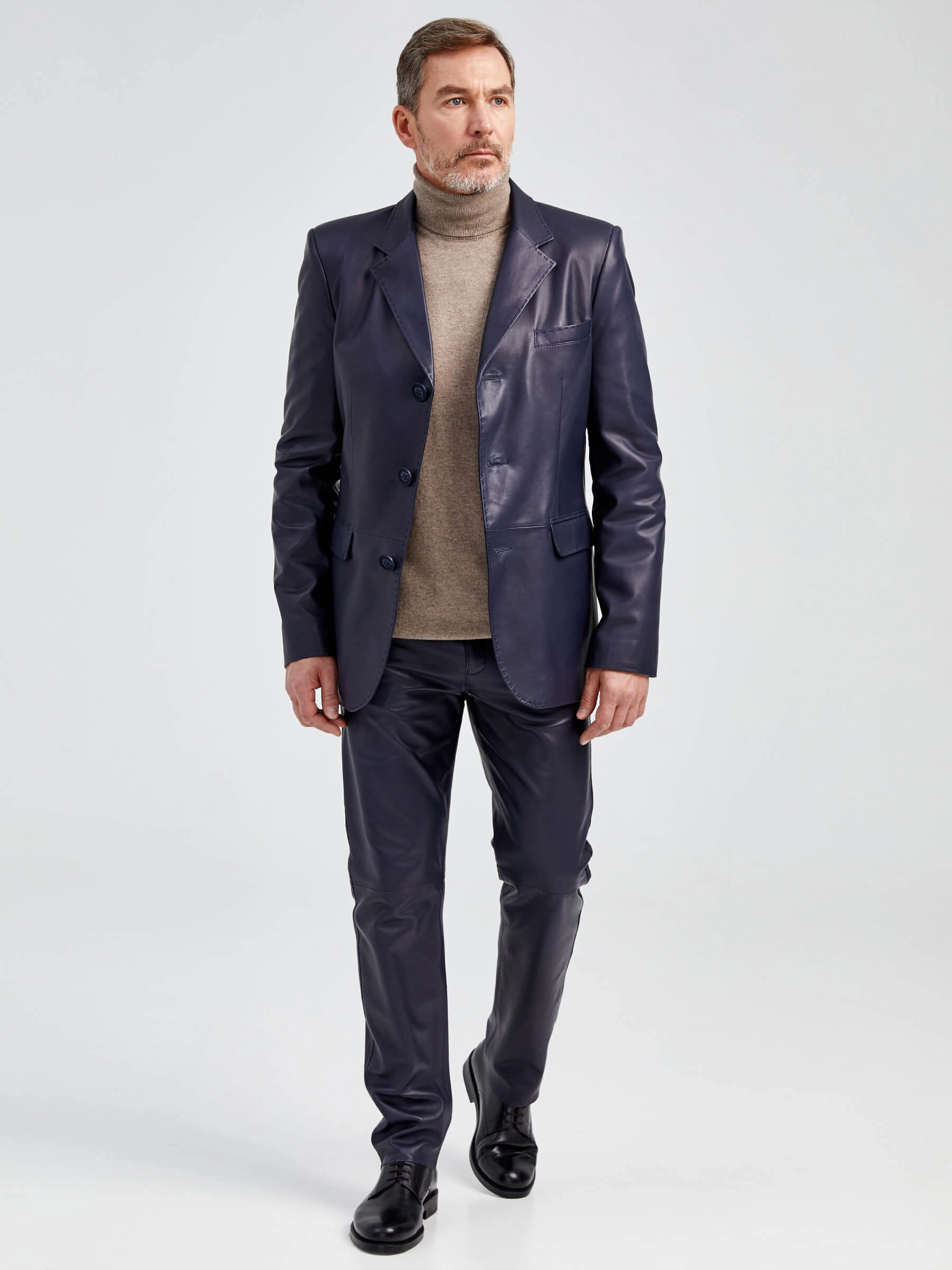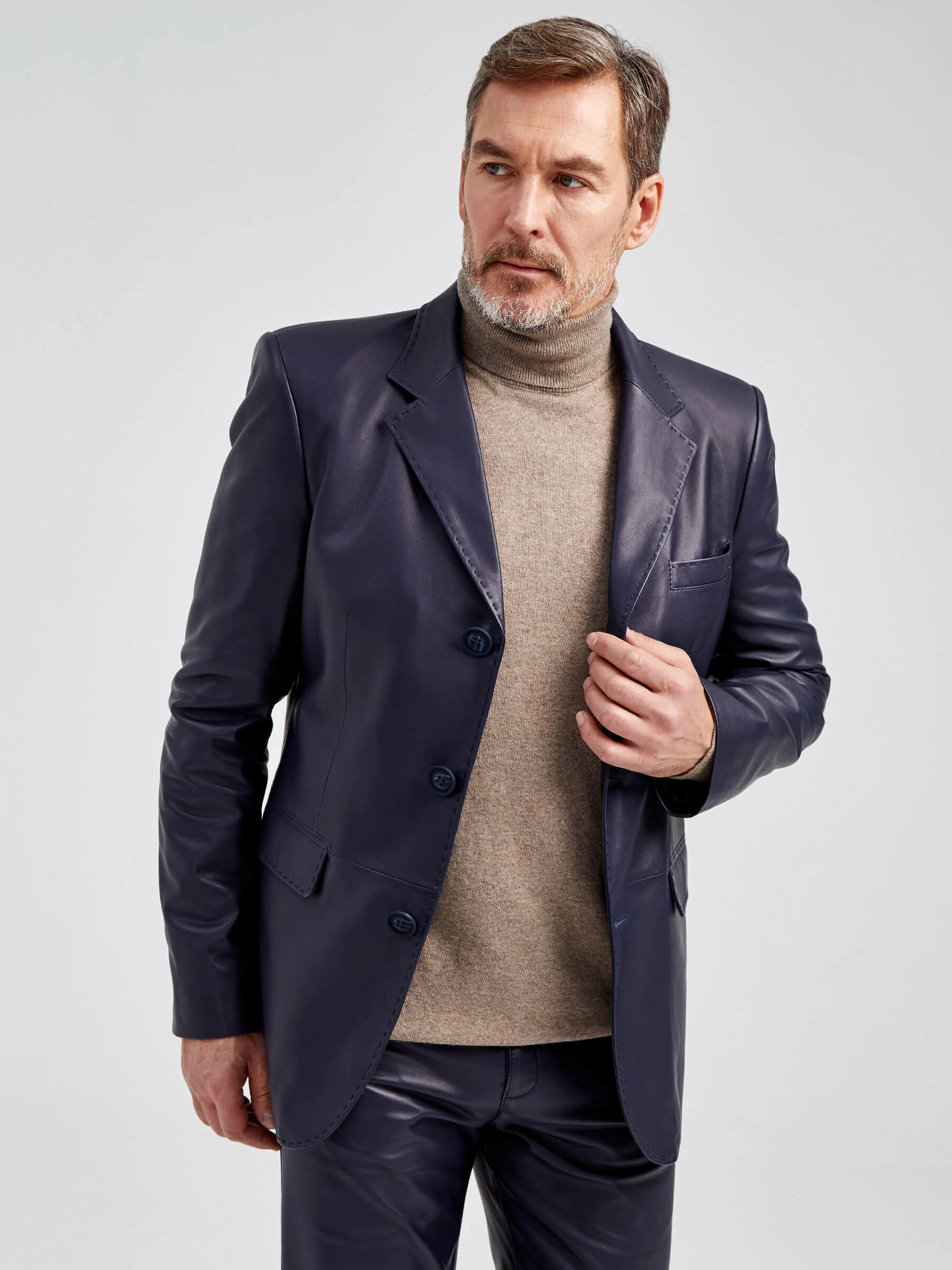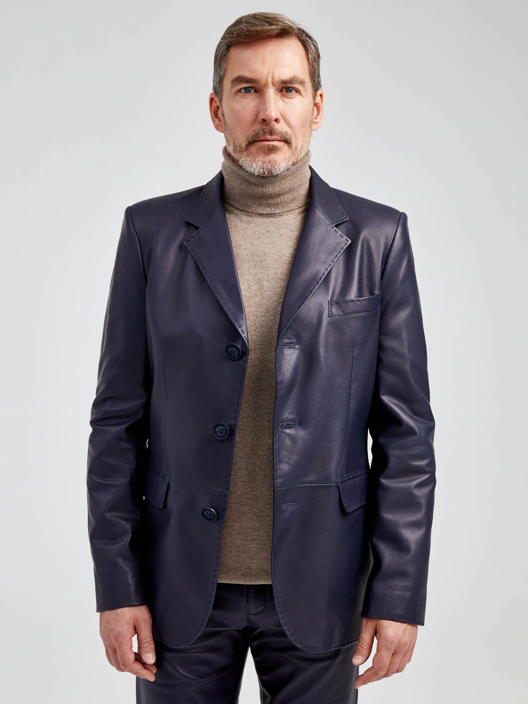 Товар мужской кожаный пиджак на ручном стежке премиум класса 543, синий, размер 50, артикул 28962 выполнен из натуральной кожи с застежкой пуговицы. Рассчитан на сезон: весна-лето. Длина изделия 78 см, силуэт полуприлегающий.