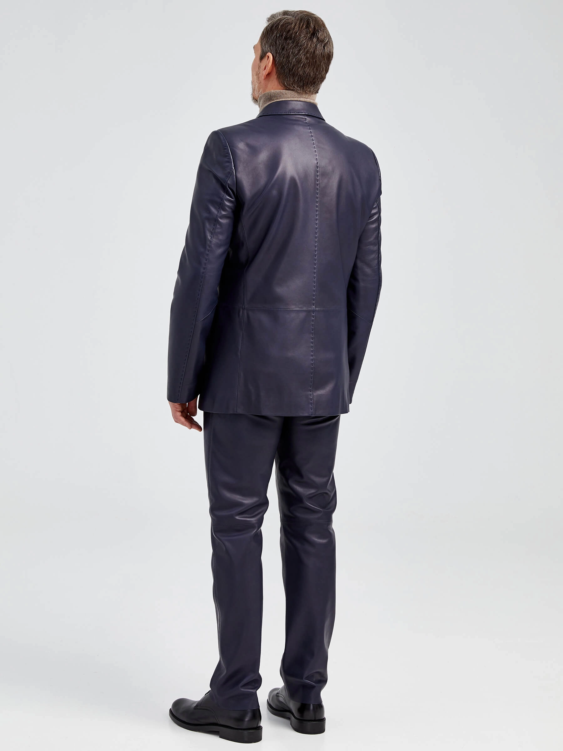 Мужской кожаный пиджак на ручном стежке премиум класса 543, синий, размер 50, артикул 28962
