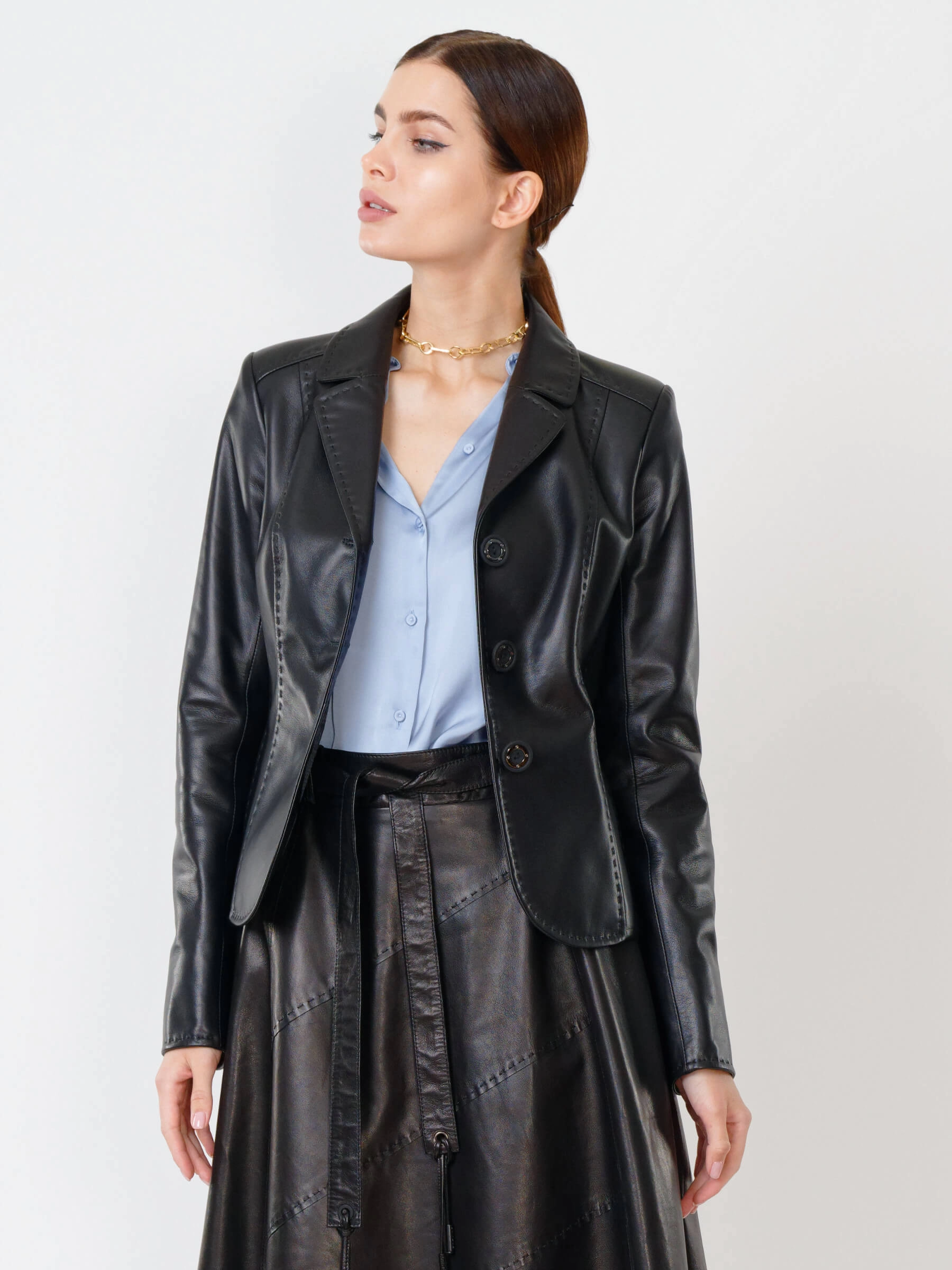 Изысканный кожаный пиджак длиной 50 см: полуприлегающий силуэт с акцентом на талию, классический английский воротник и ручная стежка подчеркивают аристократичную элегантность. Выполнен из мягкой натуральной кожи с врезными карманами и застёжкой на пуговицах с филигранной гравировкой. Создавайте выразительные контрасты: сочетайте с кожаными брюками-карго для дерзкого монохрома, с атласным платьем-чехлом для игры текстур или с зауженными джинсами и броги для смарт-кэжуал с намёком на роскошь. Этот пиджак — хамелеон вашего гардероба, трансформирующий образ от делового до авангардного.