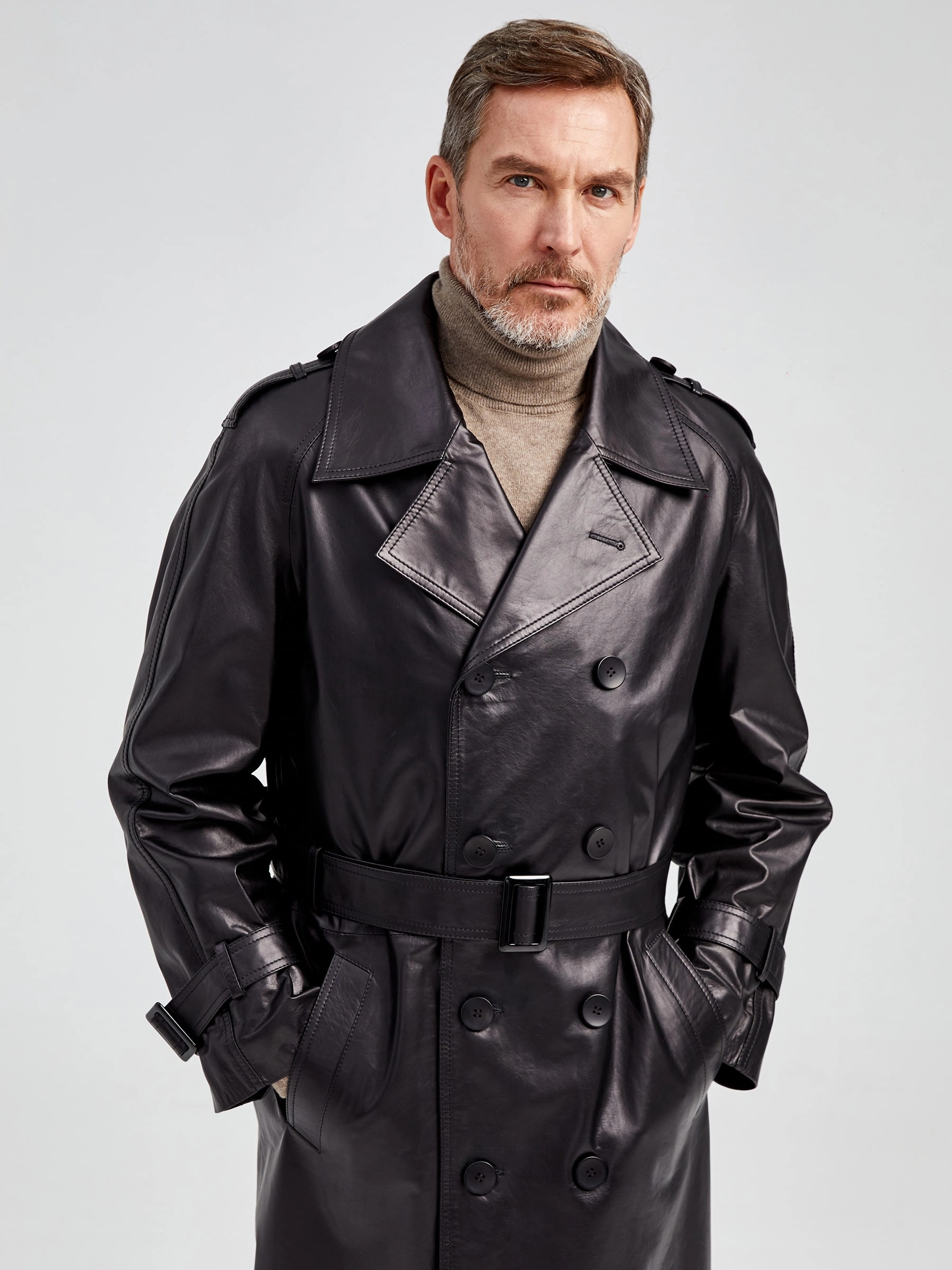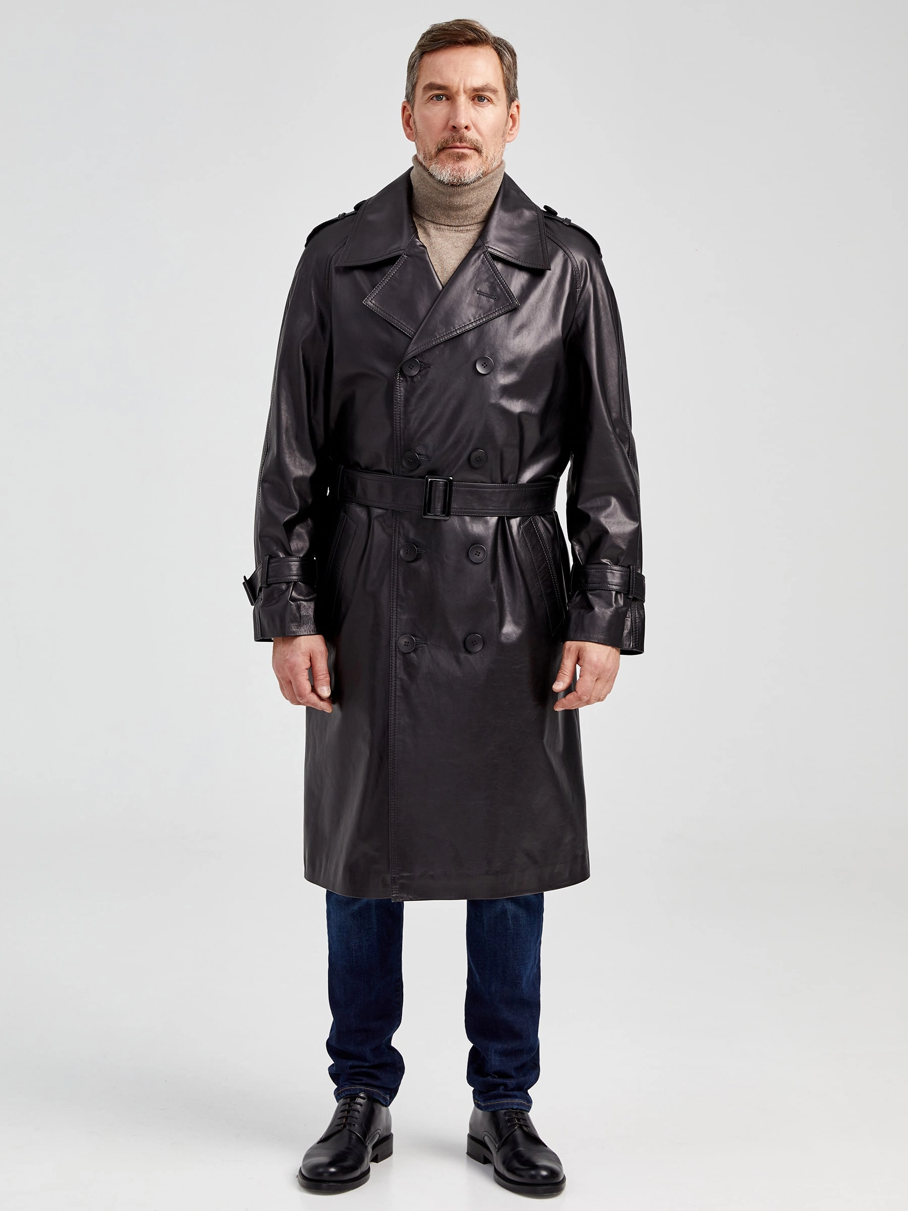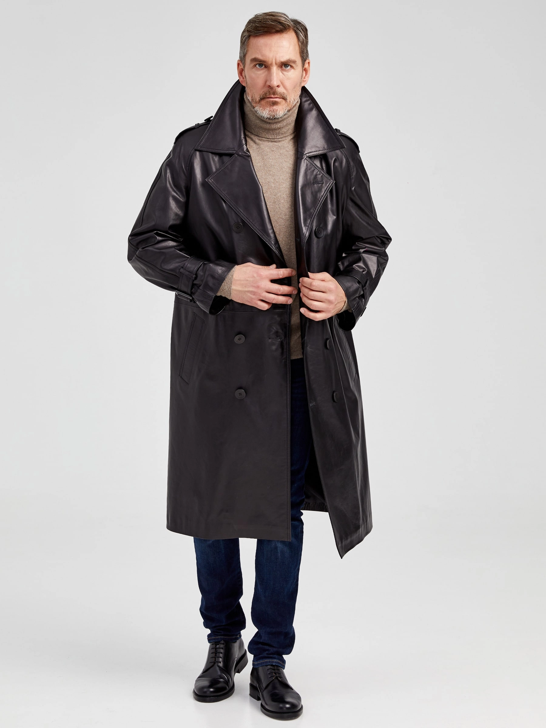 Двубортный кожаный плащ для уверенных в себе мужчин. Рукав - реглан, обеспечивают комфорт в движении. Сочетается по стилю как со свободной одеждой, так и со строгим деловым костюмом. Рекомендуется мужчинам, для которых важен дресс - код.
