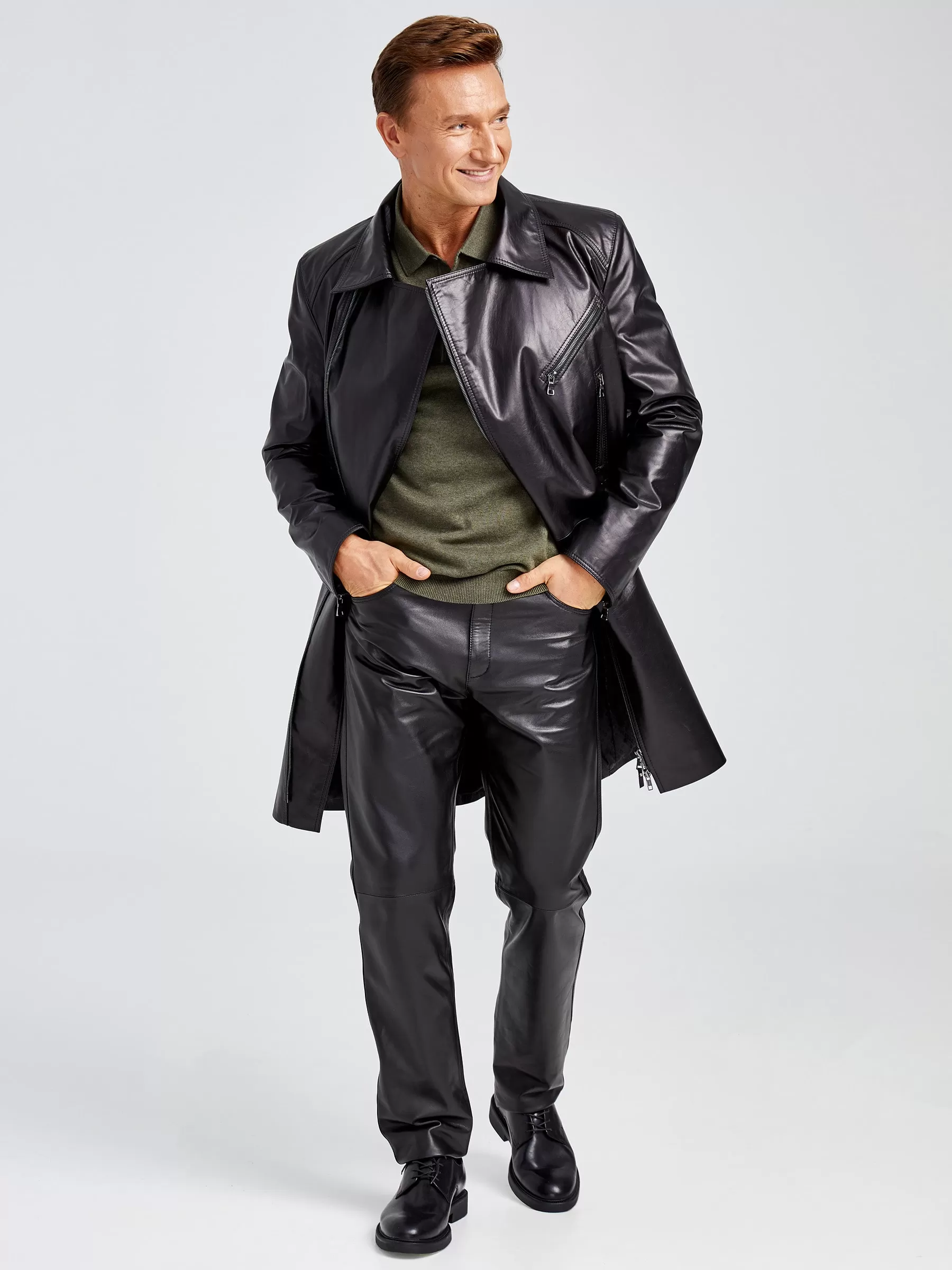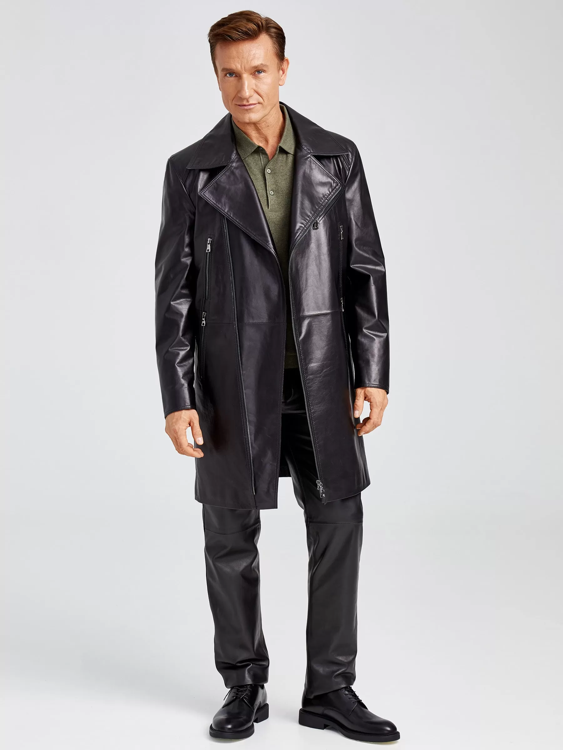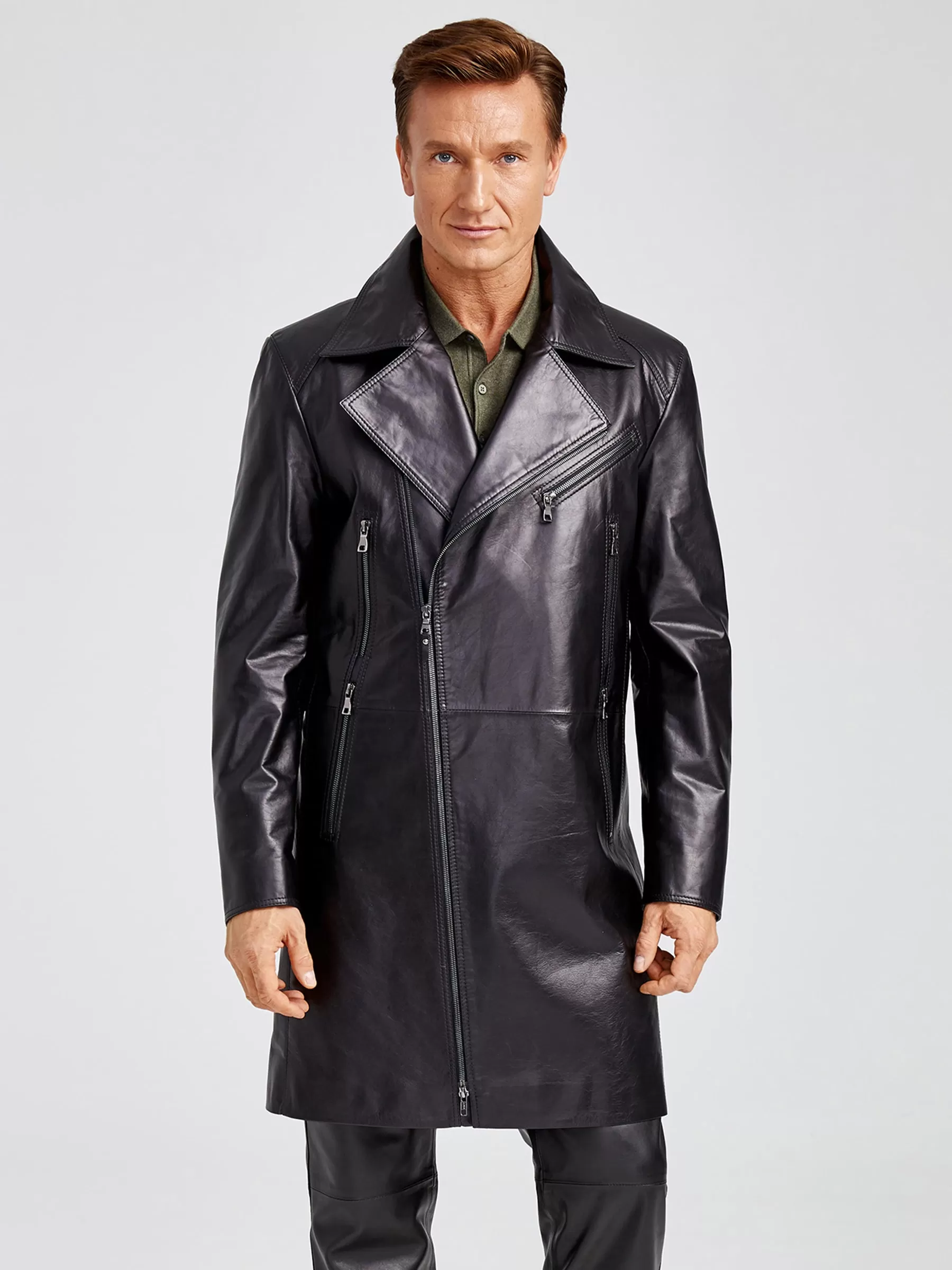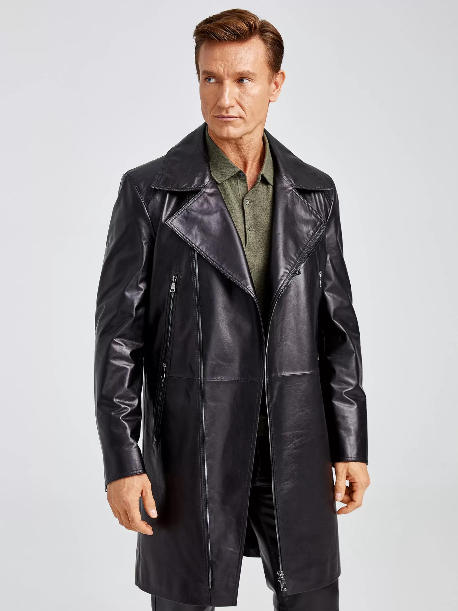Мужской кожаный плащ в спортивном стиле с элементами классической куртки - косухи. Ассиметричная застежка-молния с боковыми и нагрудными карманами на молниях. Молнии украшают и втачные рукава. Комфортную свободу движений обеспечивает шлица внизу центрального шва спинки.