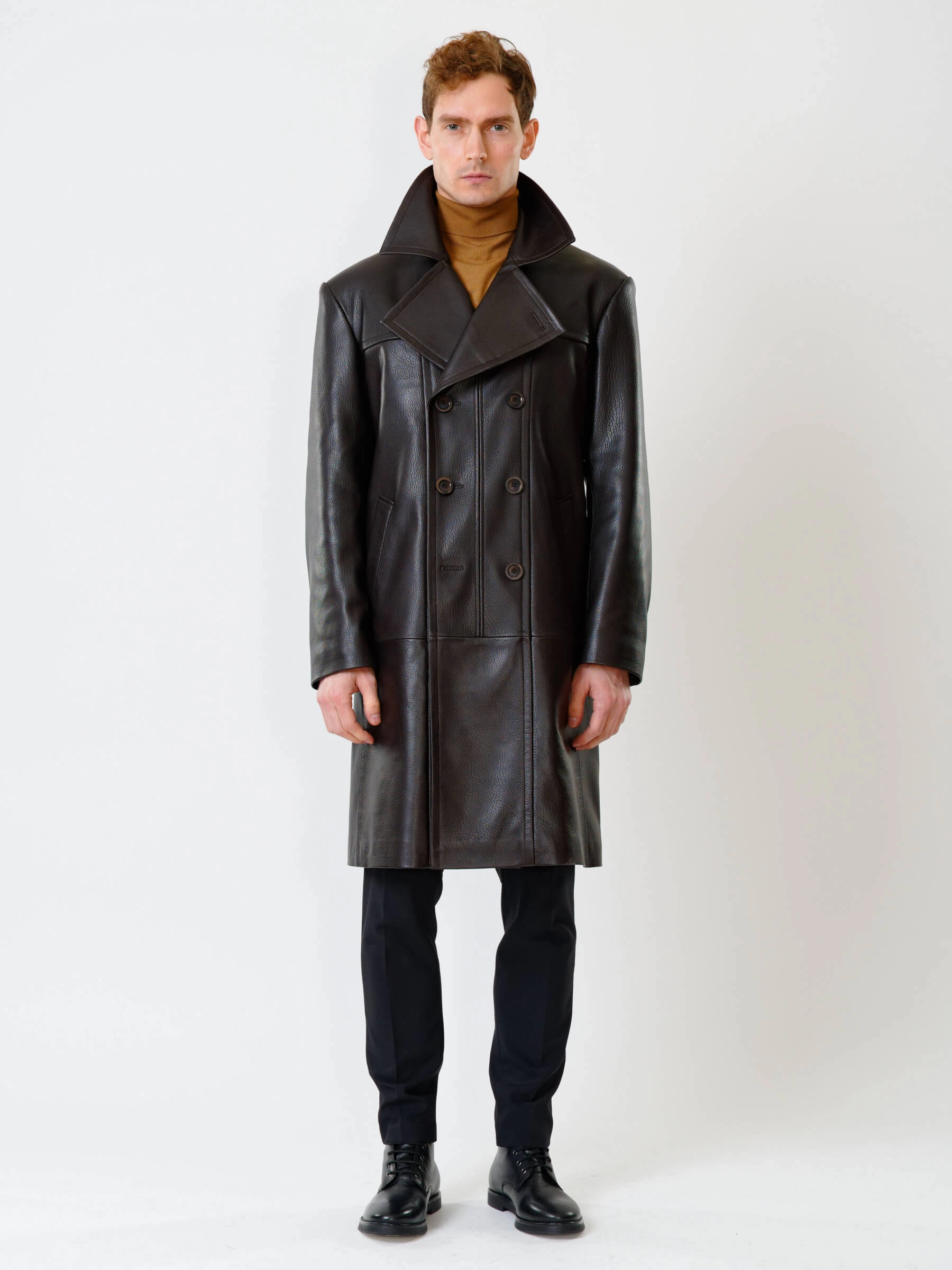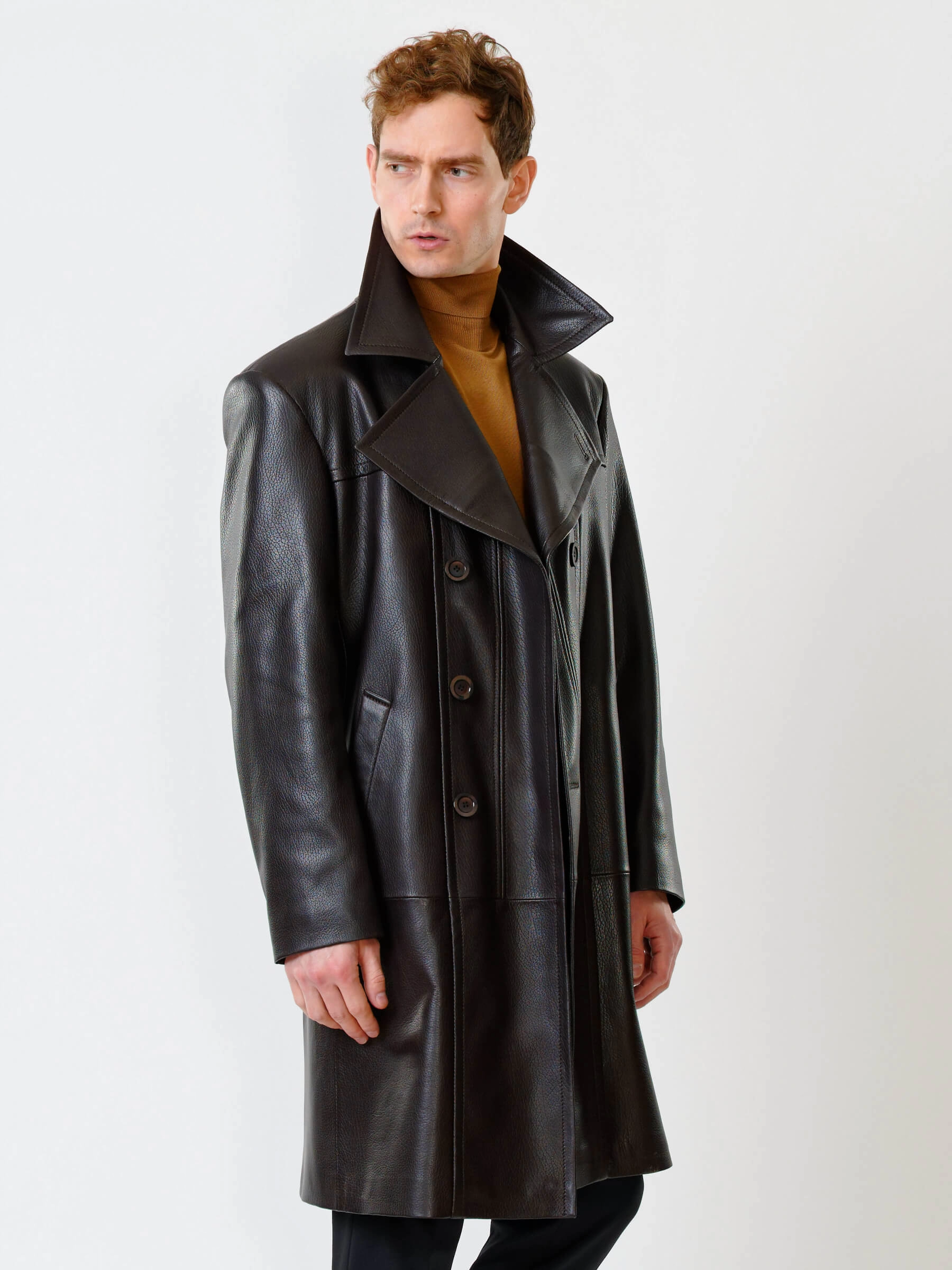 Двубортный кожаный плащ полуприлегающего силуэта с широкими лацканами и высокой шлицей- однозначно для тех, кто привык сочетать стиль и комфорт одновременно. Изделие выполнили из мягкой мелкозернистой кожи премиум класса. Безупречная посадка по фигуре. Предусмотрены боковые и внутренние застёгивающиеся карманы для документов. Прекрасное сочетание как со свободной одеждой, так и со строгим деловым костюмом.