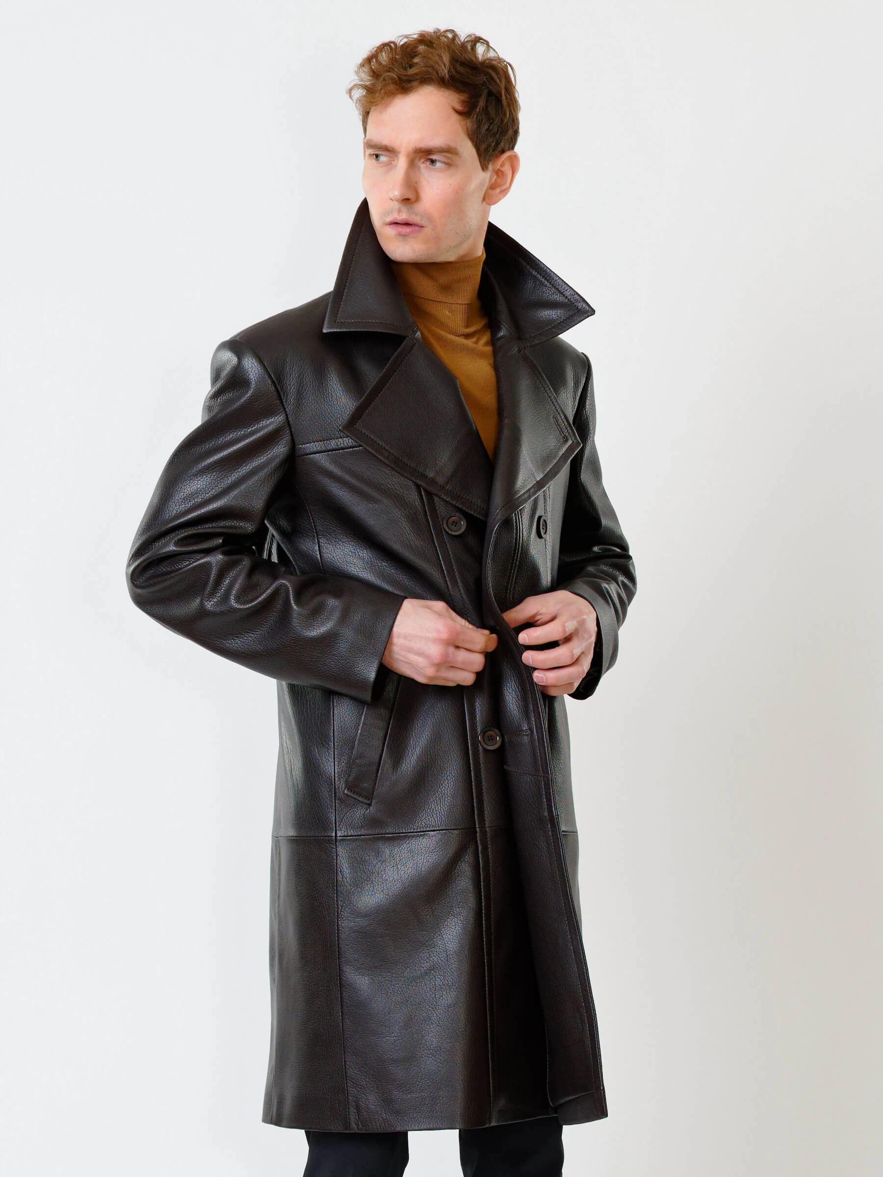 Товар двубортный мужской кожаный плащ премиум класса чикаго, коричневый, размер 46, артикул 28500 выполнен из натуральной кожи с застежкой пуговицы. Рассчитан на сезон: демисезон. Длина изделия 110 см, силуэт полуприлегающий.