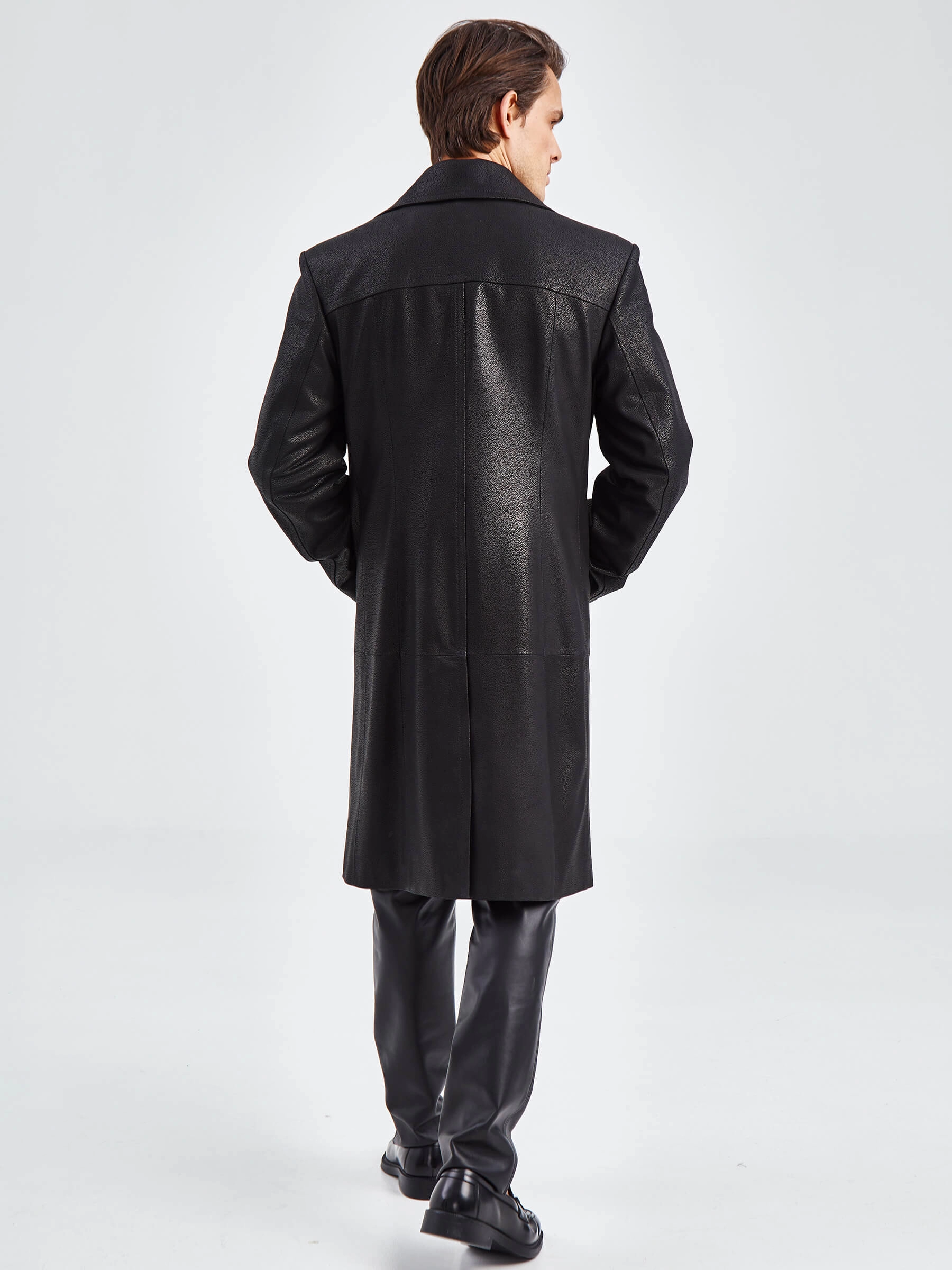 Товар двубортный мужской кожаный плащ премиум класса чикаго, черный, размер 48, артикул 21120 выполнен из натуральной кожи с застежкой пуговицы. Рассчитан на сезон: демисезон. Длина изделия 110 см, силуэт полуприлегающий.