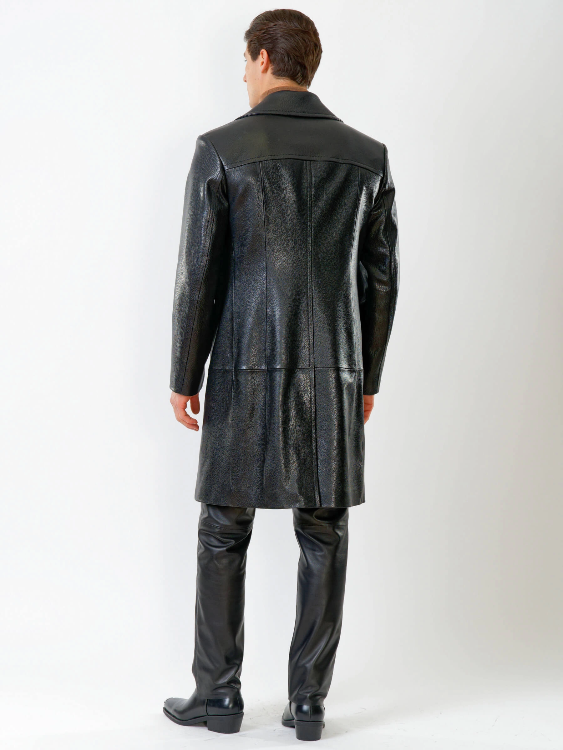 Двубортный кожаный плащ полуприлегающего силуэта с широкими лацканами и высокой шлицей- однозначно для тех, кто привык сочетать стиль и комфорт одновременно. Изделие выполнили из мягкой мелкозернистой кожи премиум класса. Безупречная посадка по фигуре. Предусмотрены боковые и внутренние застёгивающиеся карманы для документов. Прекрасное сочетание как со свободной одеждой, так и со строгим деловым костюмом.