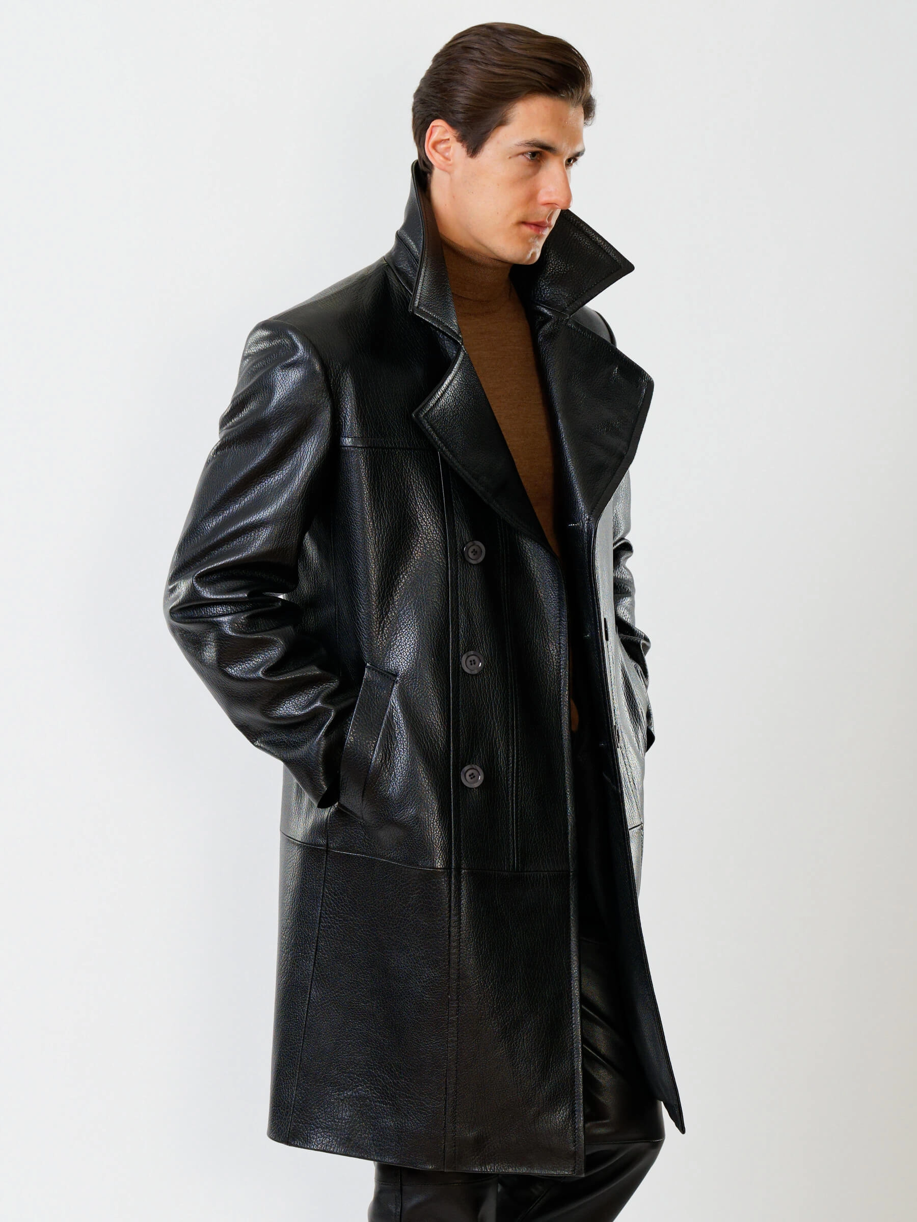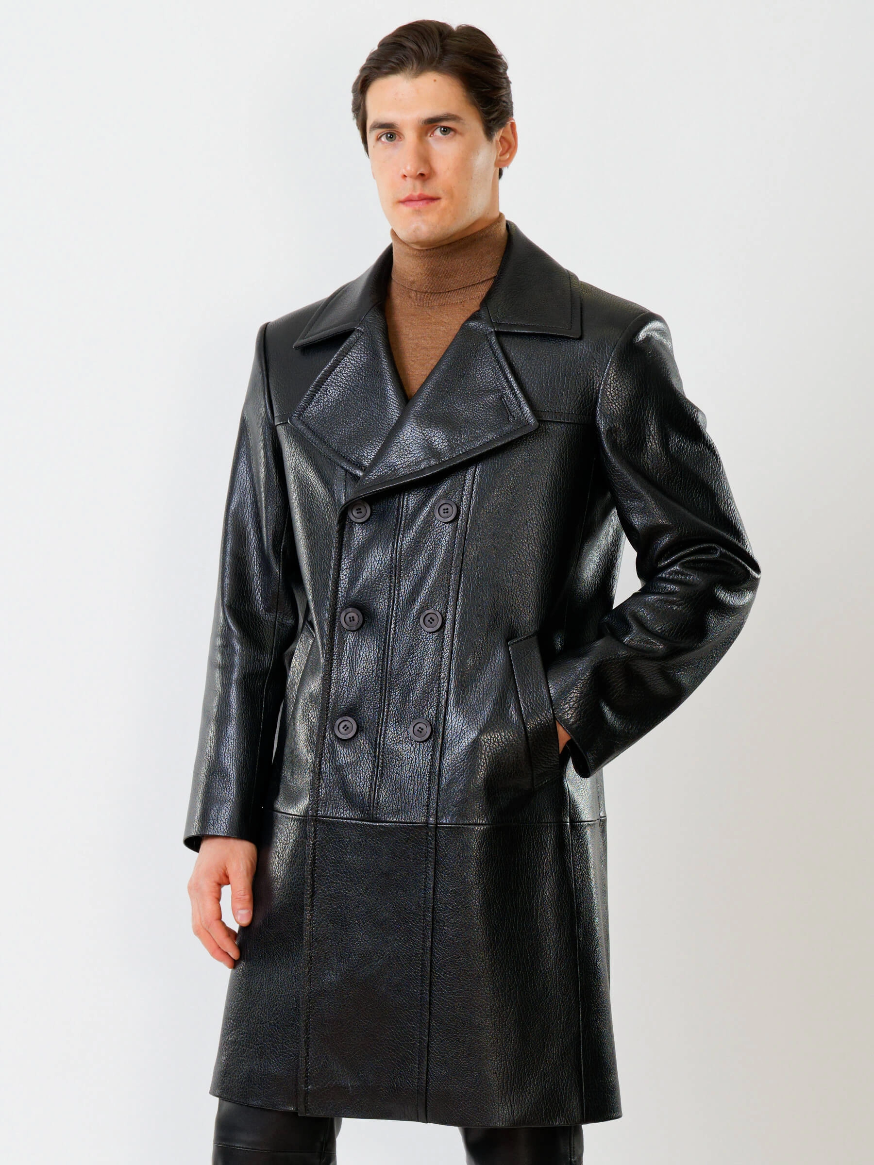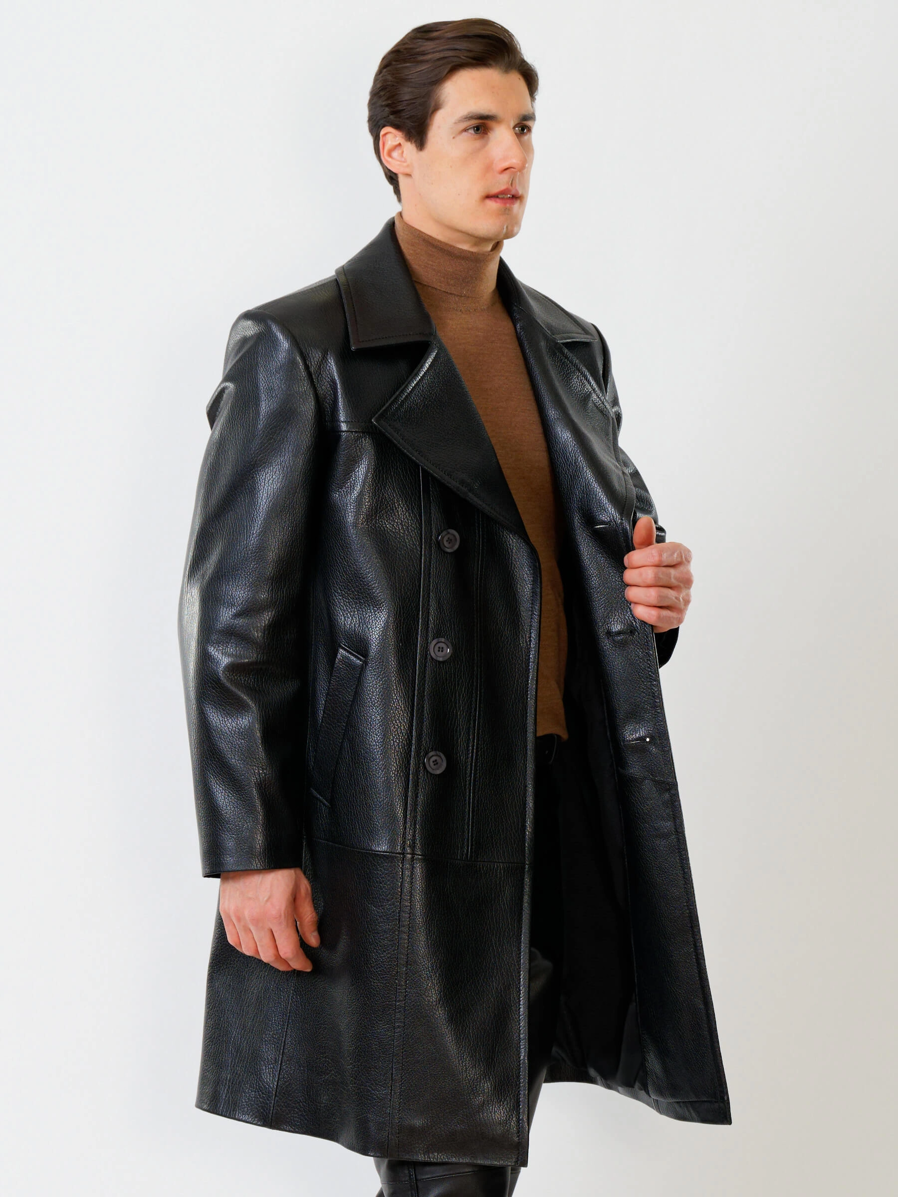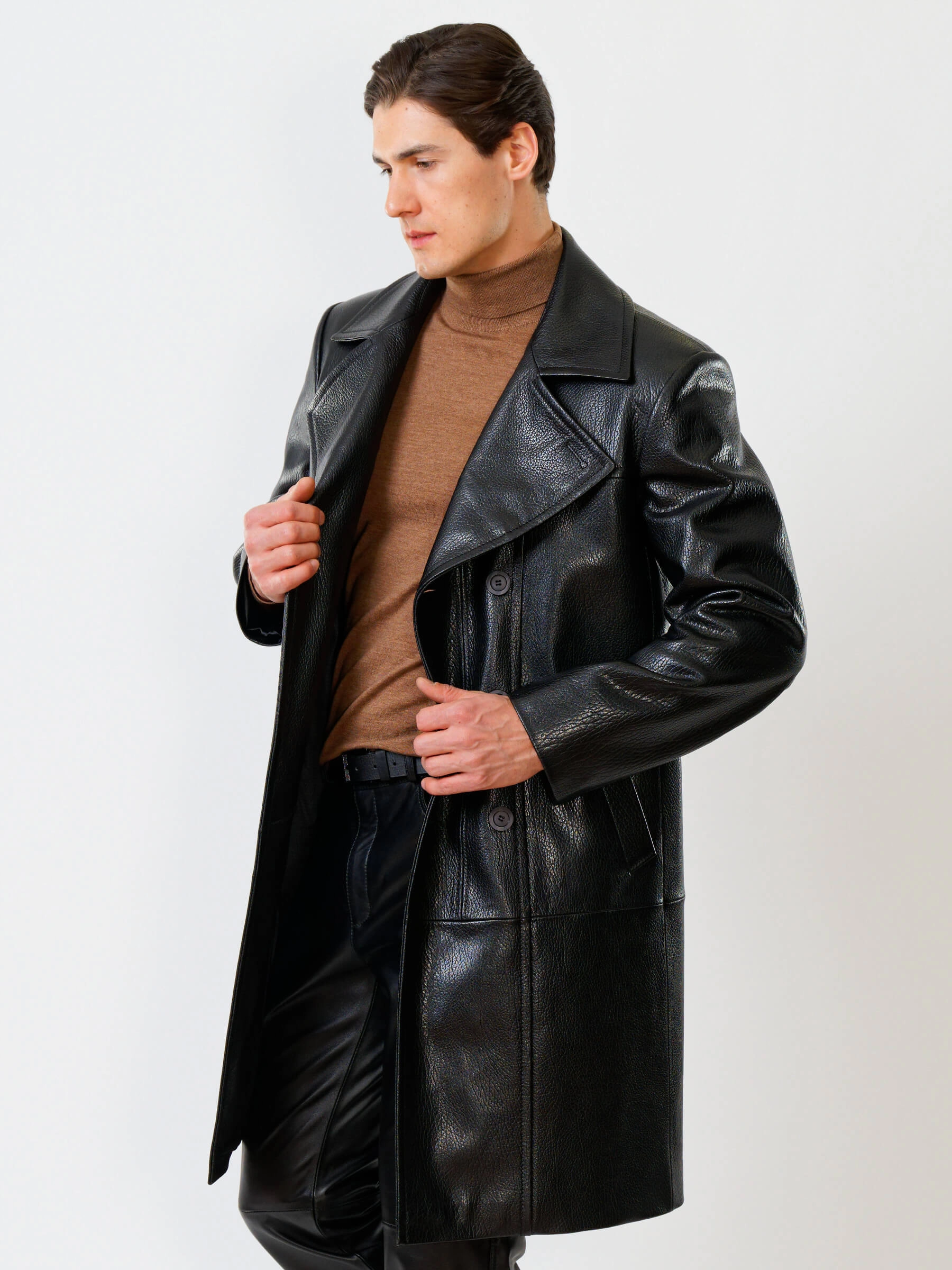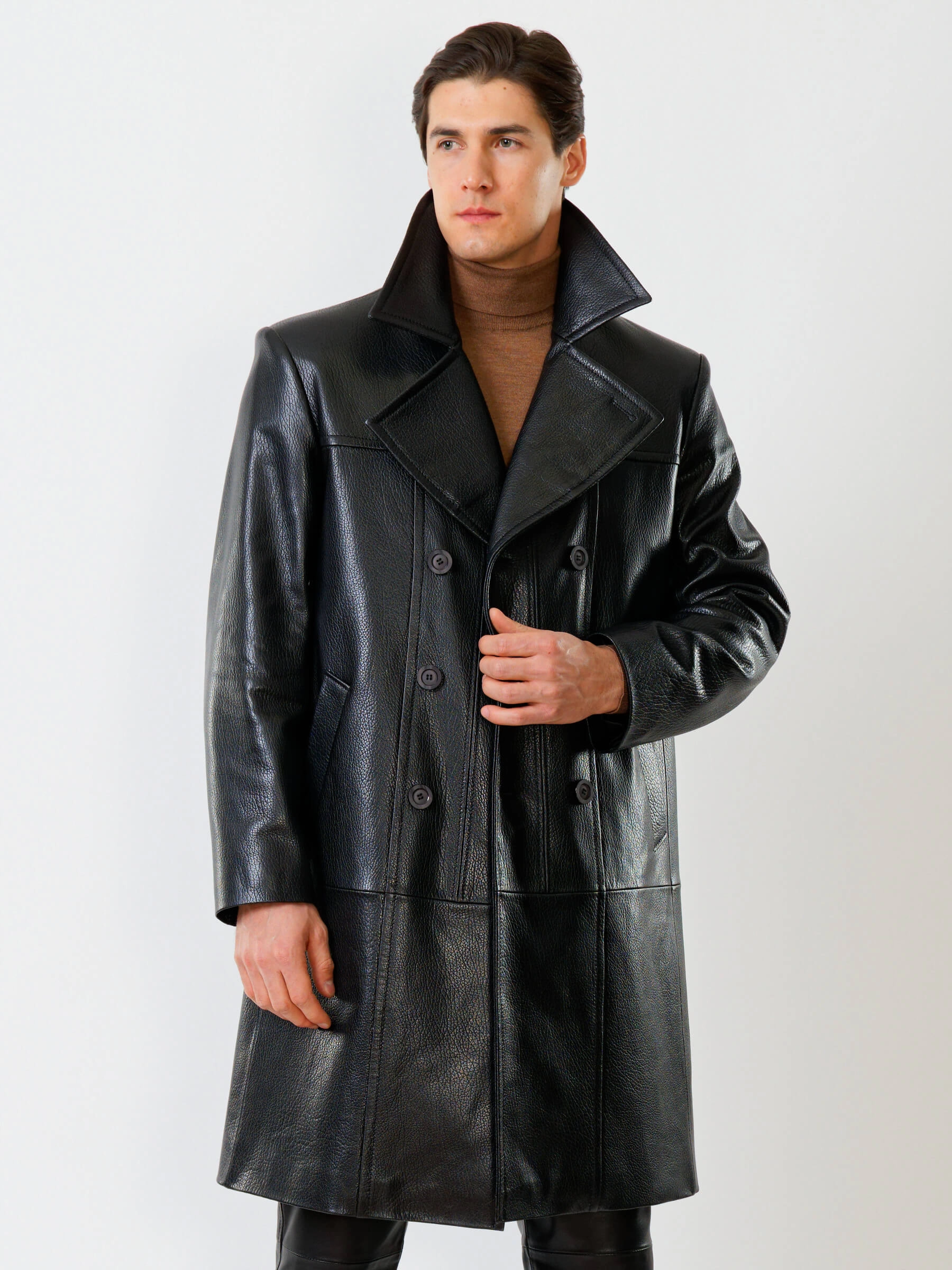 Товар двубортный мужской кожаный плащ премиум класса чикаго, черный, размер 48, артикул 21121 выполнен из натуральной кожи с застежкой пуговицы. Рассчитан на сезон: демисезон. Длина изделия 110 см, силуэт полуприлегающий.