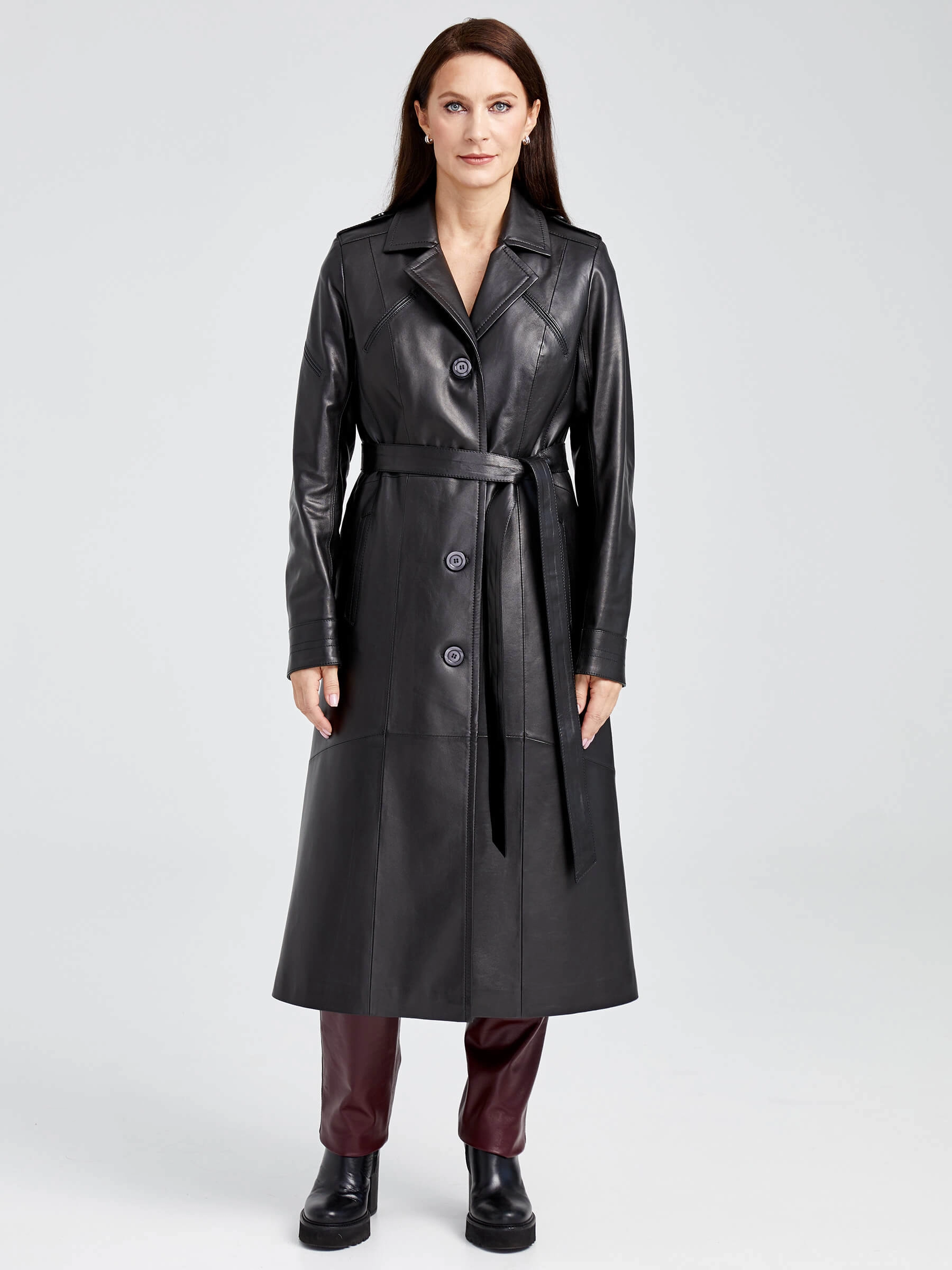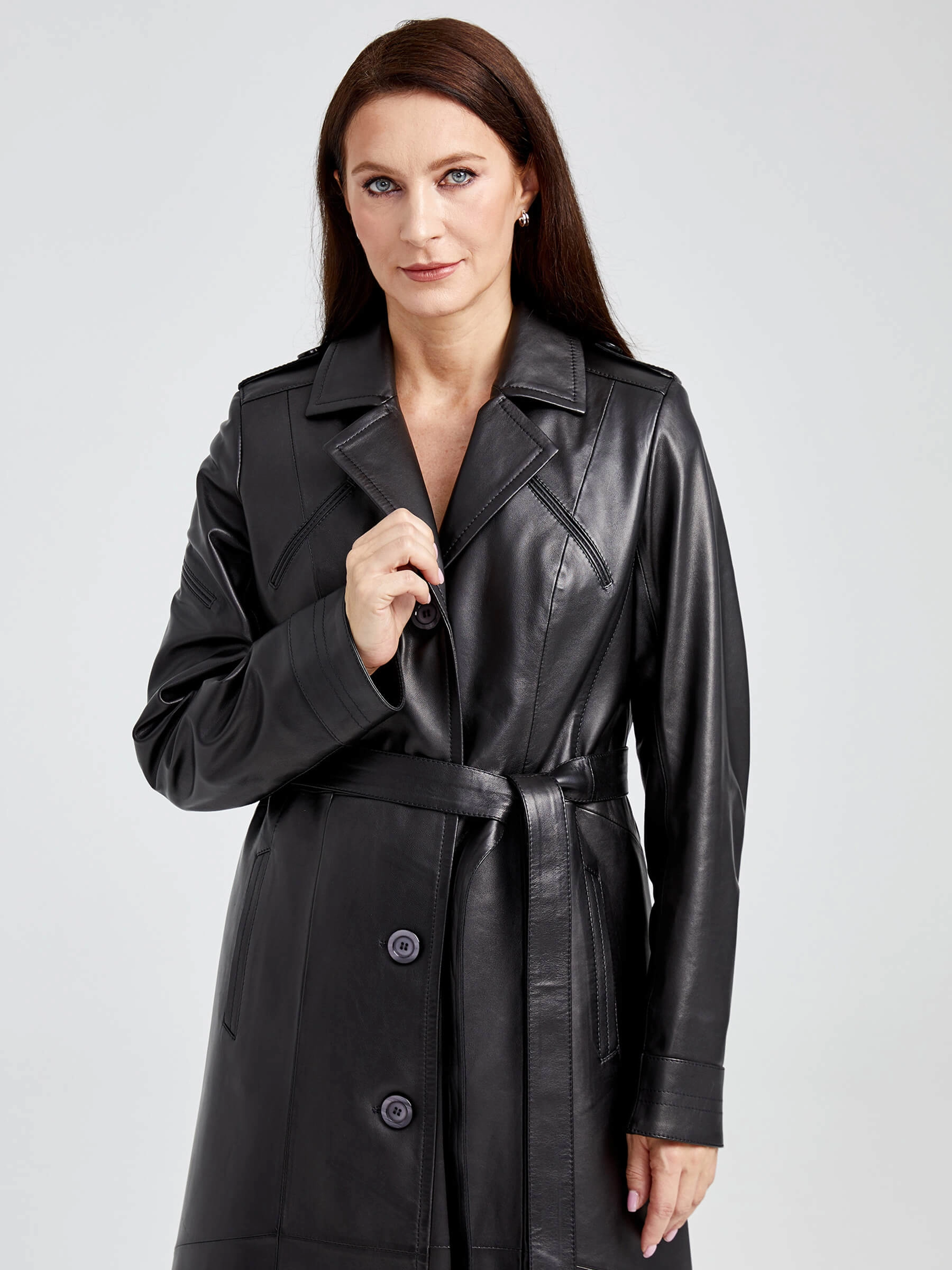 Товар классический кожаный женский плащ с поясом 3010, черный, размер 46, артикул 91641 выполнен из натуральной кожи с застежкой пуговицы. Рассчитан на сезон: демисезон. Длина изделия 116 см, силуэт полуприлегающий.