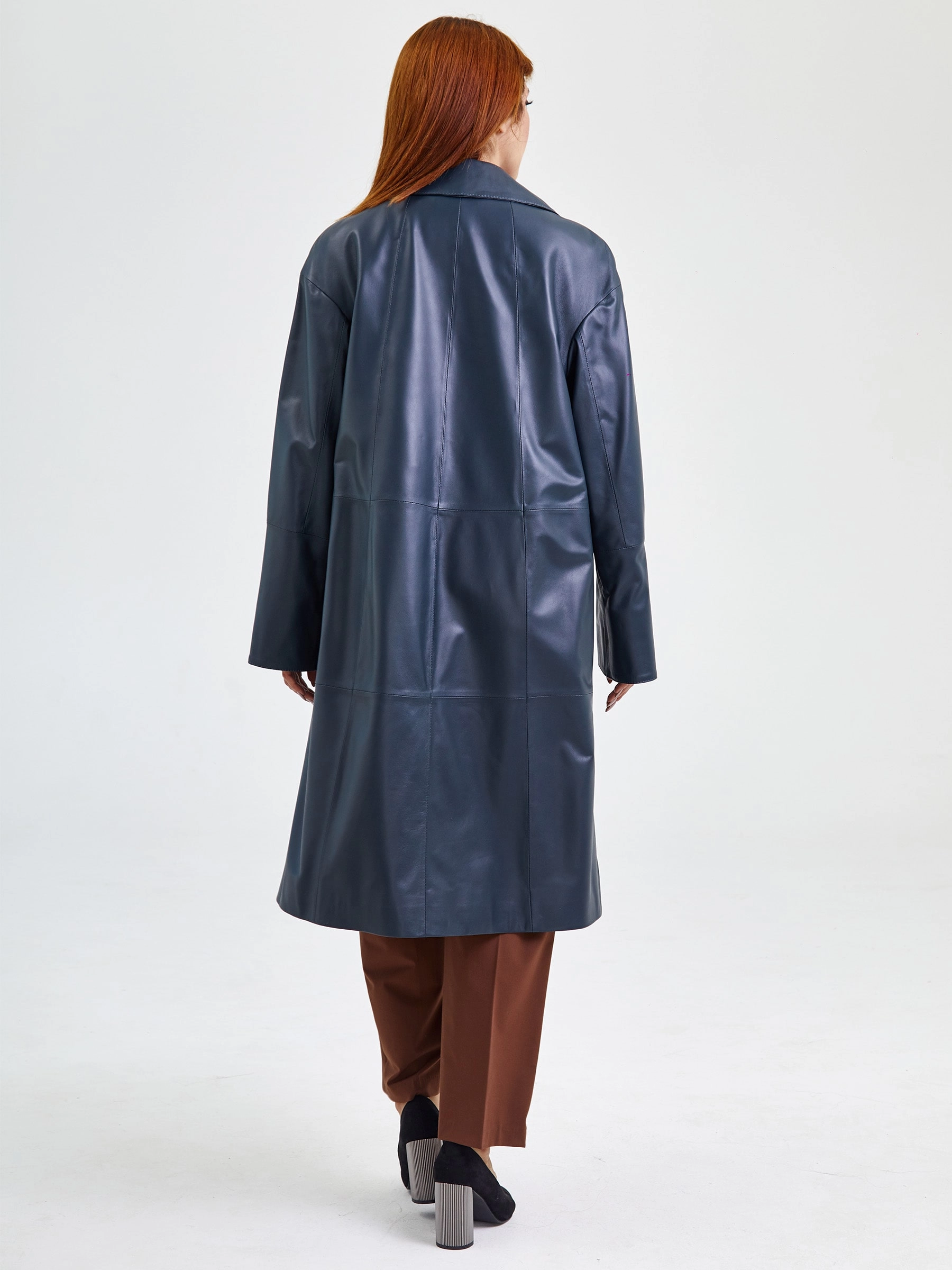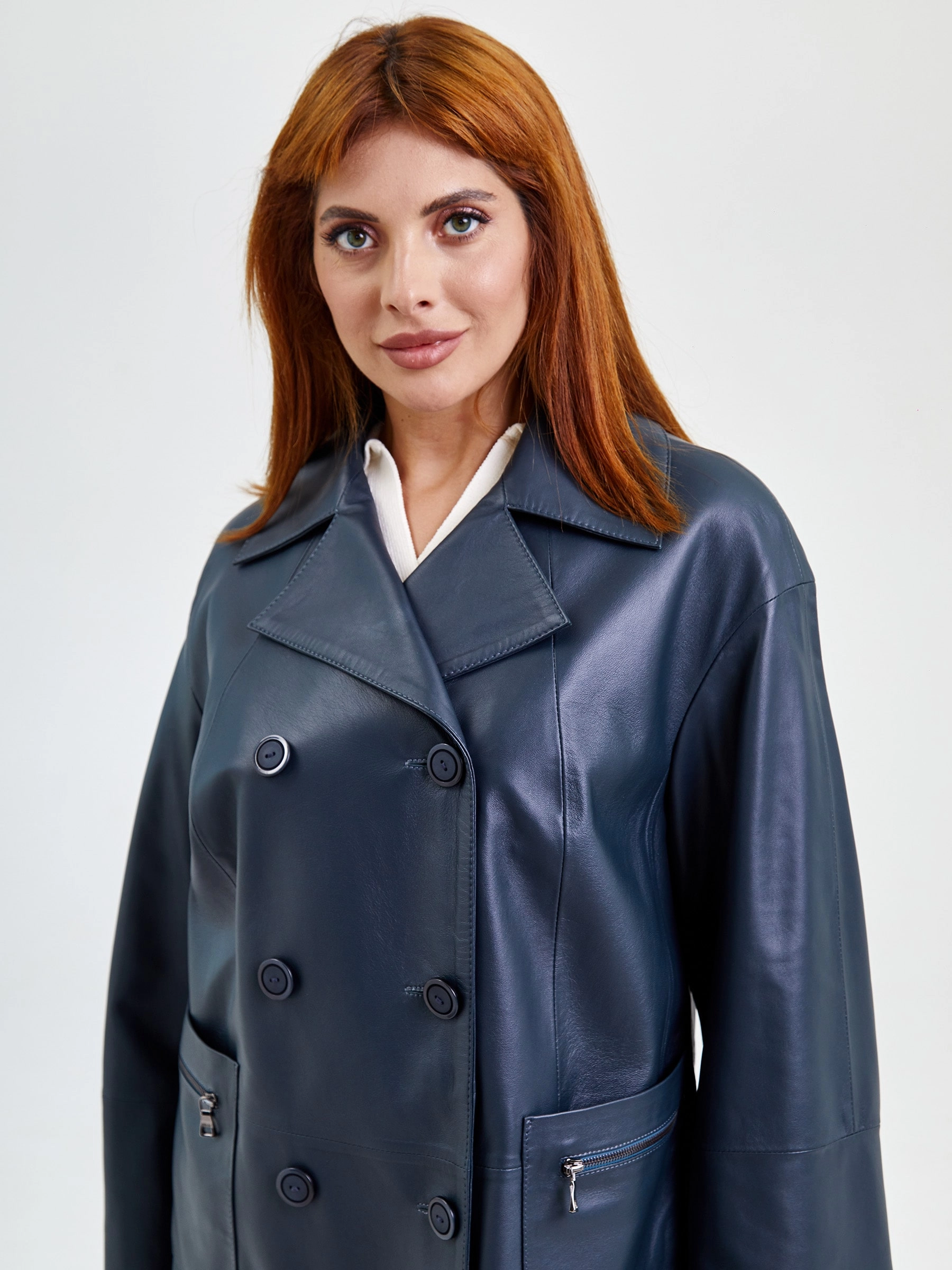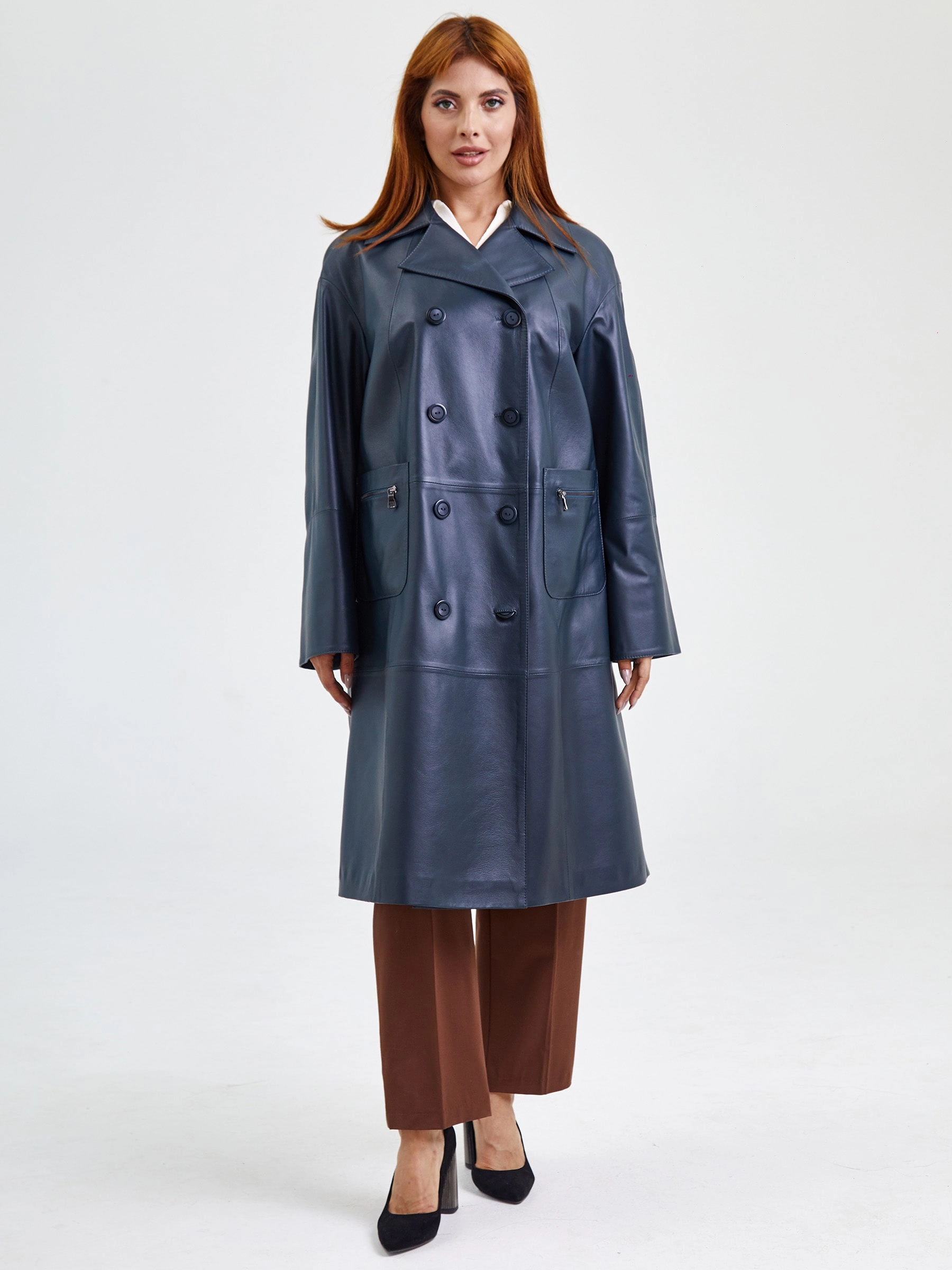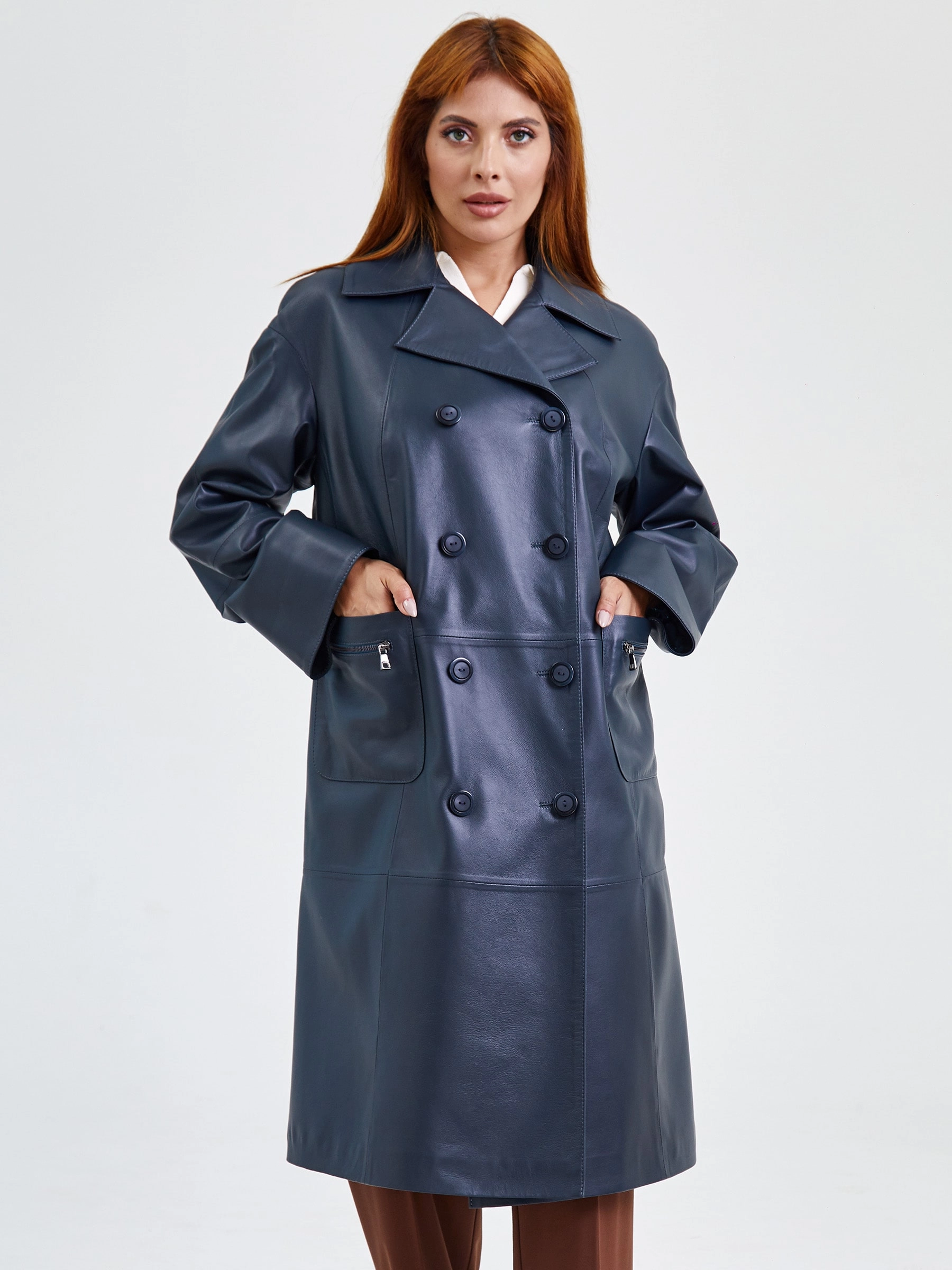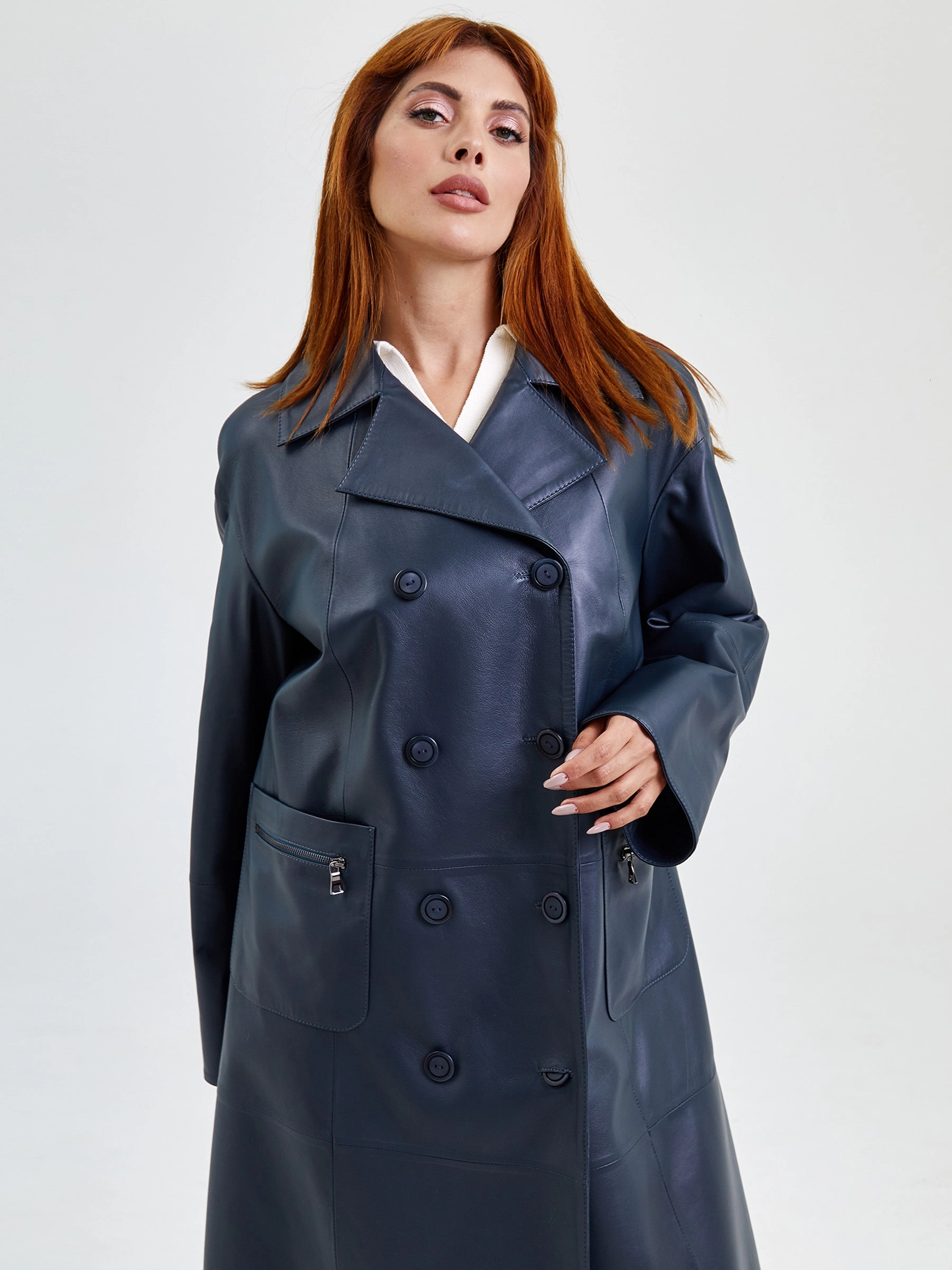 Длинный женский плащ из мягкой гладкой кожи: свободный силуэт и классический двубортный крой на пуговицах создают элегантную небрежность премиум-класса. Английский воротник, втачные рукава с регулируемыми манжетами-отворотами и стильные накладные карманы на молниях подчеркивают функциональную роскошь. Натуральная кожа высочайшего качества гарантирует долговечность и статусный вид — завершите образ объемным джемпером, прямыми брюками и ботильонами для безупречного перехода от офиса до вечера.