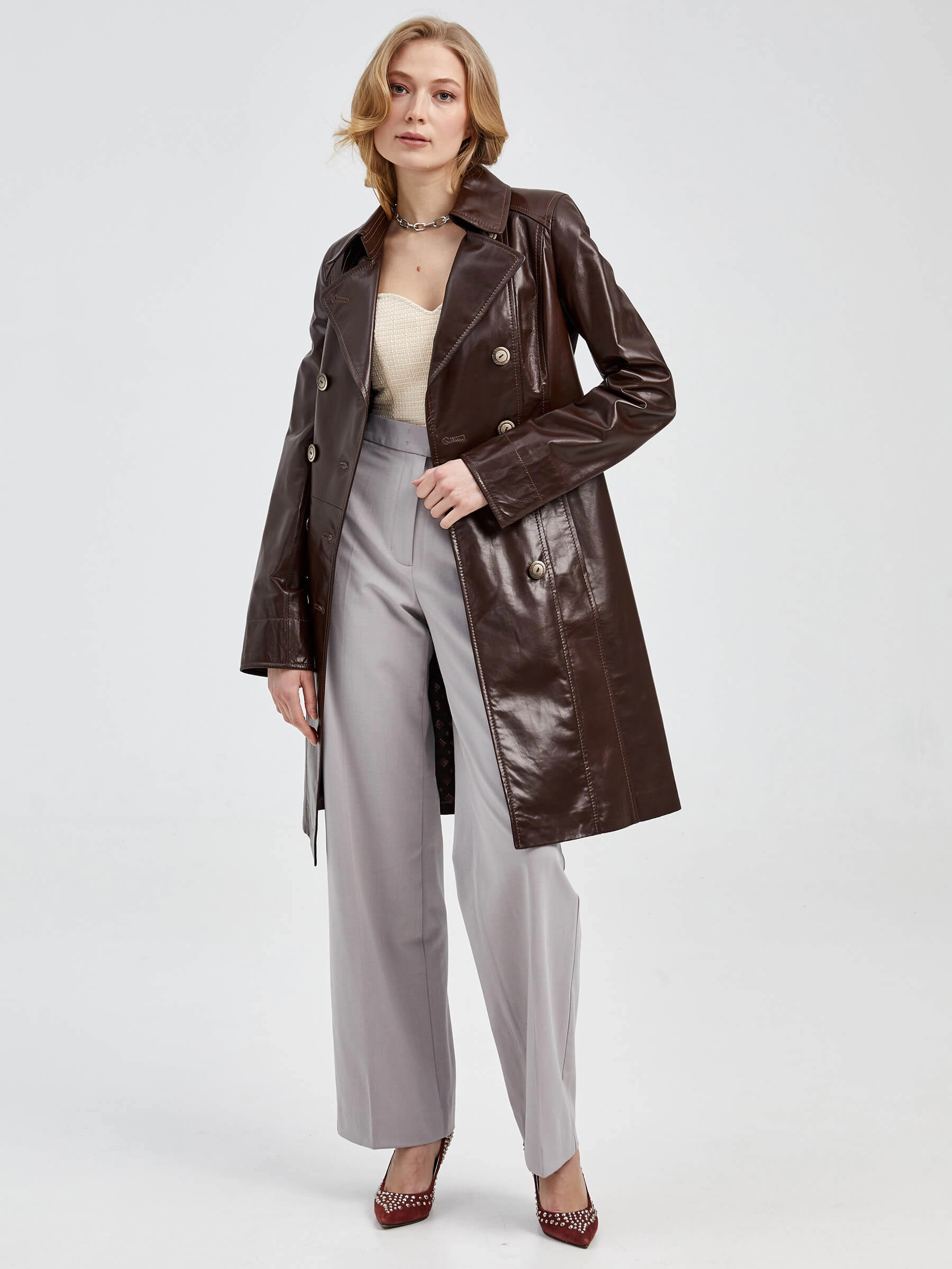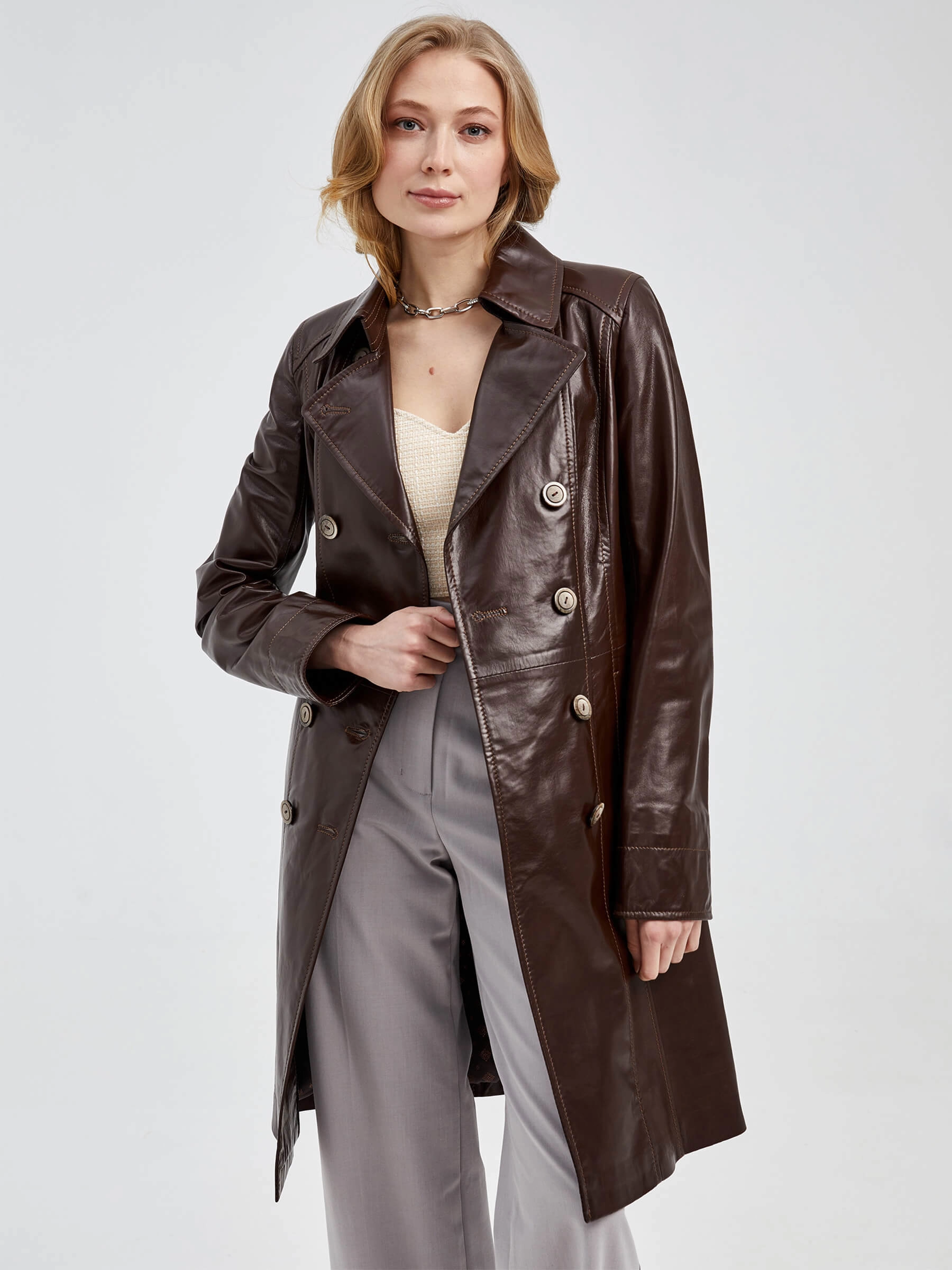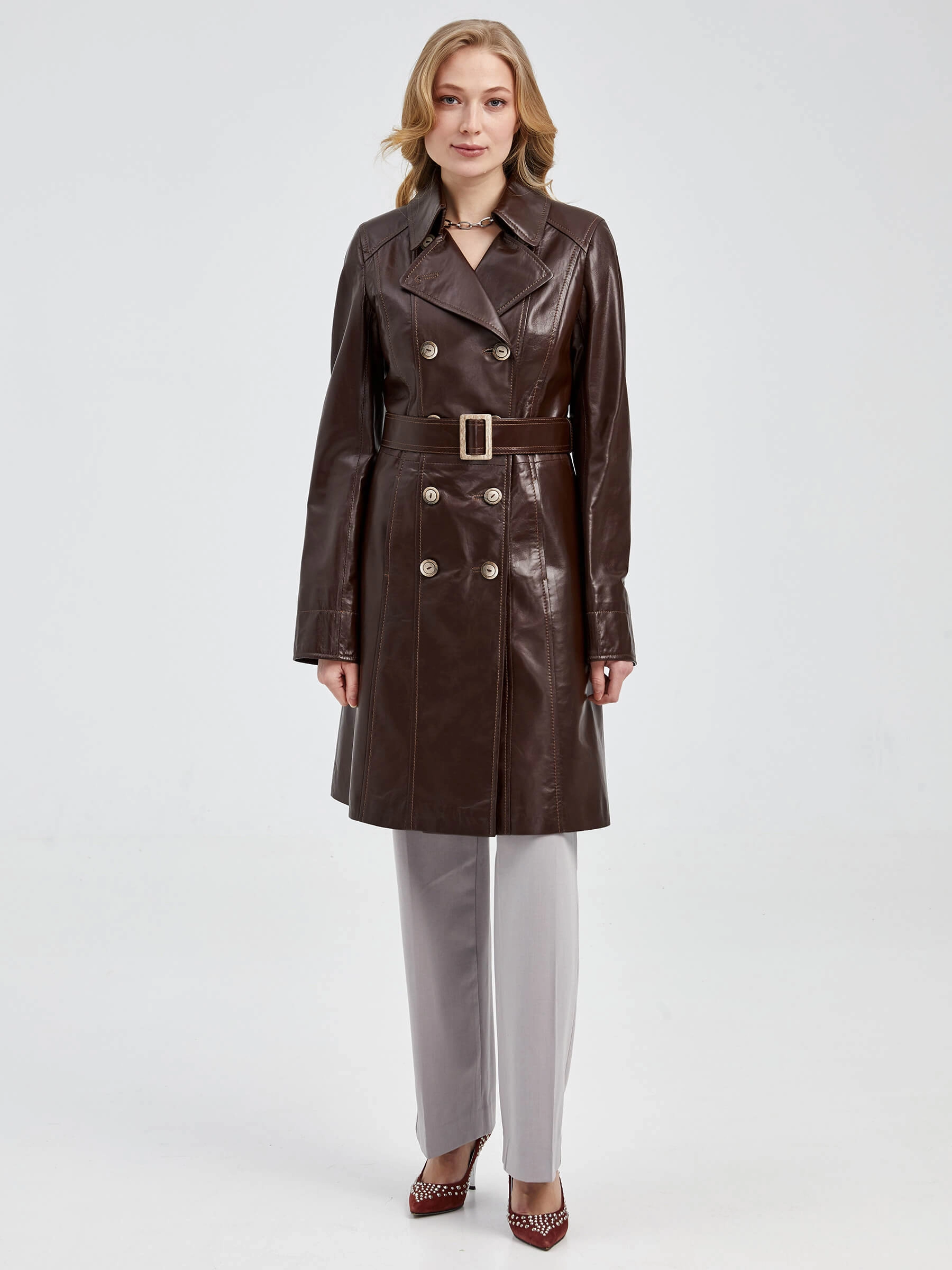 Товар двубортный кожаный женский френч с поясом 321, коричневый, размер 40, артикул 91660 выполнен из натуральной кожи с застежкой пуговицы. Рассчитан на сезон: весна-лето. Длина изделия 92 см, силуэт приталенный .