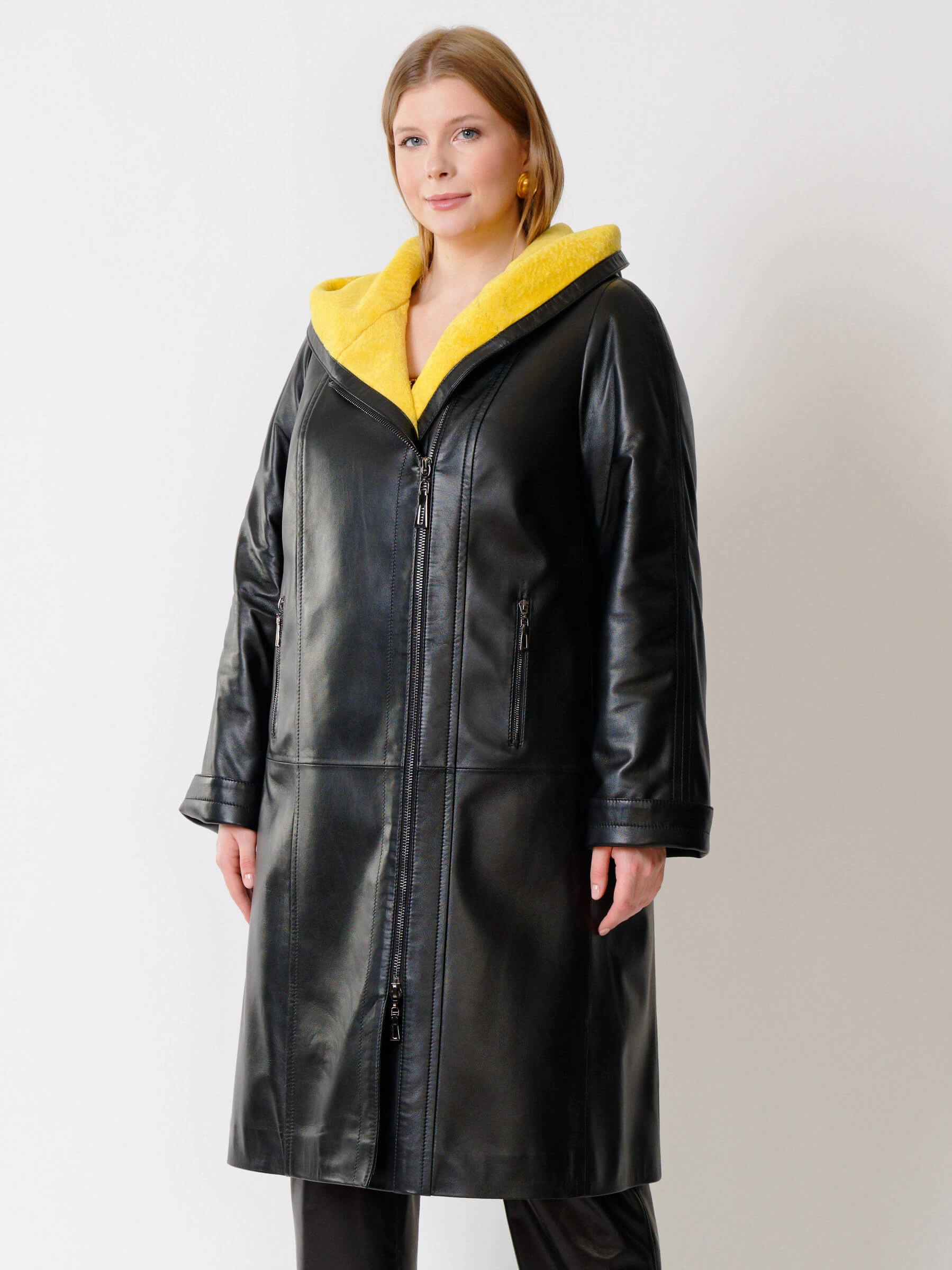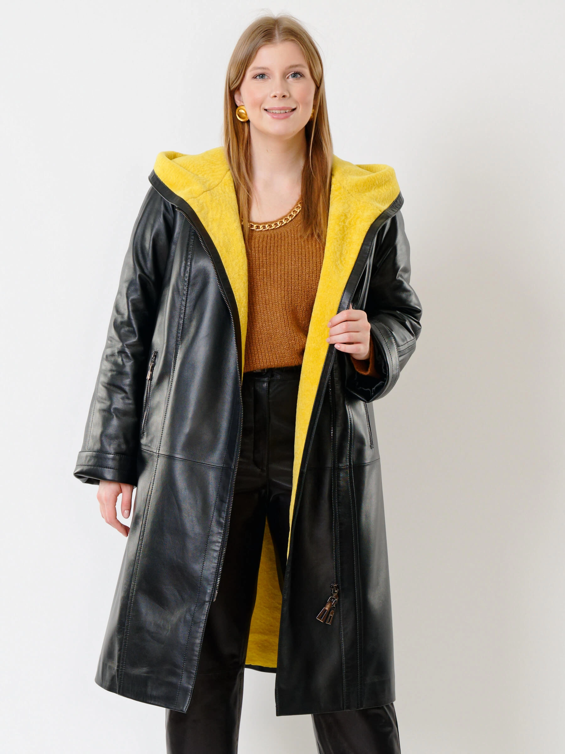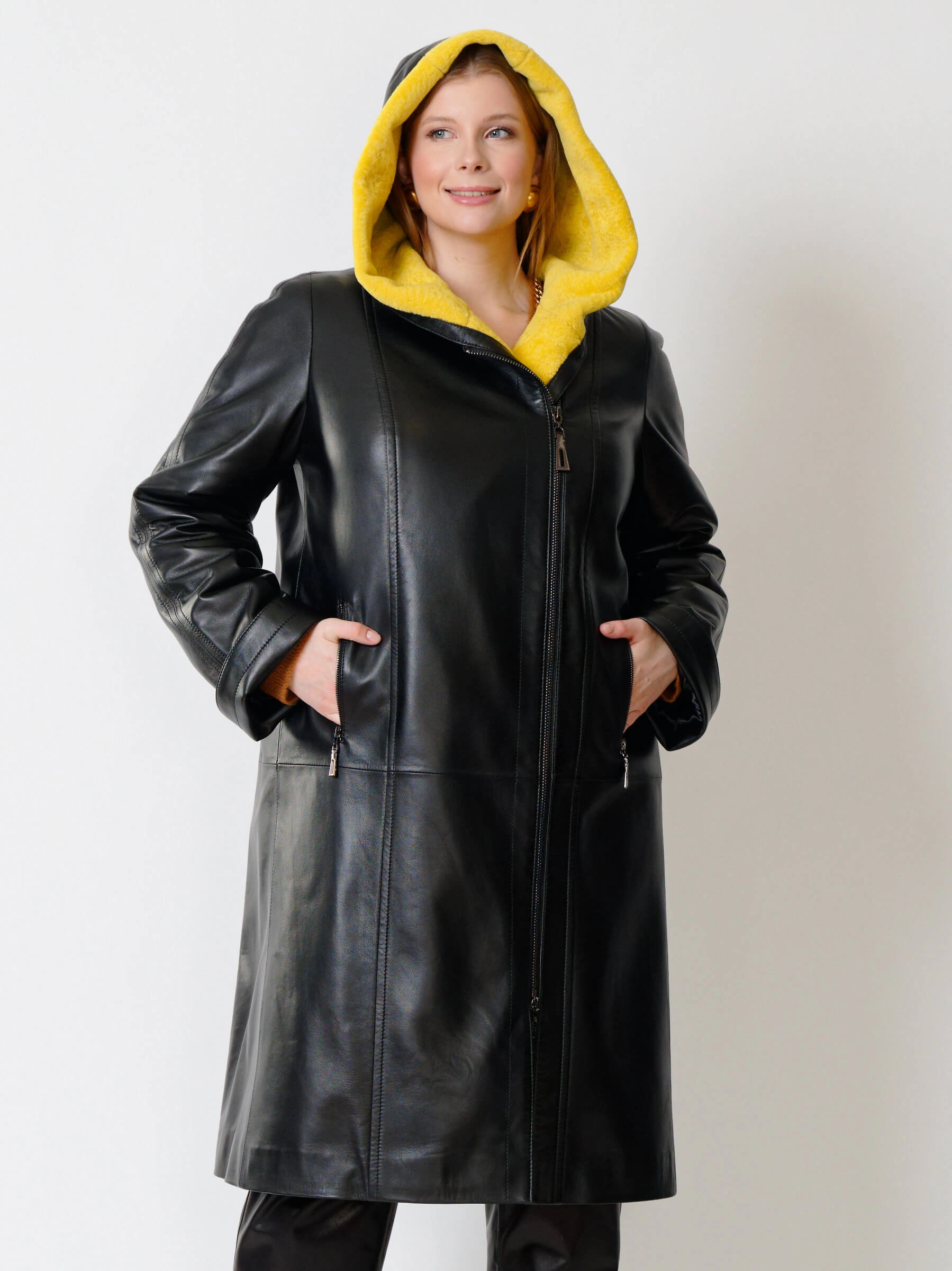 Черный утепленный кожаный плащ на молнии длиной 105 см: прямой повседневный силуэт с объемным капюшоном и яркой подкладкой из овчины астраган желтого цвета. Боковые карманы. Совет стилиста: носите с однотонными вещами, джинсами или леггинсами, дополняя кроссовками, ботильонами или высокими сапогами.