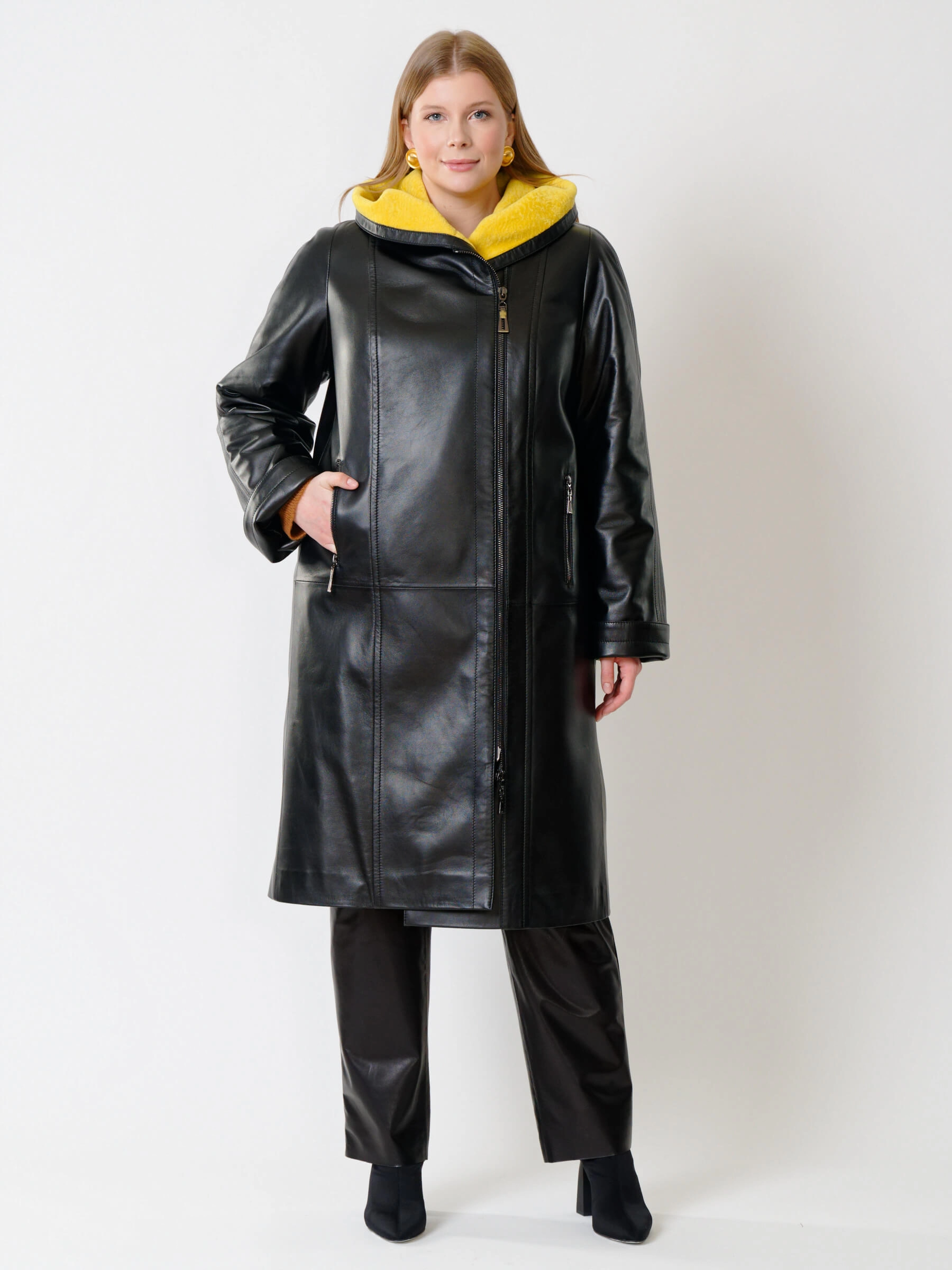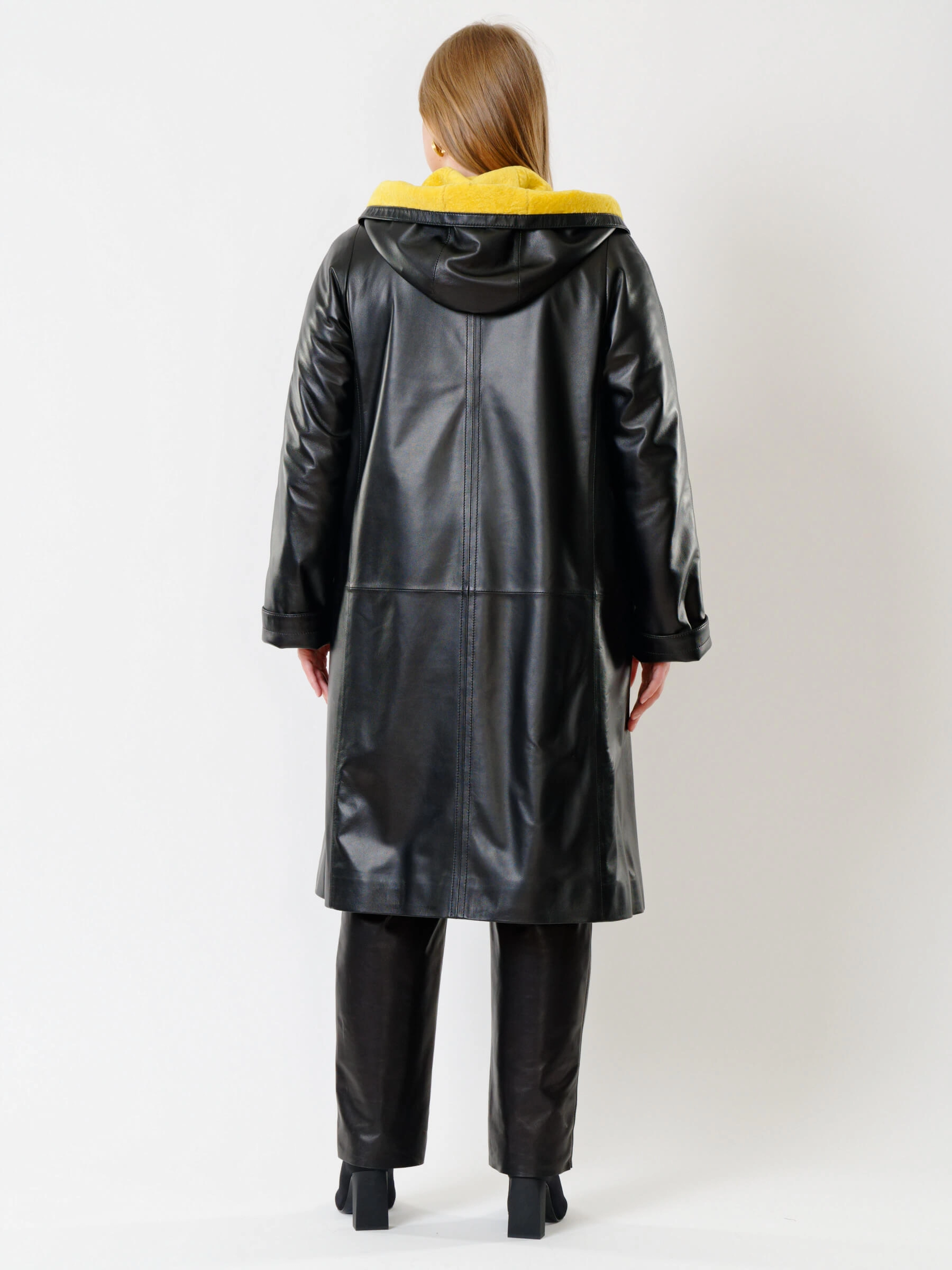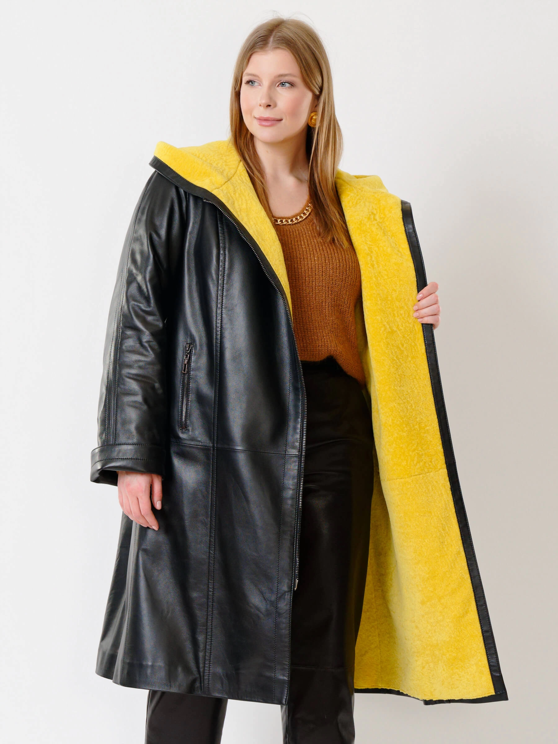 Черный утепленный кожаный плащ на молнии длиной 105 см: прямой повседневный силуэт с объемным капюшоном и яркой подкладкой из овчины астраган желтого цвета. Боковые карманы. Совет стилиста: носите с однотонными вещами, джинсами или леггинсами, дополняя кроссовками, ботильонами или высокими сапогами.