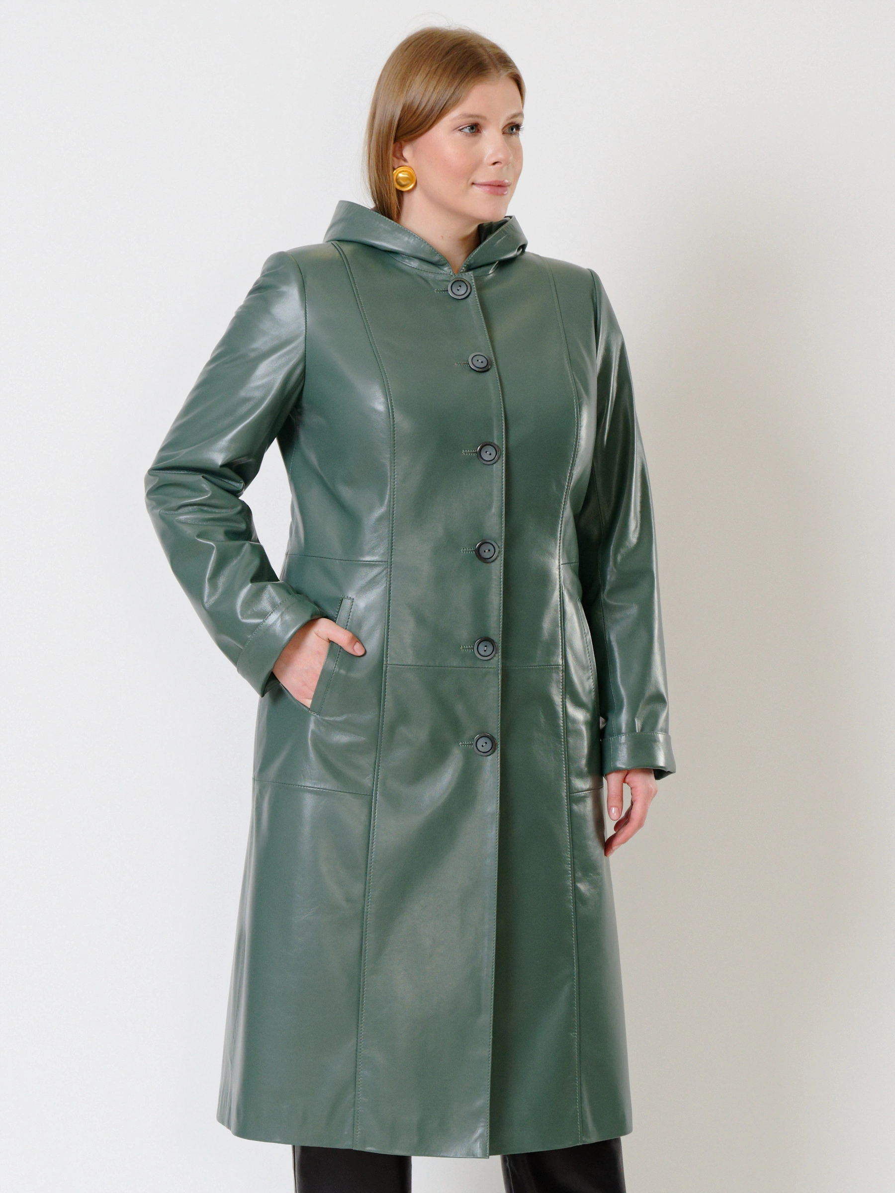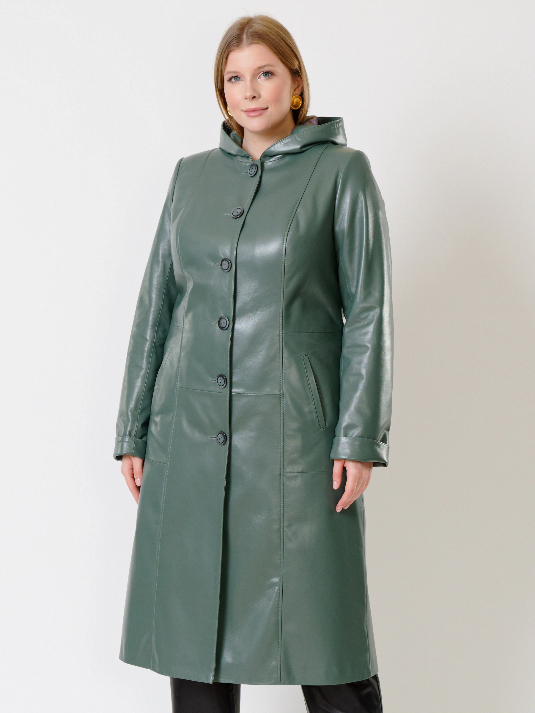 Кожаный комплект женский: Плащ утепленный 380нш + Брюки 04, оливковый/черный, р. 46, арт. 111265