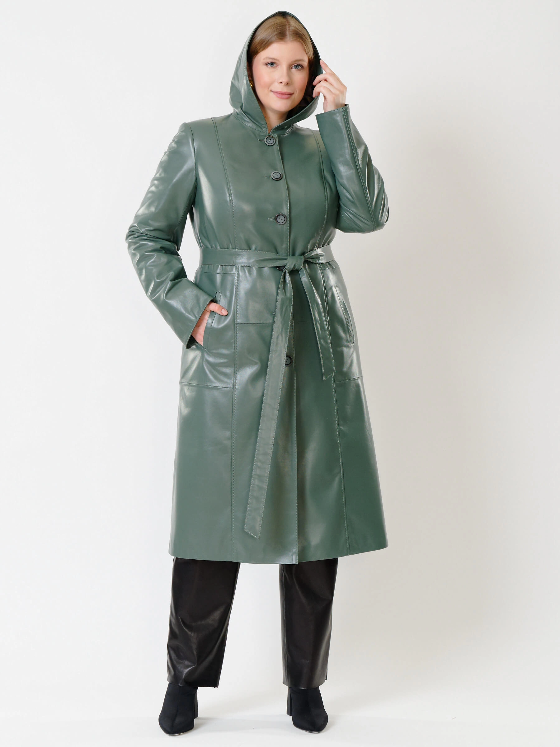 Кожаный женский утепленный плащ с капюшоном 380нш, оливковый, размер 52, артикул 91280