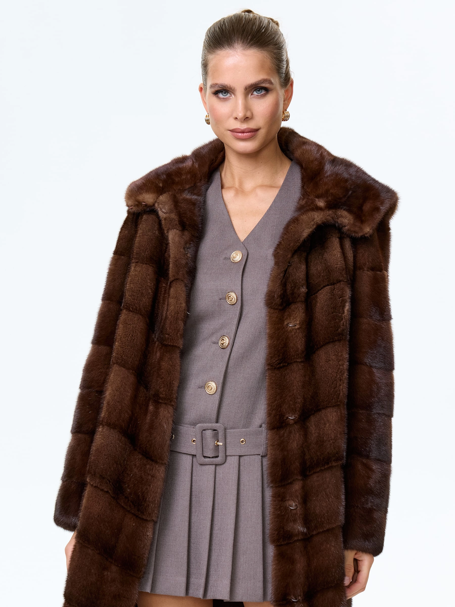 Полупальто с капюшоном из меха норки для женщин Галя(к), коричневое, размер 50, артикул 34090
