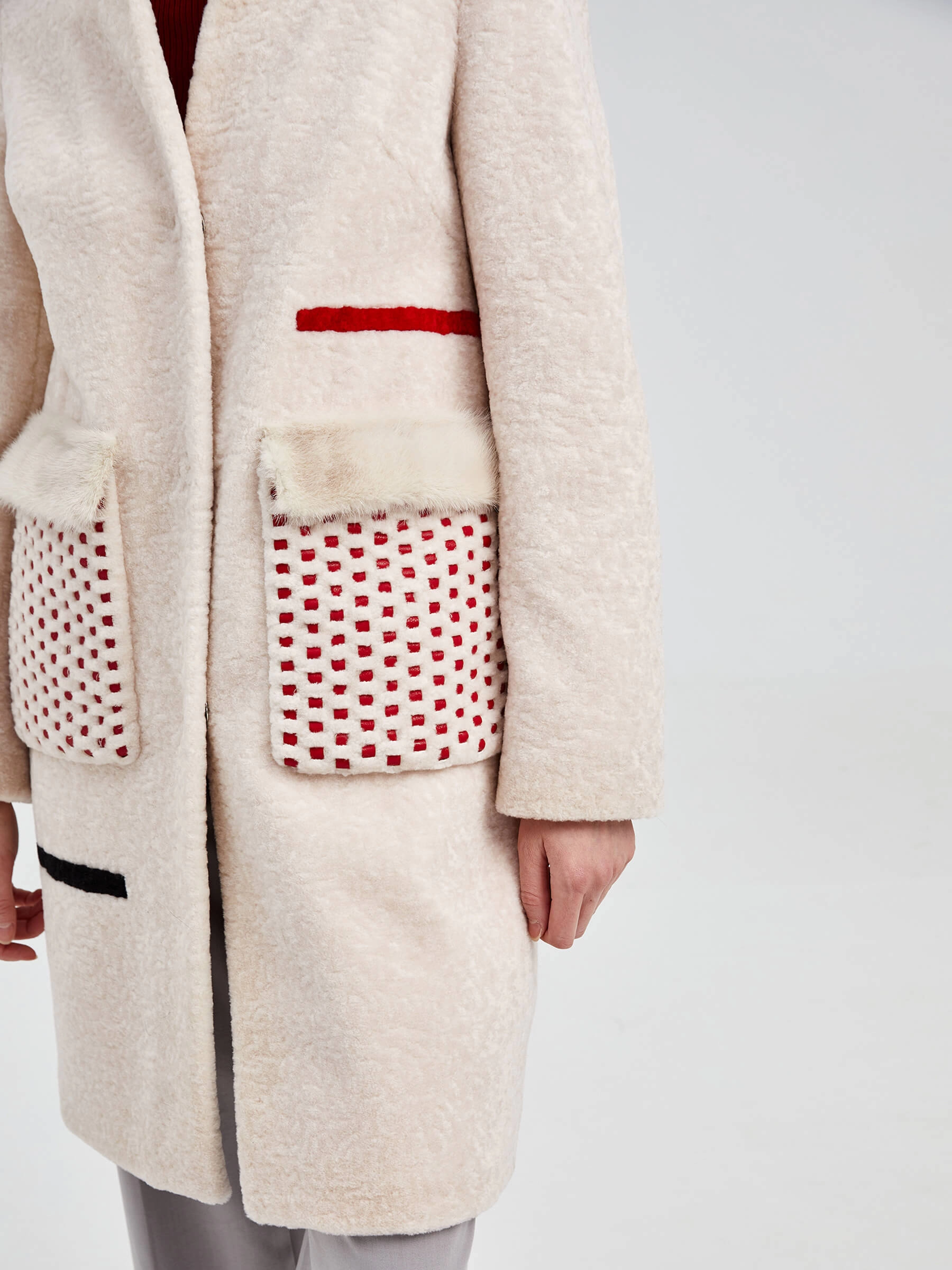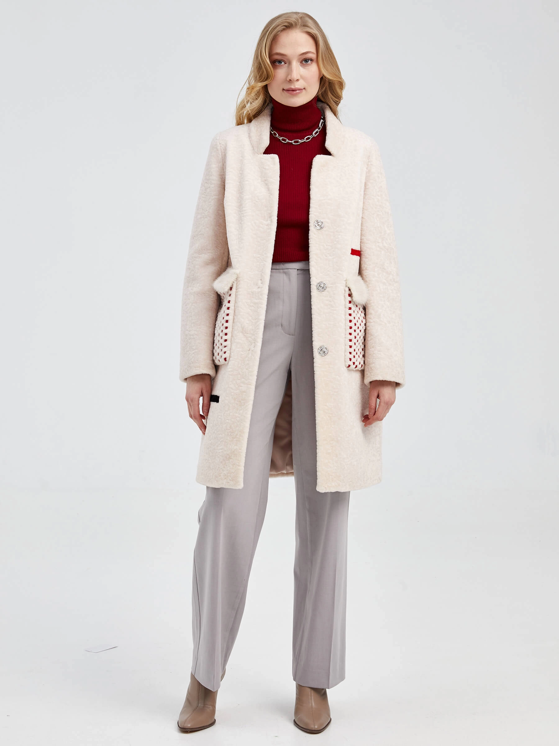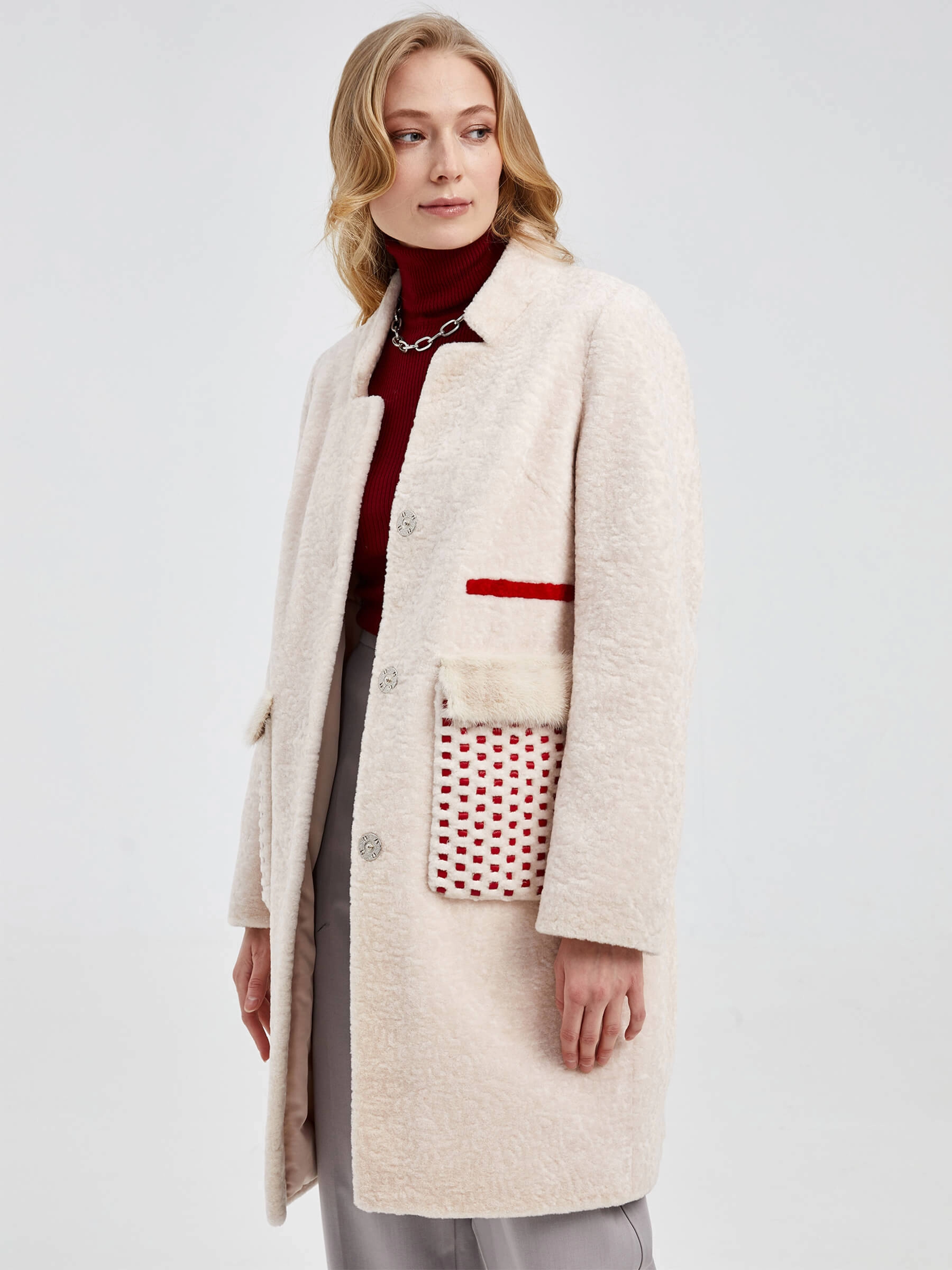 Стильное полупальто из мягкой шерсти жемчужного оттенка с прямым силуэтом и отделкой из натурального меха норки. Укороченная длина 75-90 см, крупные накладные карманы с кожаными вставками и застёжка на кнопках формируют универсальный образ. Низкая стойка воротника добавляет лаконичности — сочетайте его с кожаными брюками и ботинками на платформе для дерзкого образа или с джинсами-скинни и кроссовками для повседневного стиля.