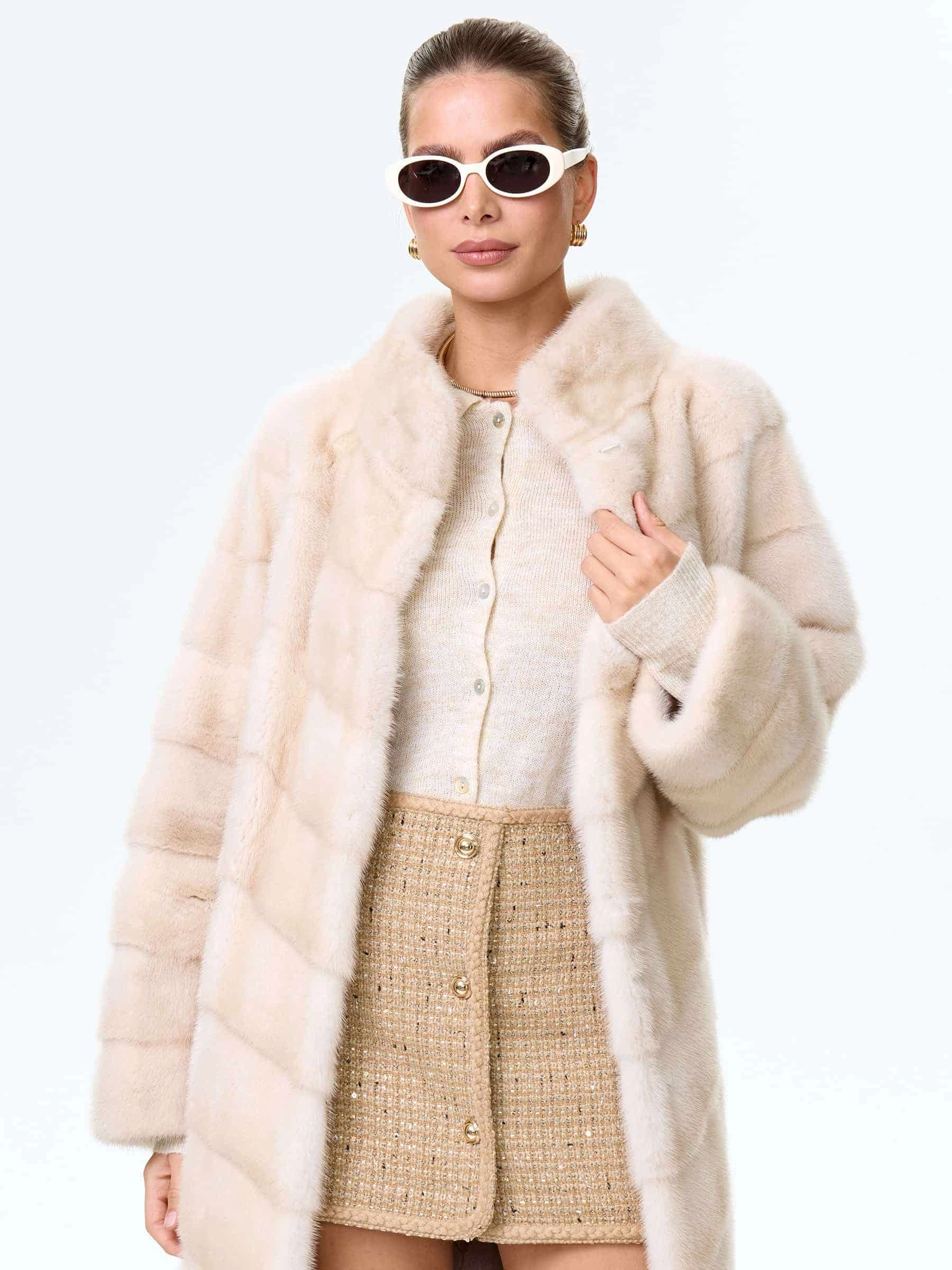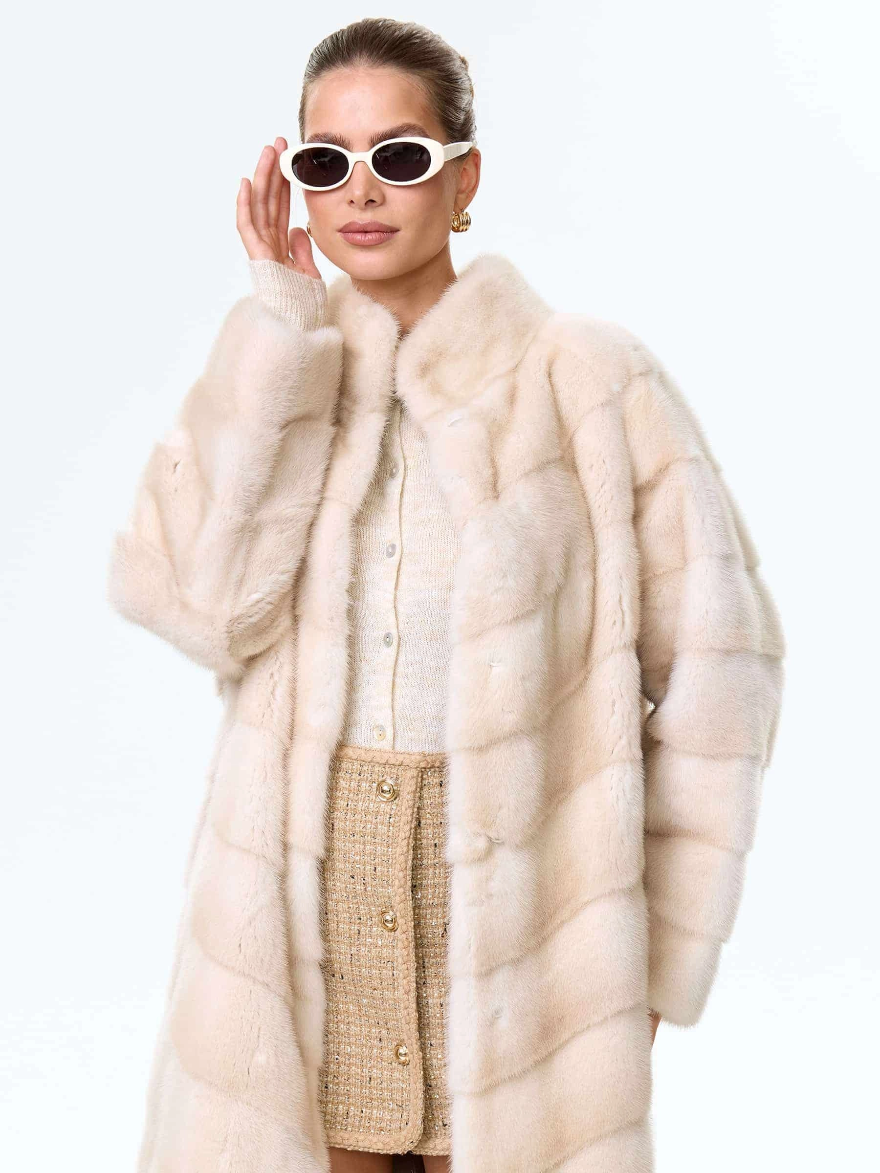 Поперечная женская норковая шуба премиум класса София(с), жемчужная, размер 50, артикул 34110