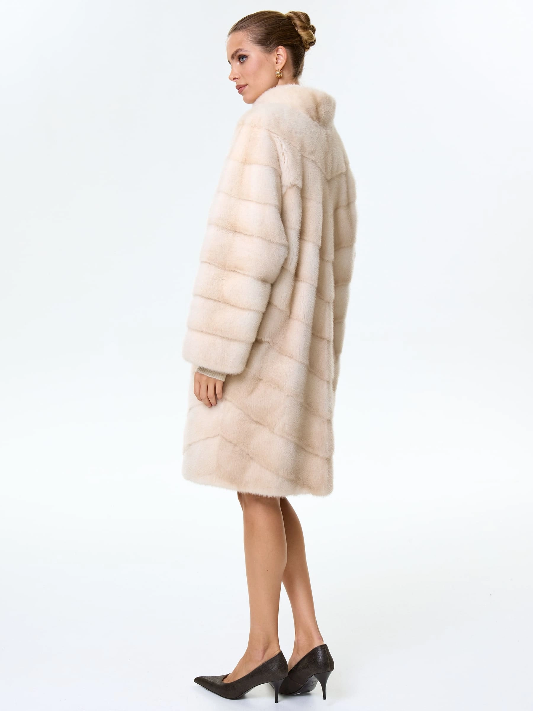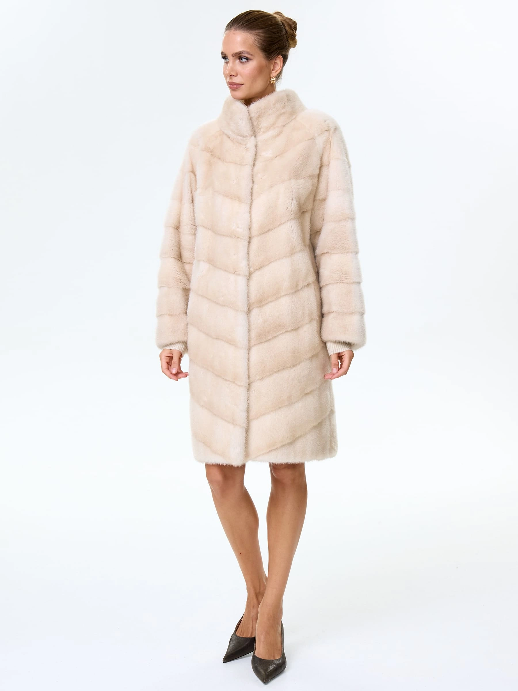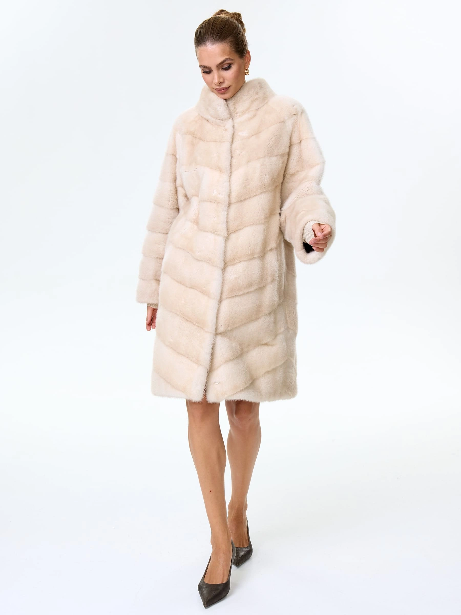 Товар поперечная женская норковая шуба премиум класса софия(с), жемчужная, размер 50, артикул 34110 выполнен из норка с застежкой клипсы. Рассчитан на сезон: зима. Длина изделия 98 см, силуэт прямой.