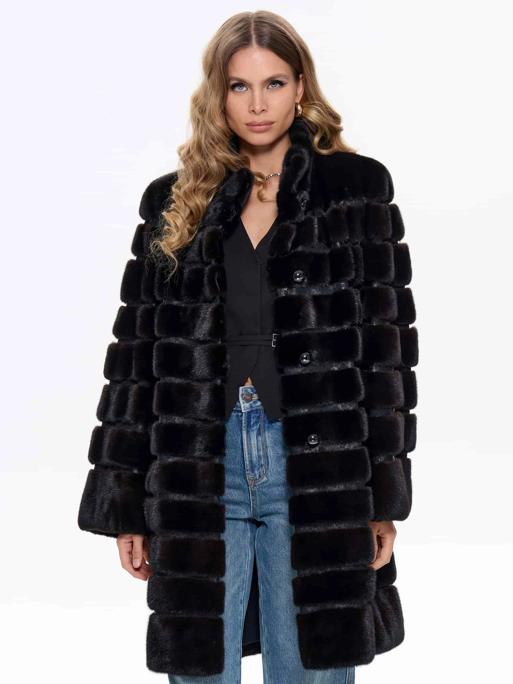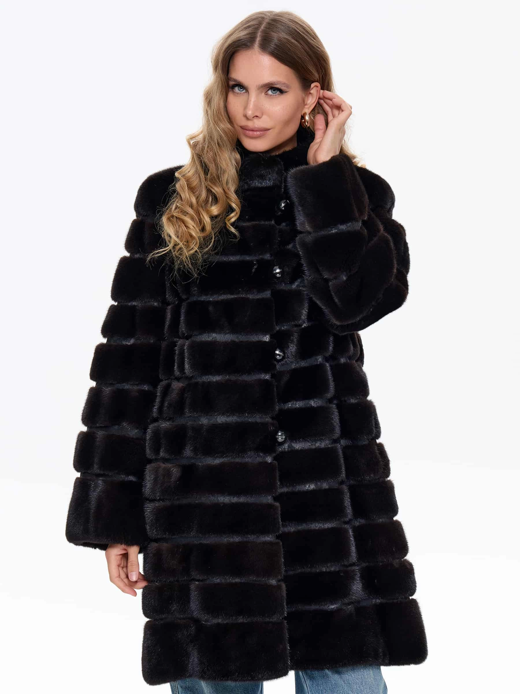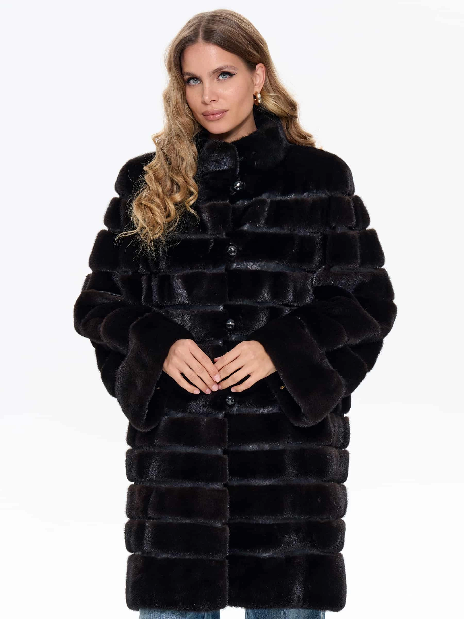 Товар поперечная женская шуба из меха норки braschi elm 047, черная, размер 46, артикул 34430 выполнен из норка с застежкой пуговицы. Рассчитан на сезон: зима. Длина изделия 90 см, силуэт прямой.