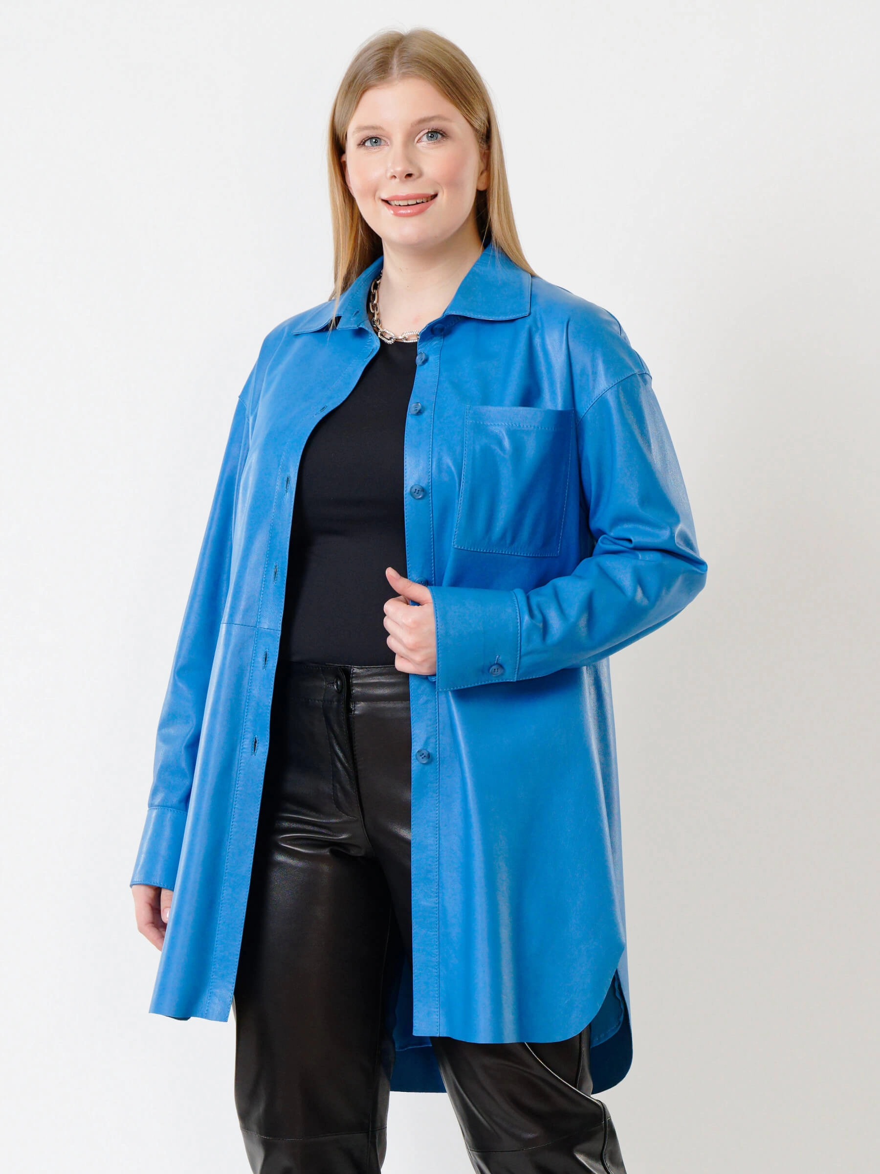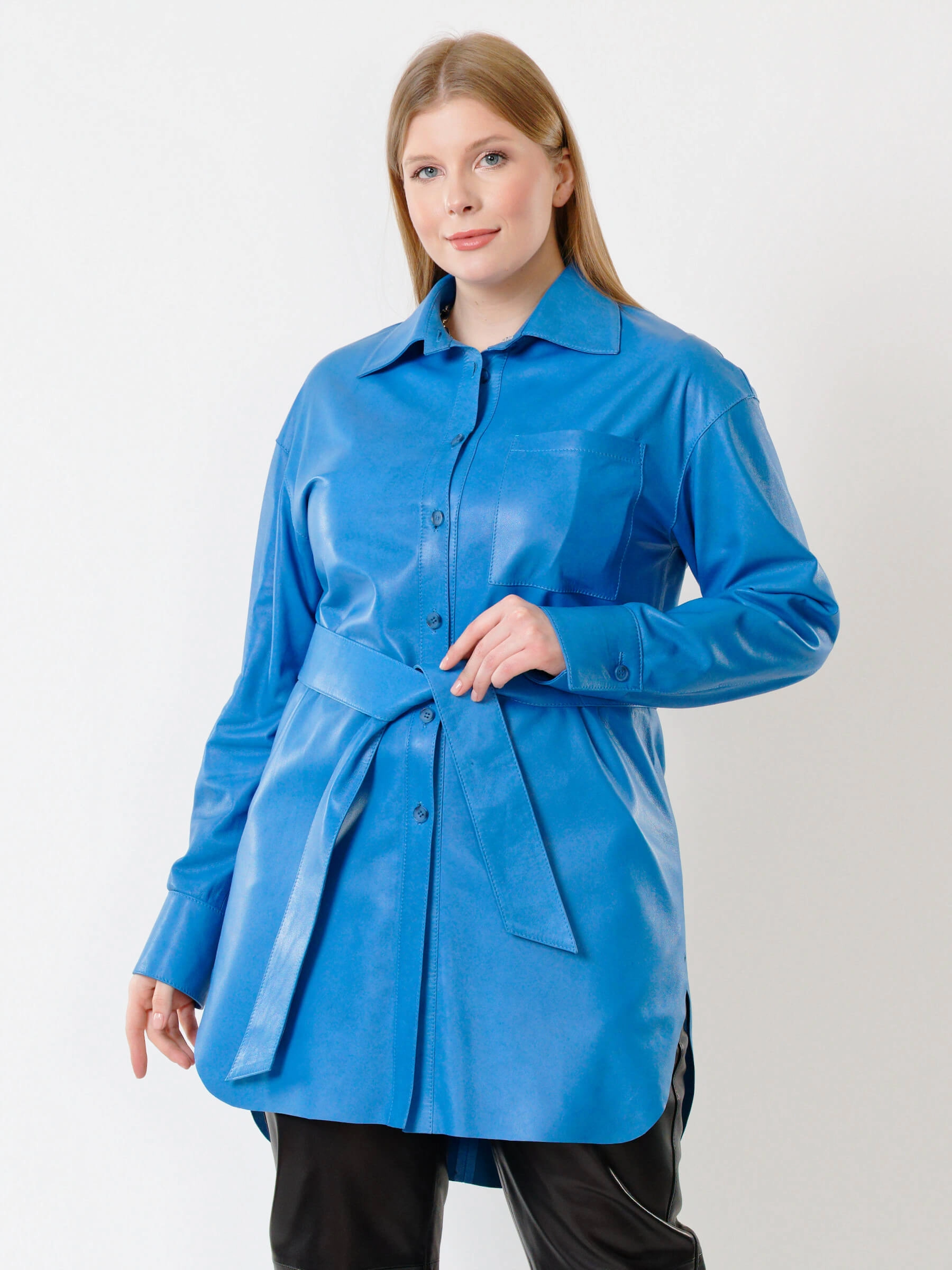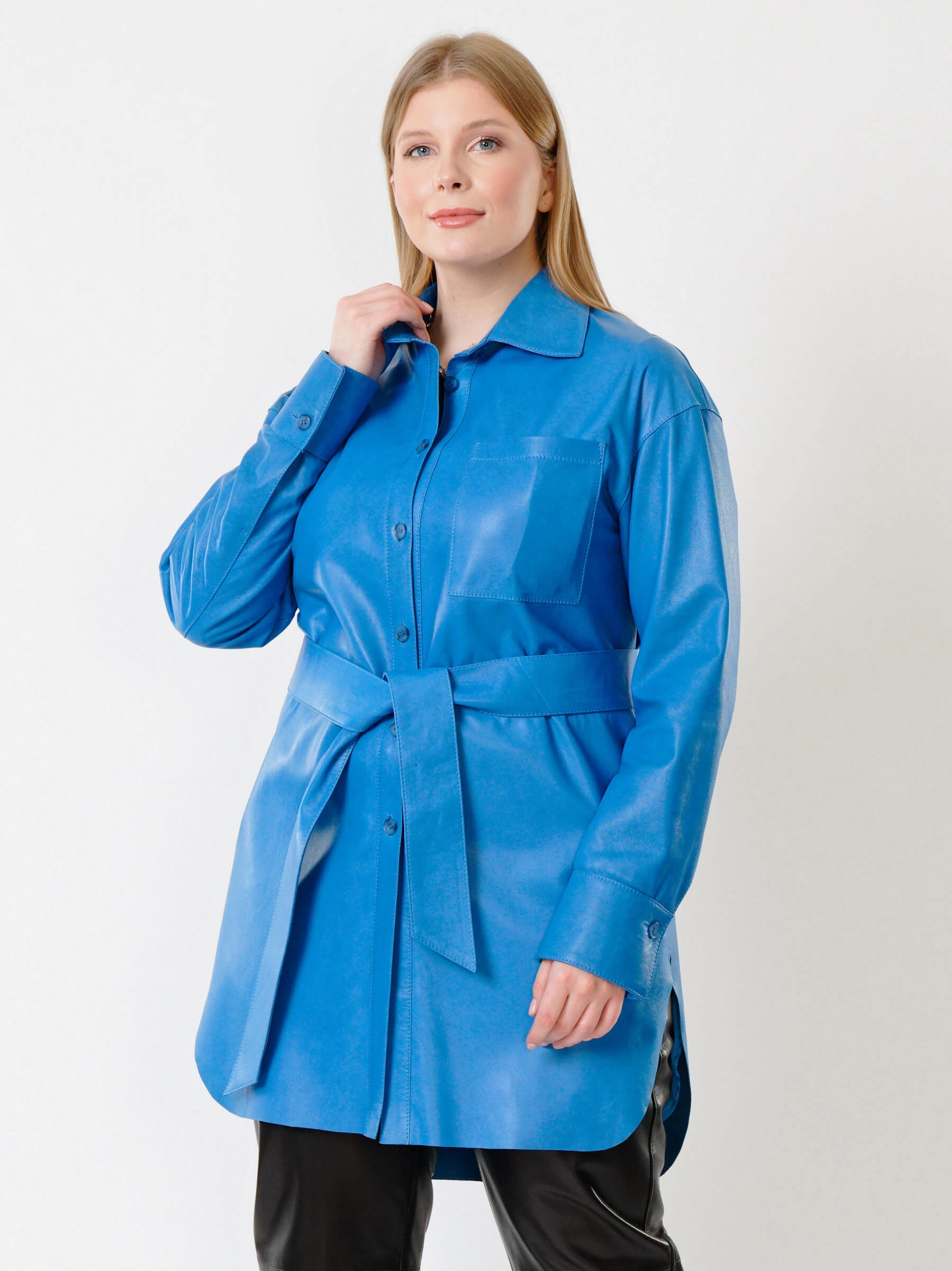 Кожаная женская рубашка с поясом из натуральной кожи 01_2, голубая, размер 48, артикул 91412