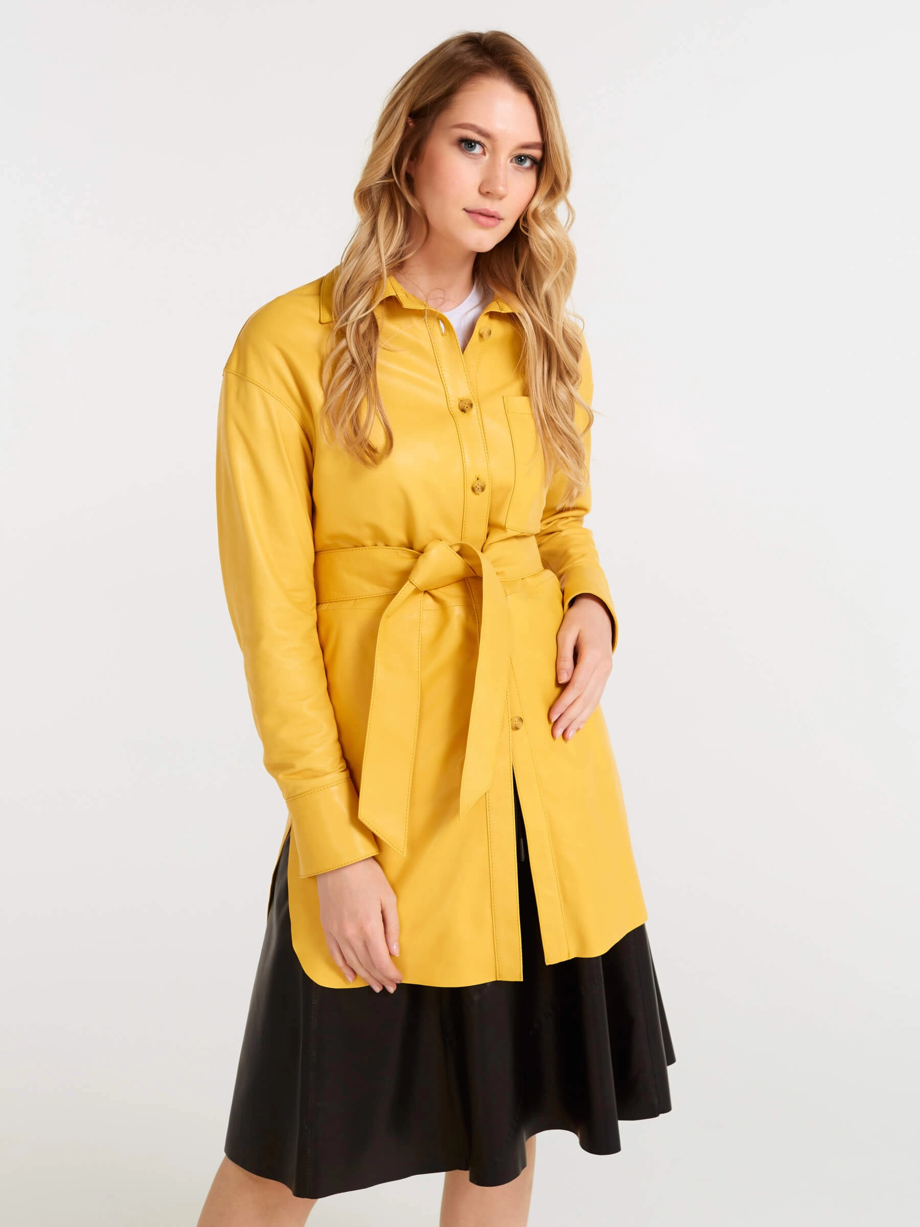 Товар кожаная женская рубашка с поясом из натуральной кожи 01, желтая, размер 48, артикул 90490 выполнен из натуральной кожи с застежкой пуговицы. Рассчитан на сезон: весна-лето. Длина изделия 94 см, силуэт свободный.