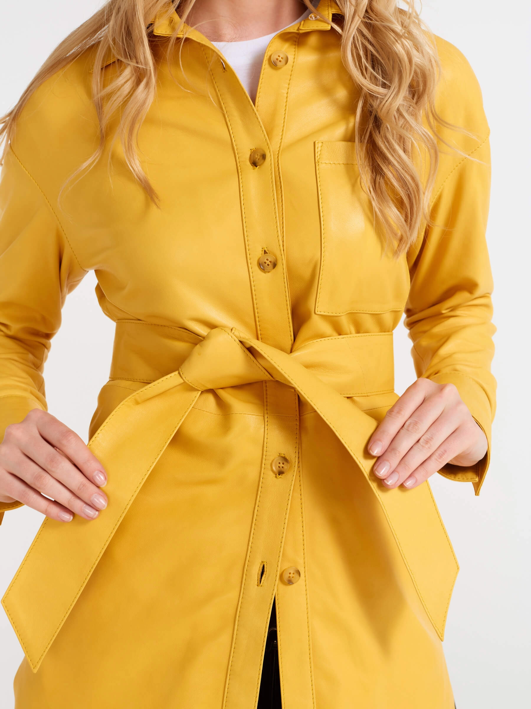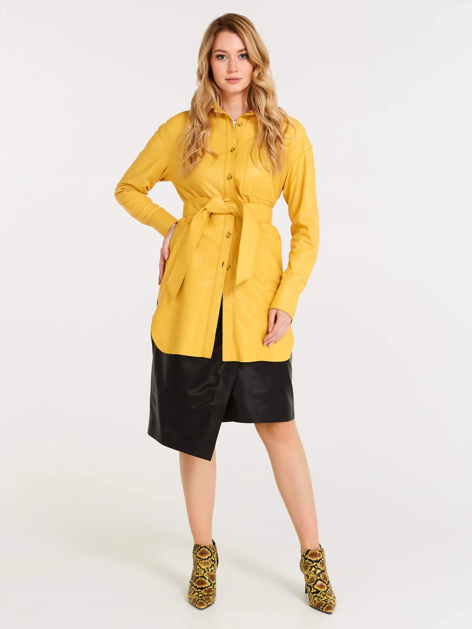 Кожаная женская рубашка с поясом из натуральной кожи 01, желтая, размер 48, артикул 90490