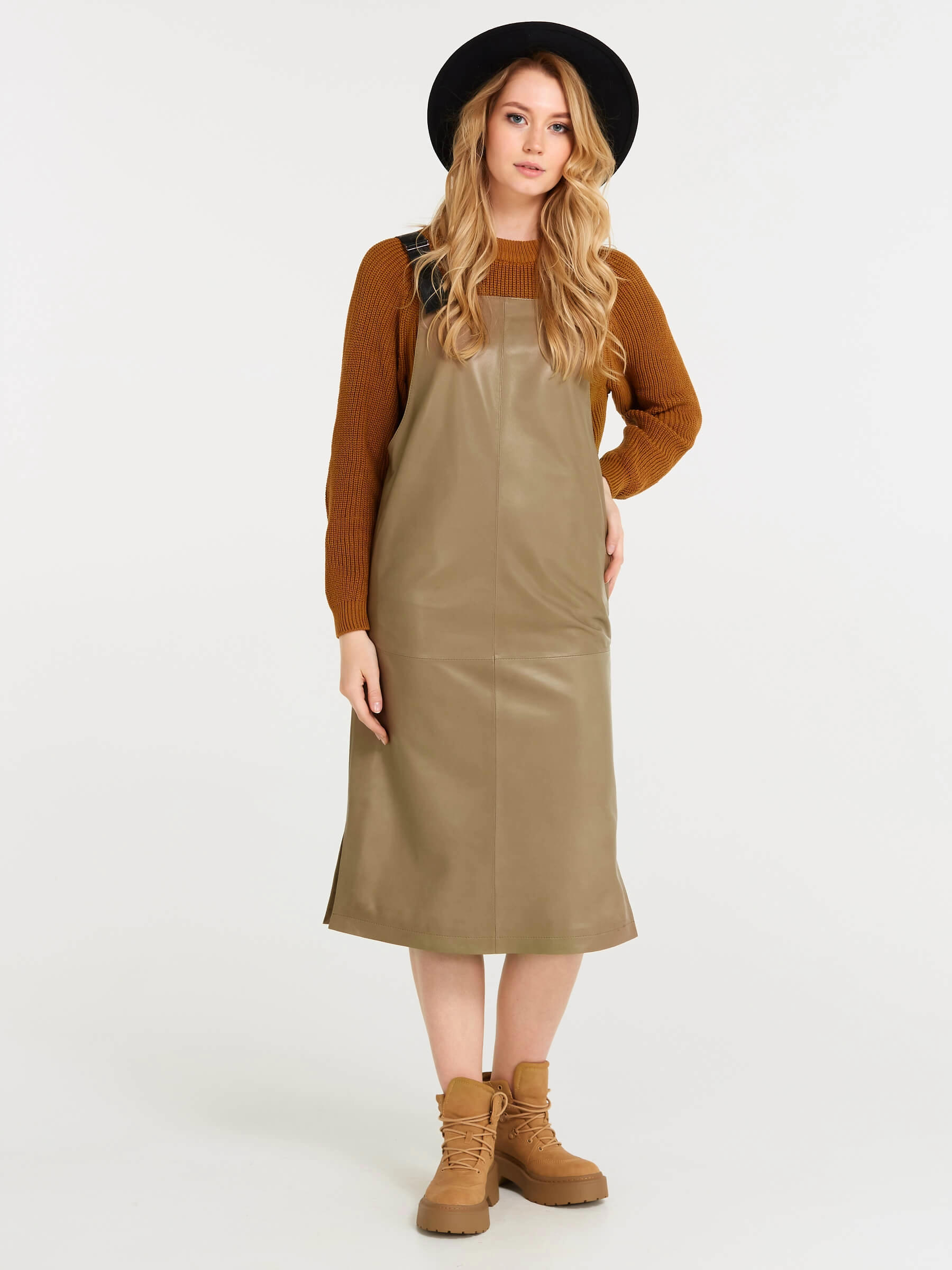 Серо-коричневый кожаный сарафан длиной 98 см из натуральной органической кожи. Прямой крой с широкими лямками создает элегантный силуэт, а глубокие боковые разрезы обеспечивают легкость движения. В отличие от аналогов, эта модель полностью лишена фурнитуры - молнии и застежки заменяет продуманная конструкция из цельного кожного полотна. При обработке материала применялась особая технология дубления растительными экстрактами, благодаря чему кожа сохранила природную мягкость и приобрела гипоаллергенные свойства. Тактильные качества превосходят обычную кожу - поверхность напоминает струящийся шелк, но с характерной благородной текстурой.