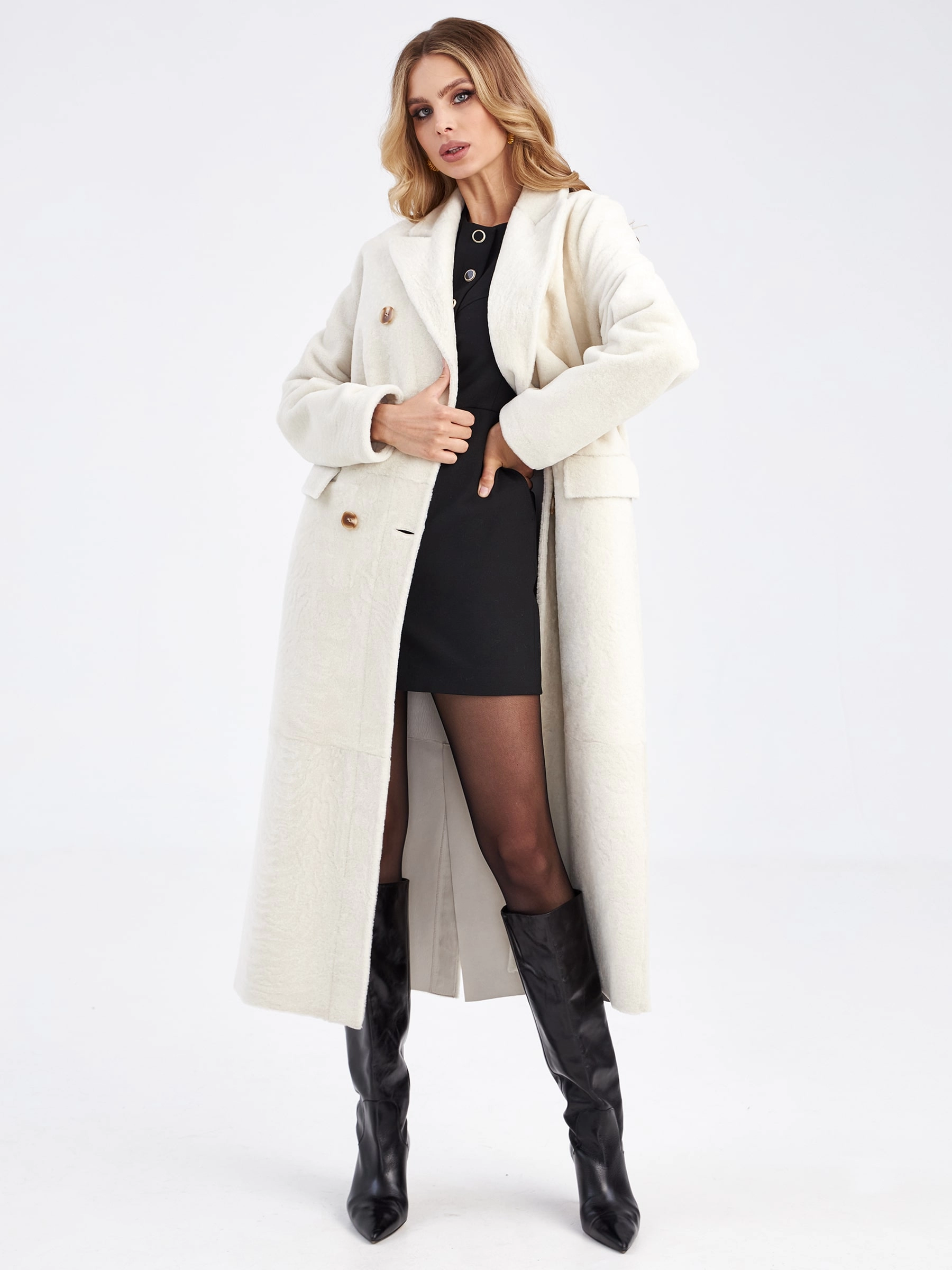 Товар двубортная женская длинная шуба из астрагана премиум класса 2047, белая, размер 48, артикул 13730 выполнен из астраган с застежкой пуговицы. Рассчитан на сезон: осень-зима. Длина изделия свыше 90 см, силуэт прямой.