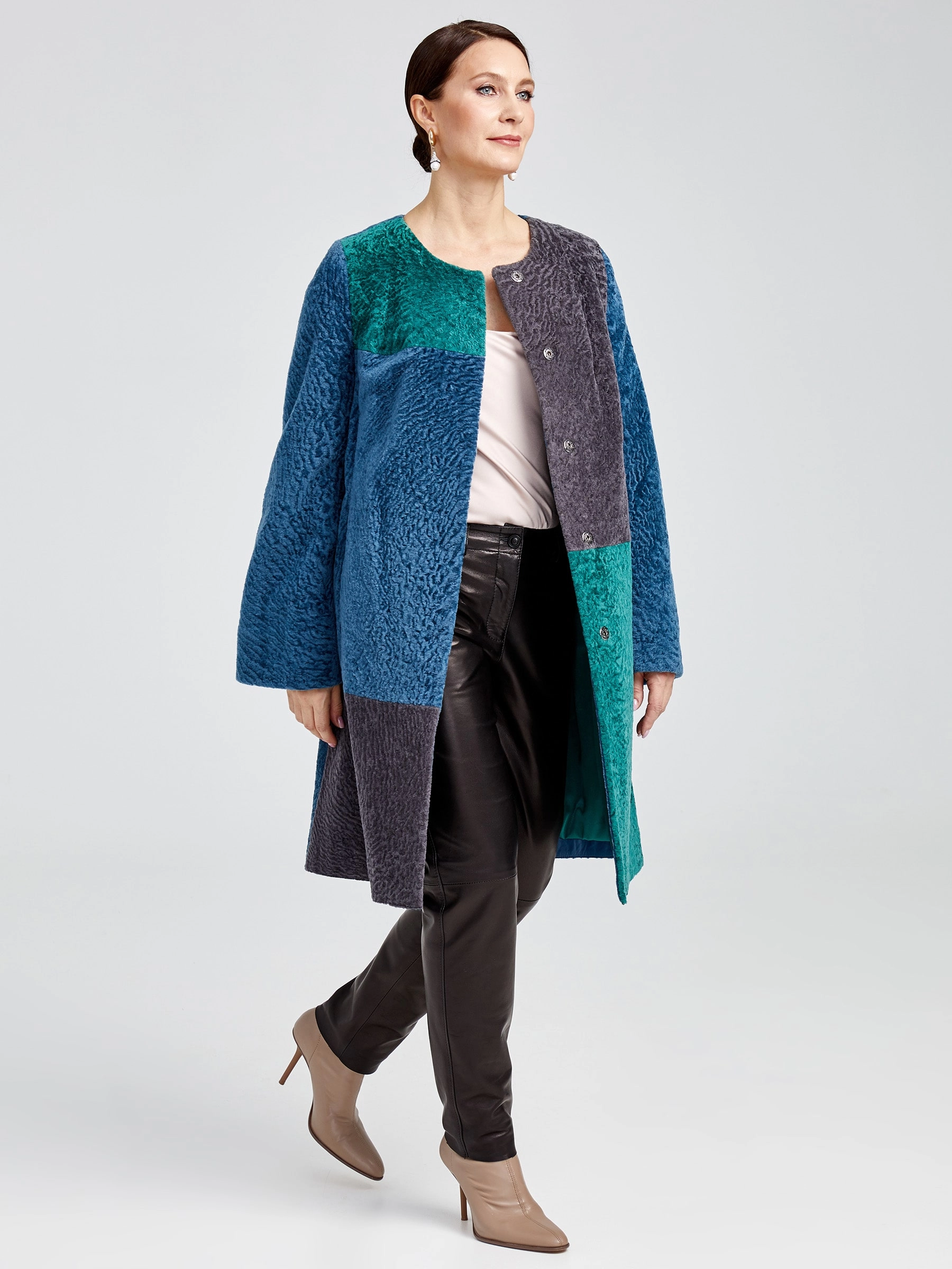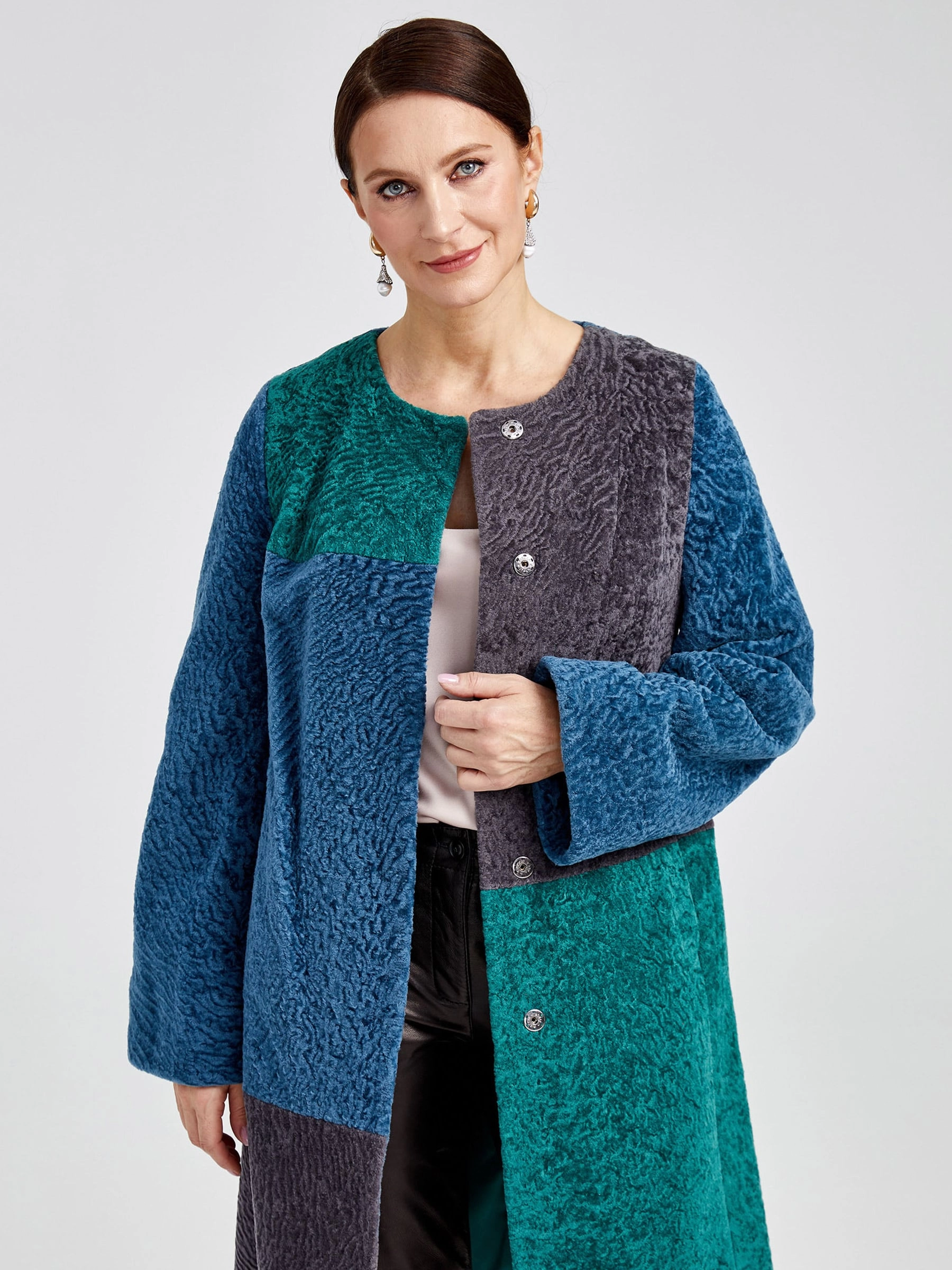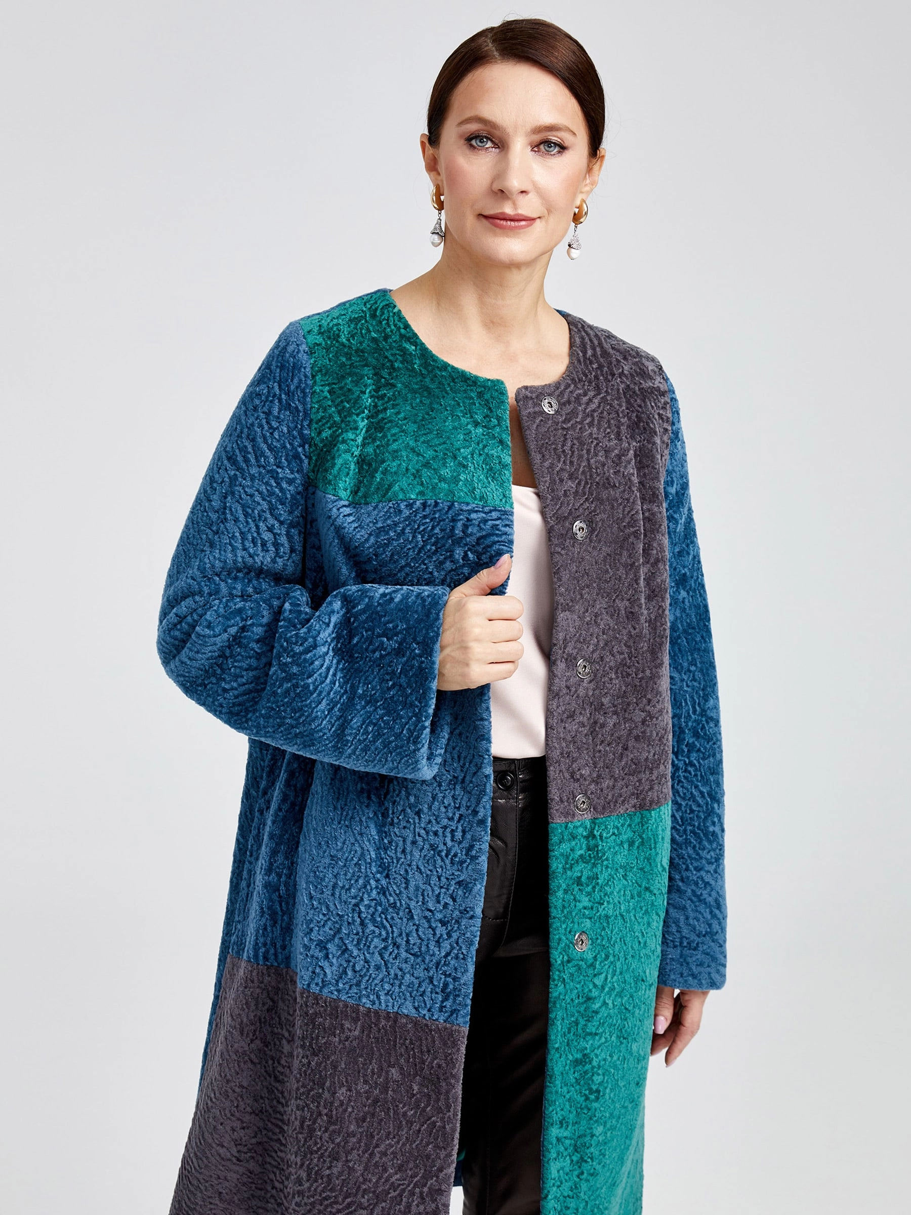 Товар шуба из астрагана комбинированная с поясом для женщин 33мех, мультиколор, размер 40, артикул 13610 выполнен из астраган с застежкой кнопки. Рассчитан на сезон: осень-зима. Длина изделия 93 см, силуэт полуприлегающий.