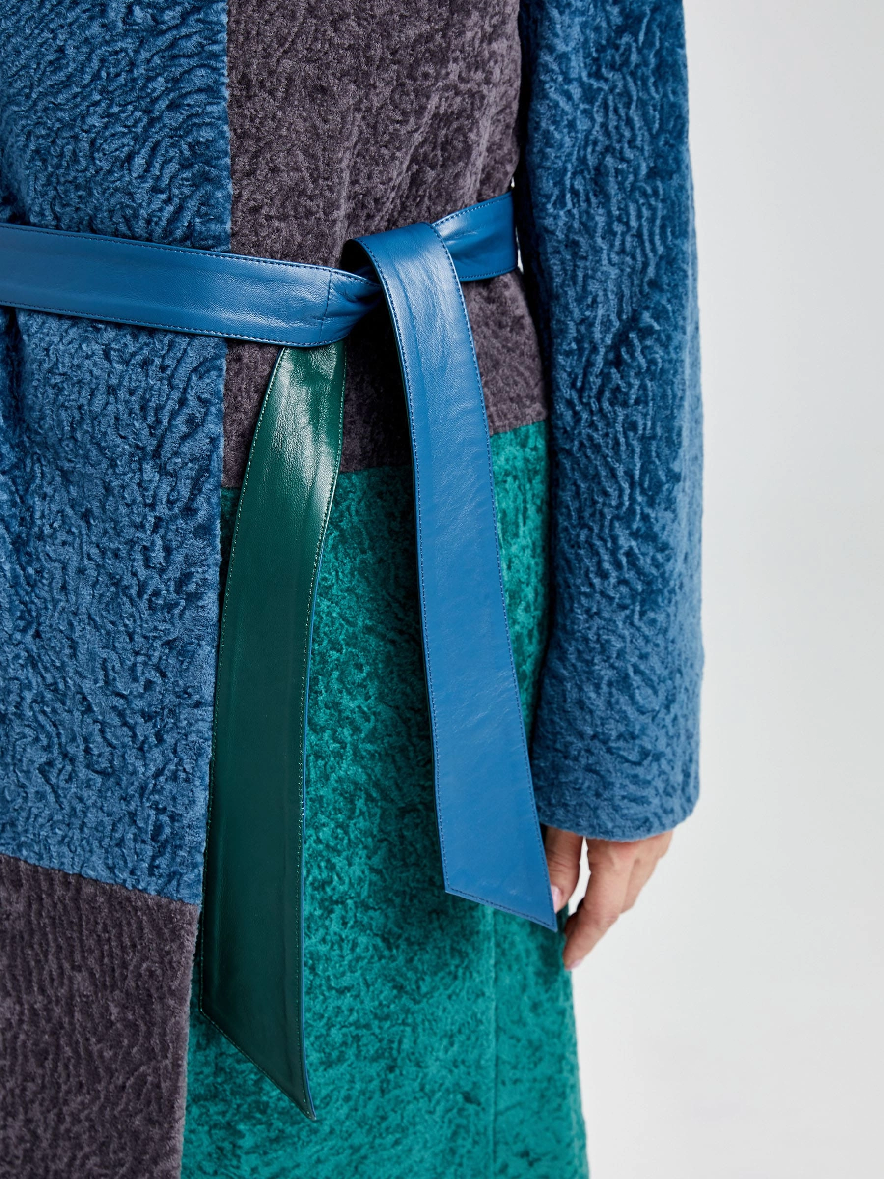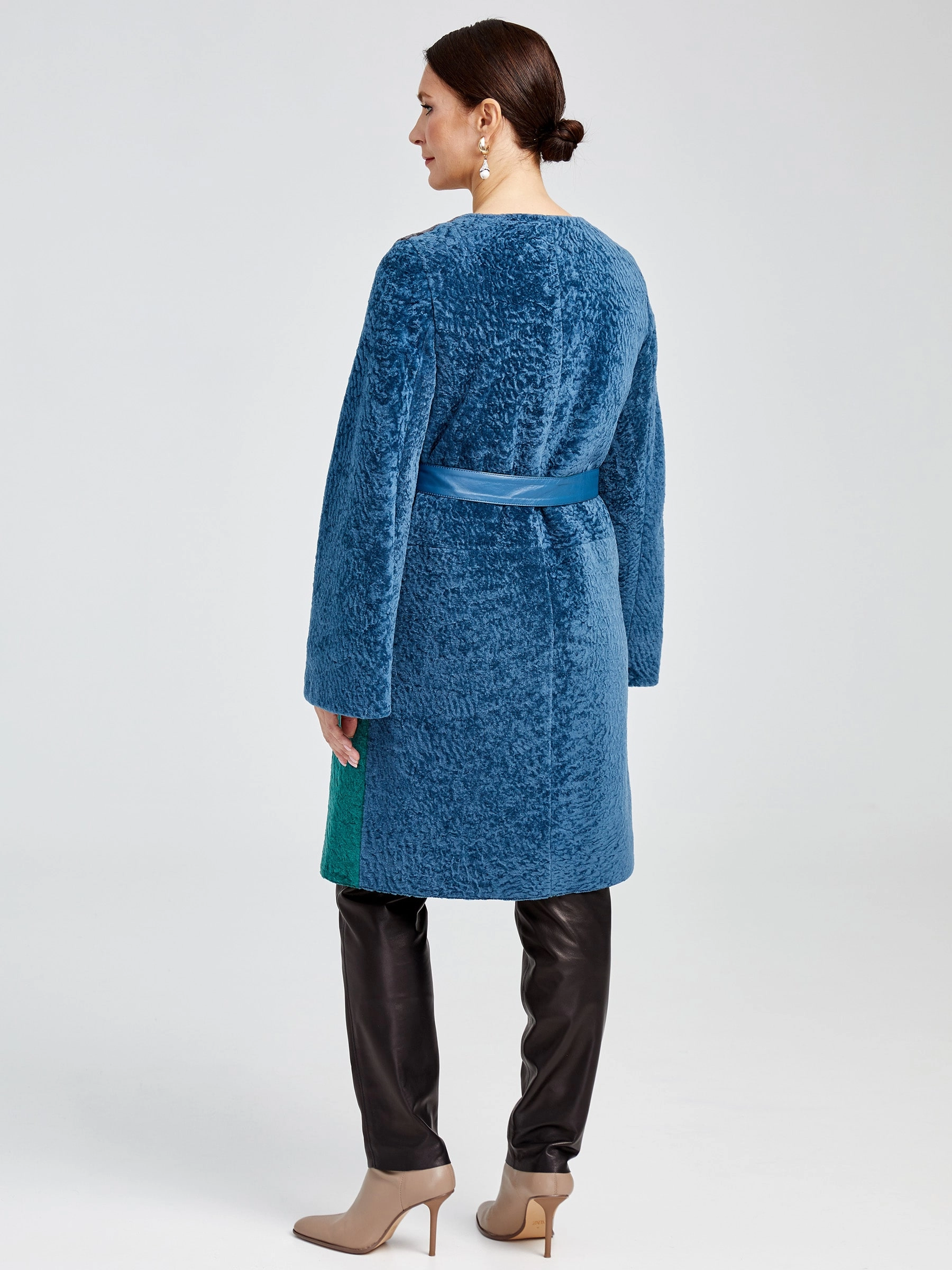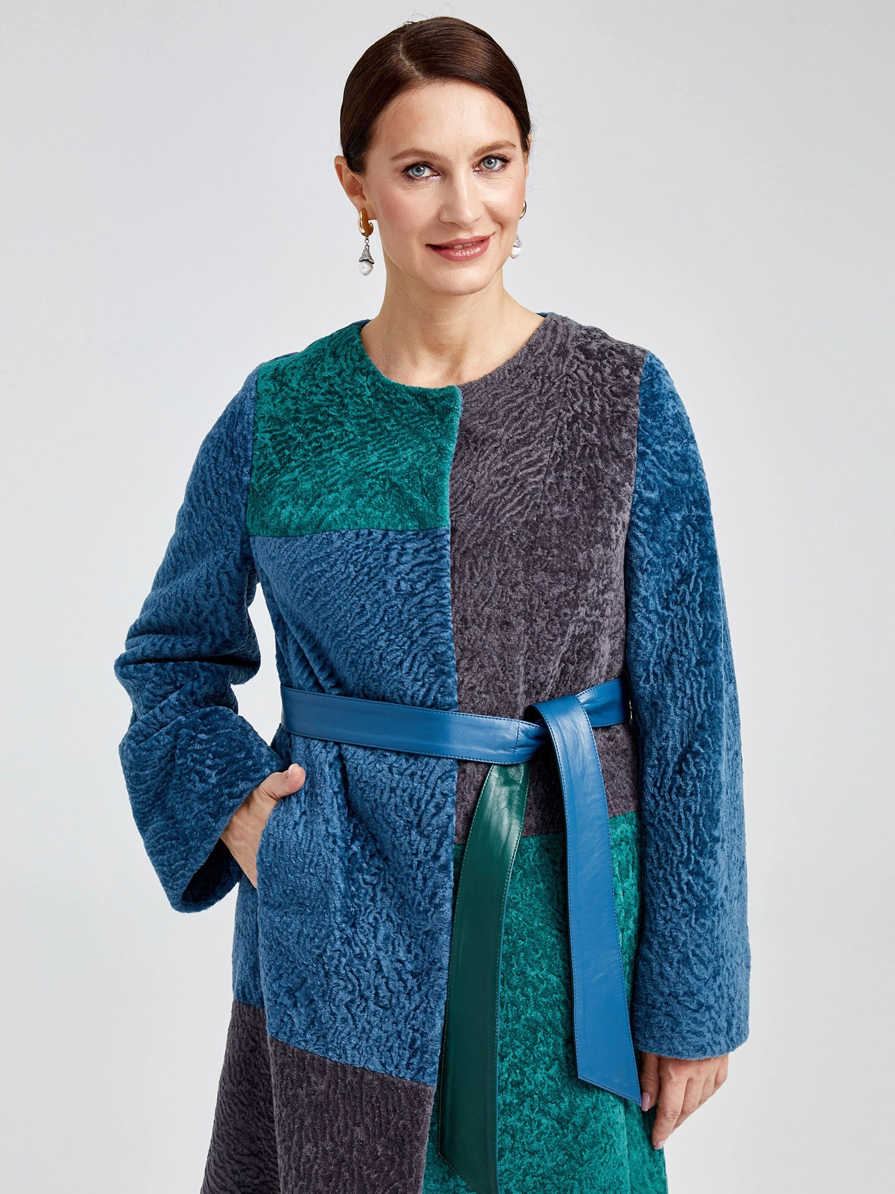 Шуба из астрагана комбинированная с поясом для женщин 33мех, мультиколор, размер 40, артикул 13610
