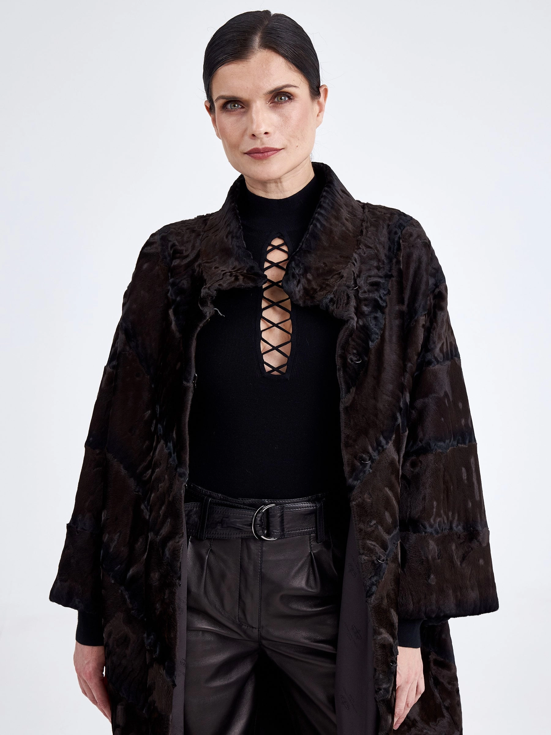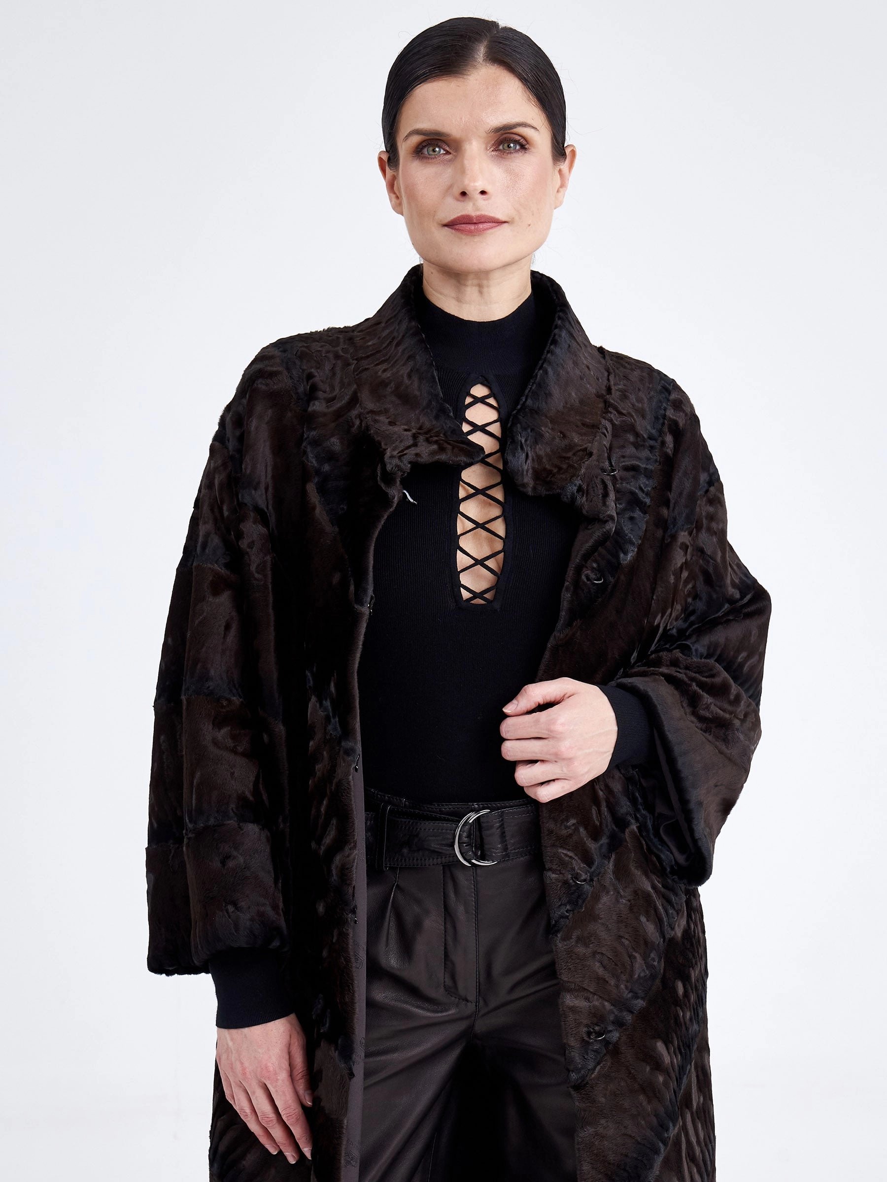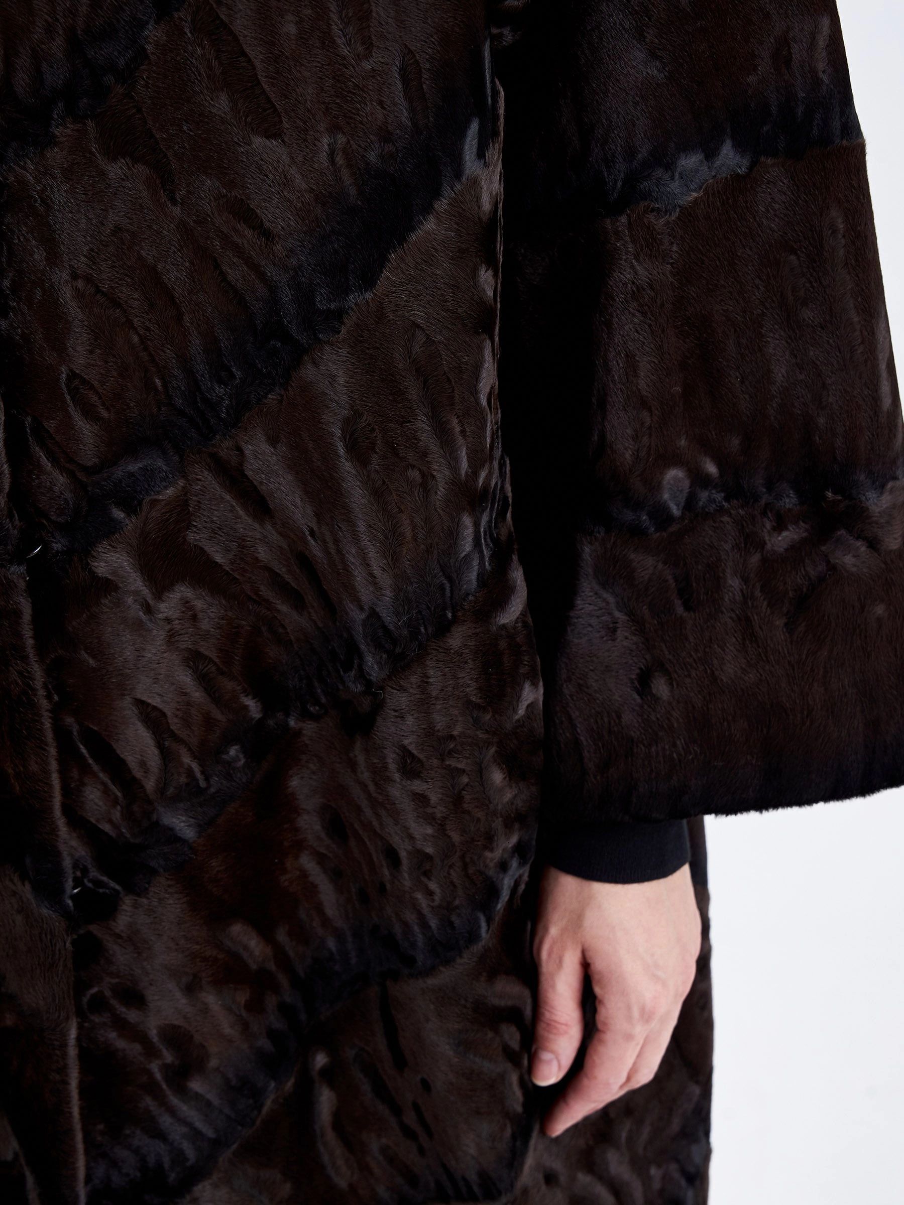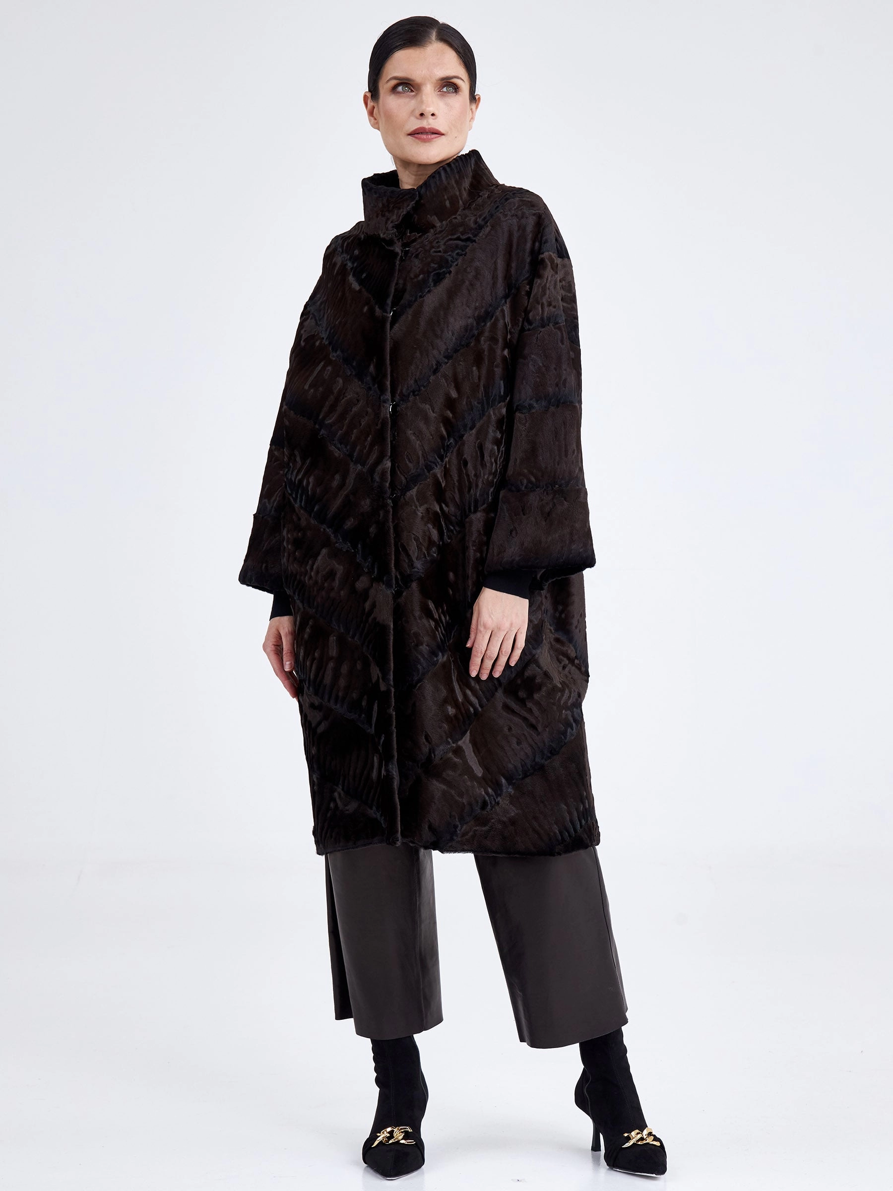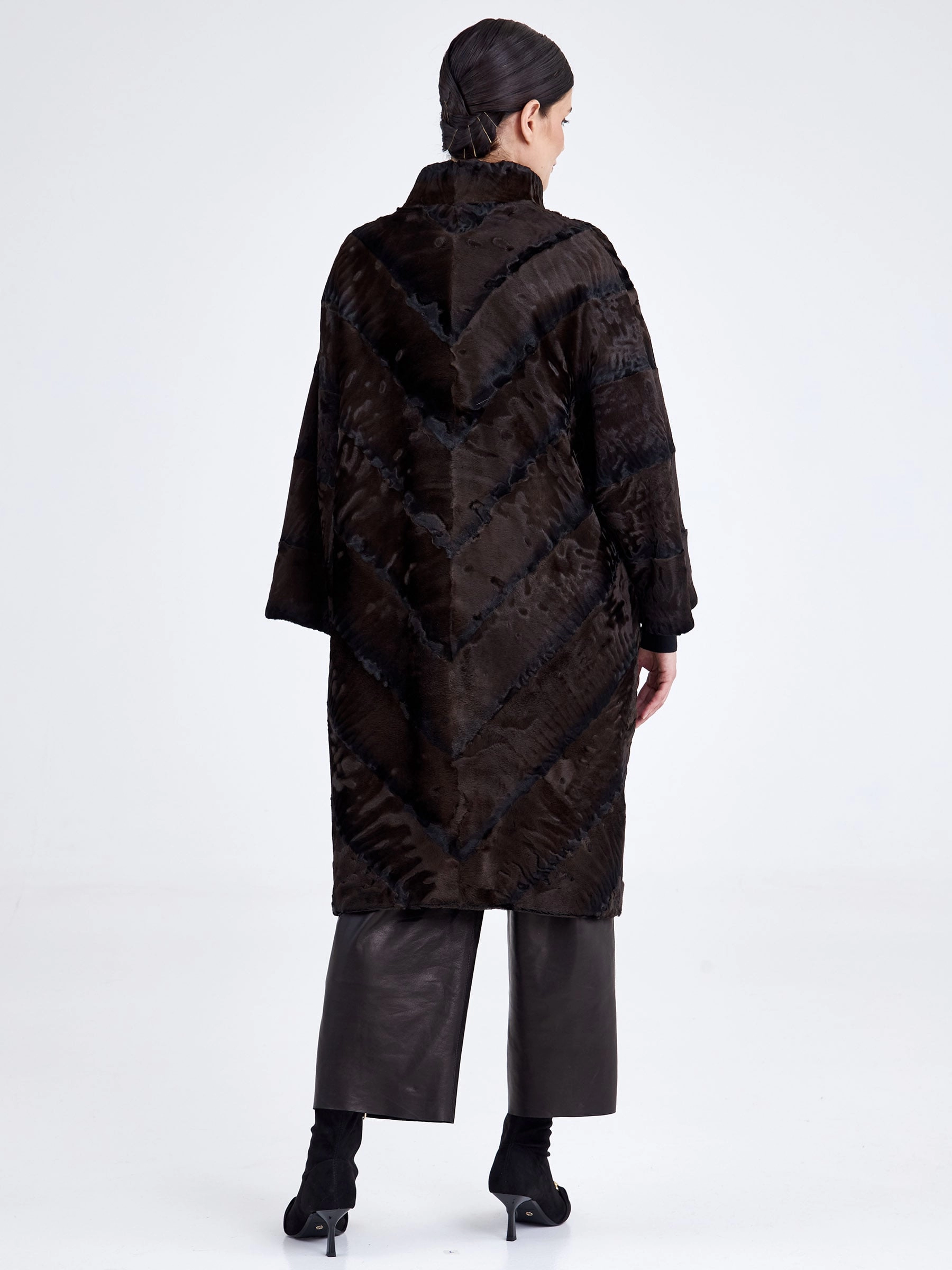Эффектное пальто из нежного меха каракуля в благородном коричневом оттенке удачно сочетает в себе практичность, комфорт и элегантность. Изделие напоминает прекрасный узор из множества завитков, переливающихся на солнце. Прямой крой, невысокая стойка, отсутствие лишнего декора и длина свыше 90 см подчёркивают чистоту линий и премиальный статус модели. Совет стилиста: тёплый коричневый цвет каракуля идеально сочетается с базовыми нейтральными оттенками — носите шубу с однотонными комплектами в бежевой, кремовой или шоколадной гамме, дополнив образ высокими сапогами и минималистичной сумкой, чтобы подчеркнуть природную красоту и графичность завитков меха.