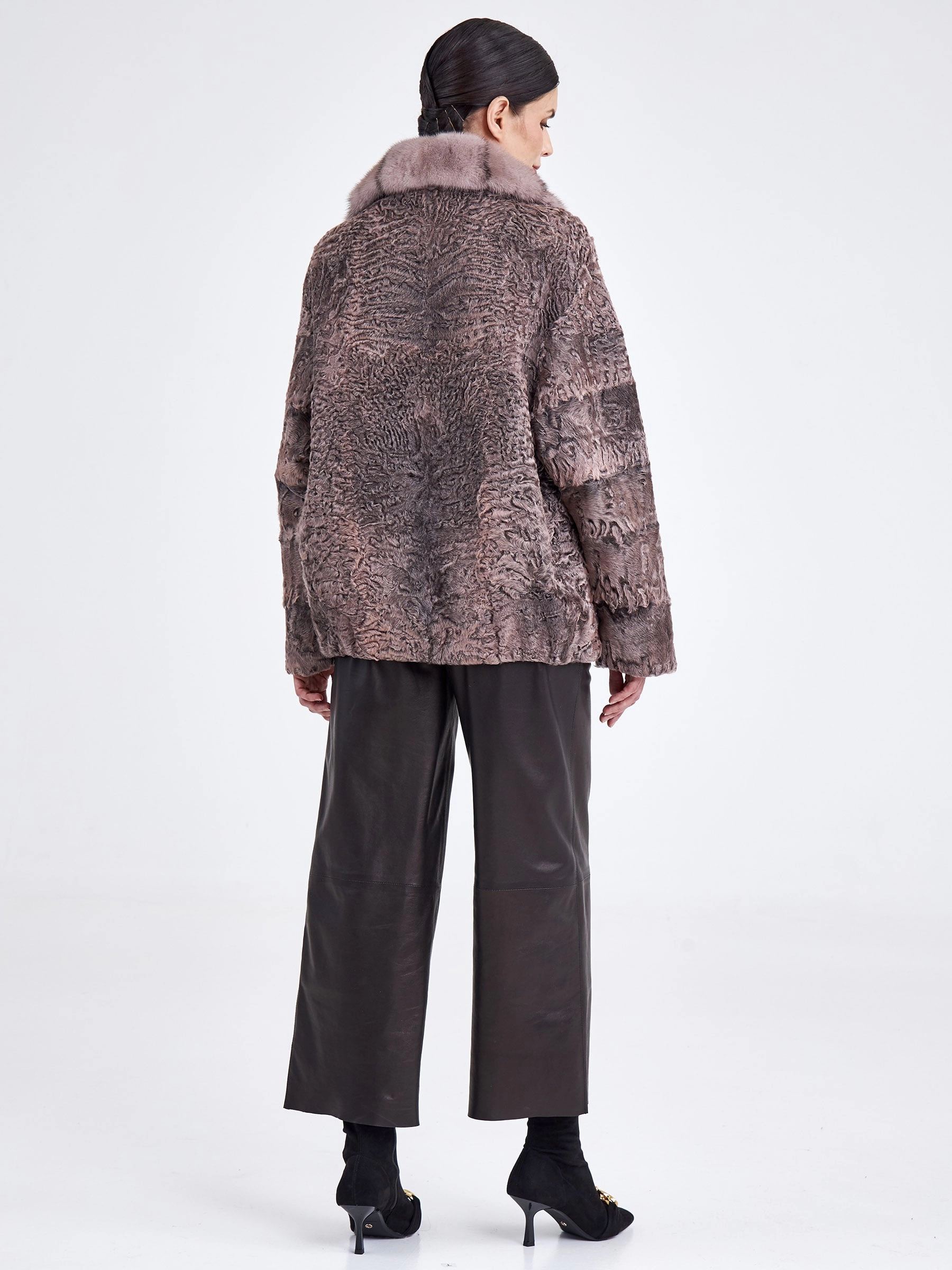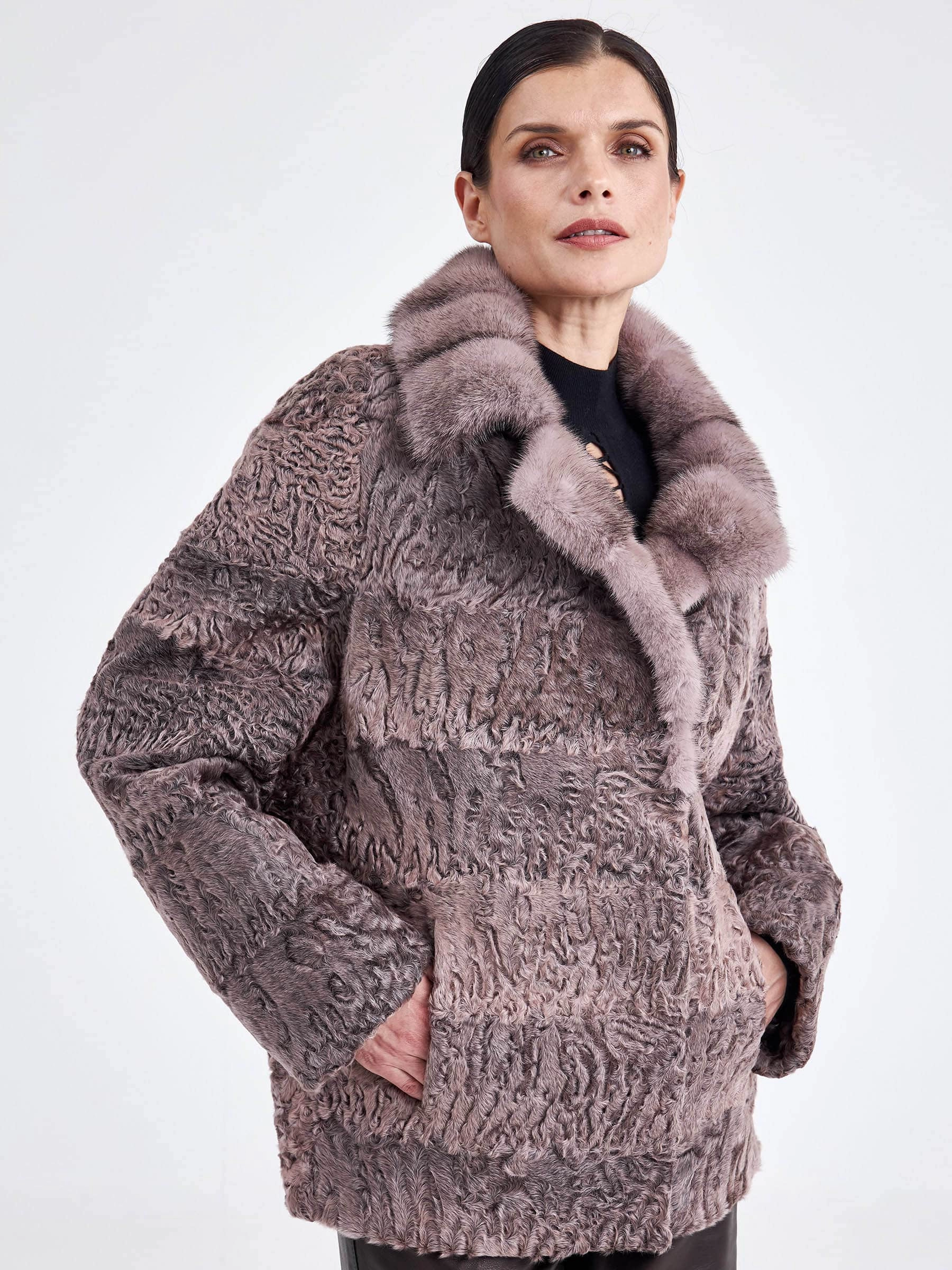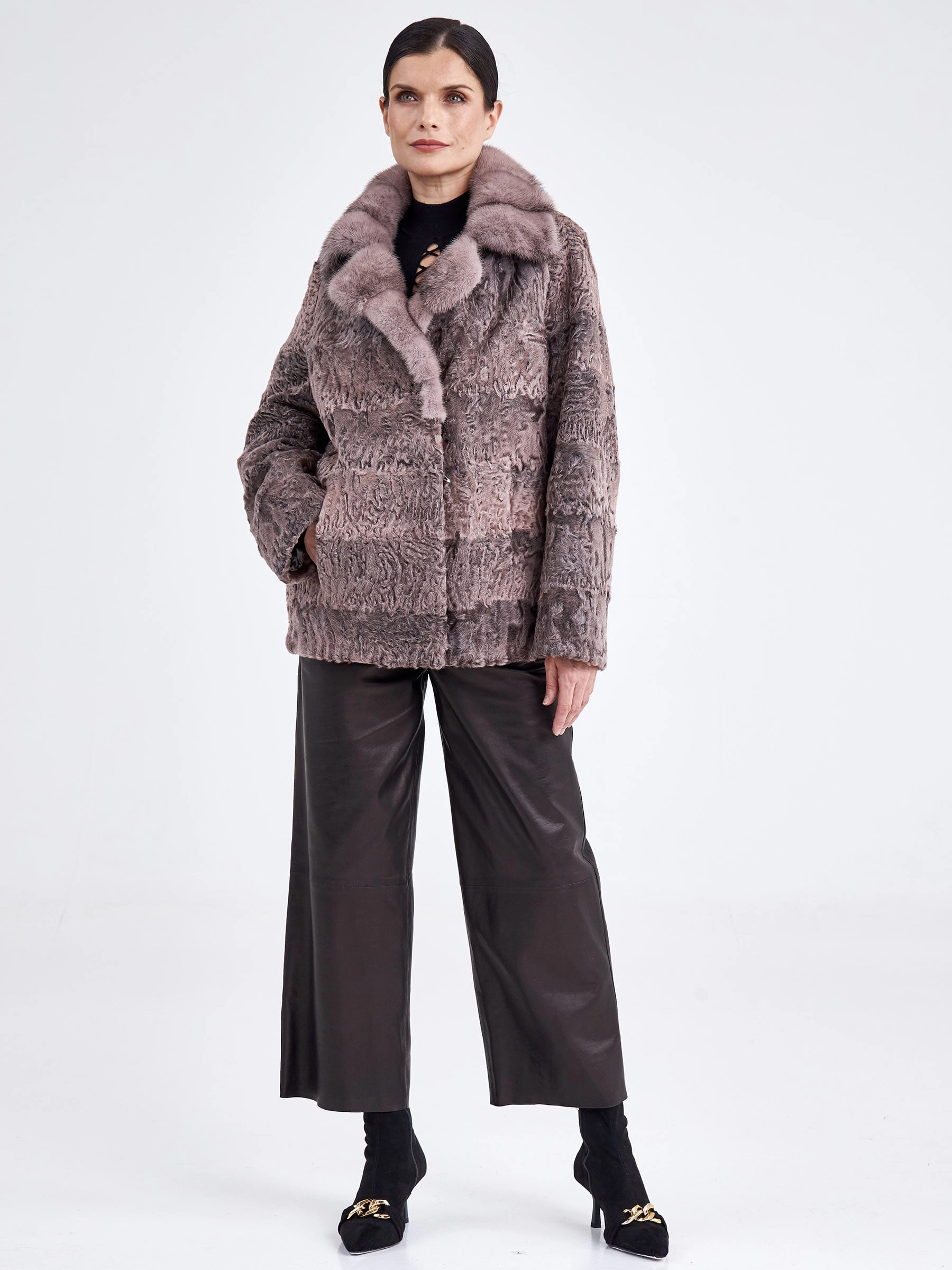 Короткая шуба из нежного каракуля, выполненная в сдержанном прямом крое, представляет собой идеальный баланс между элегантностью и современностью. Её главная изюминка — уникальный муаровый рисунок натурального меха, играющий на свету, который гармонично сочетается с объемным воротником из густой норки в нежных розовых оттенках. Длина от 51 до 74 см, заканчивающаяся на линии бёдер, создаёт динамичный и женственный силуэт, а классический рукав реглан обеспечивает дополнительную свободу и комфорт. Совет стилиста: эта модель станет ключевой вещью в вашем гардеробе — наденьте её с облегающими кожаными брюками или плиссированной миди-юбкой и высокими сапогами, чтобы подчеркнуть линию талии и визуально вытянуть пропорции, добавив образу лёгкой дерзости и безупречной элегантности.