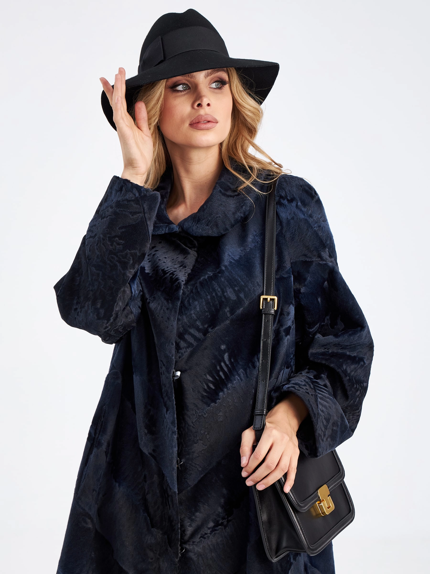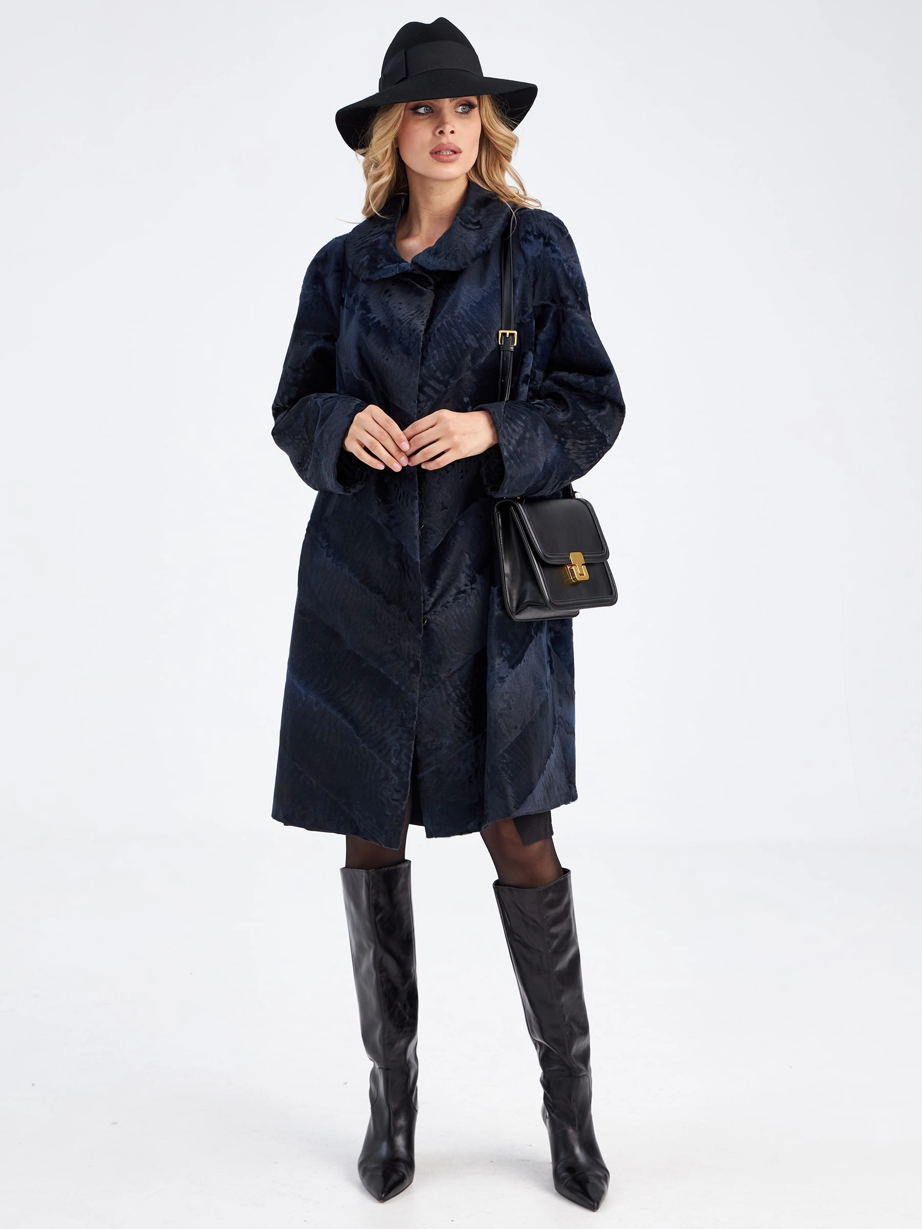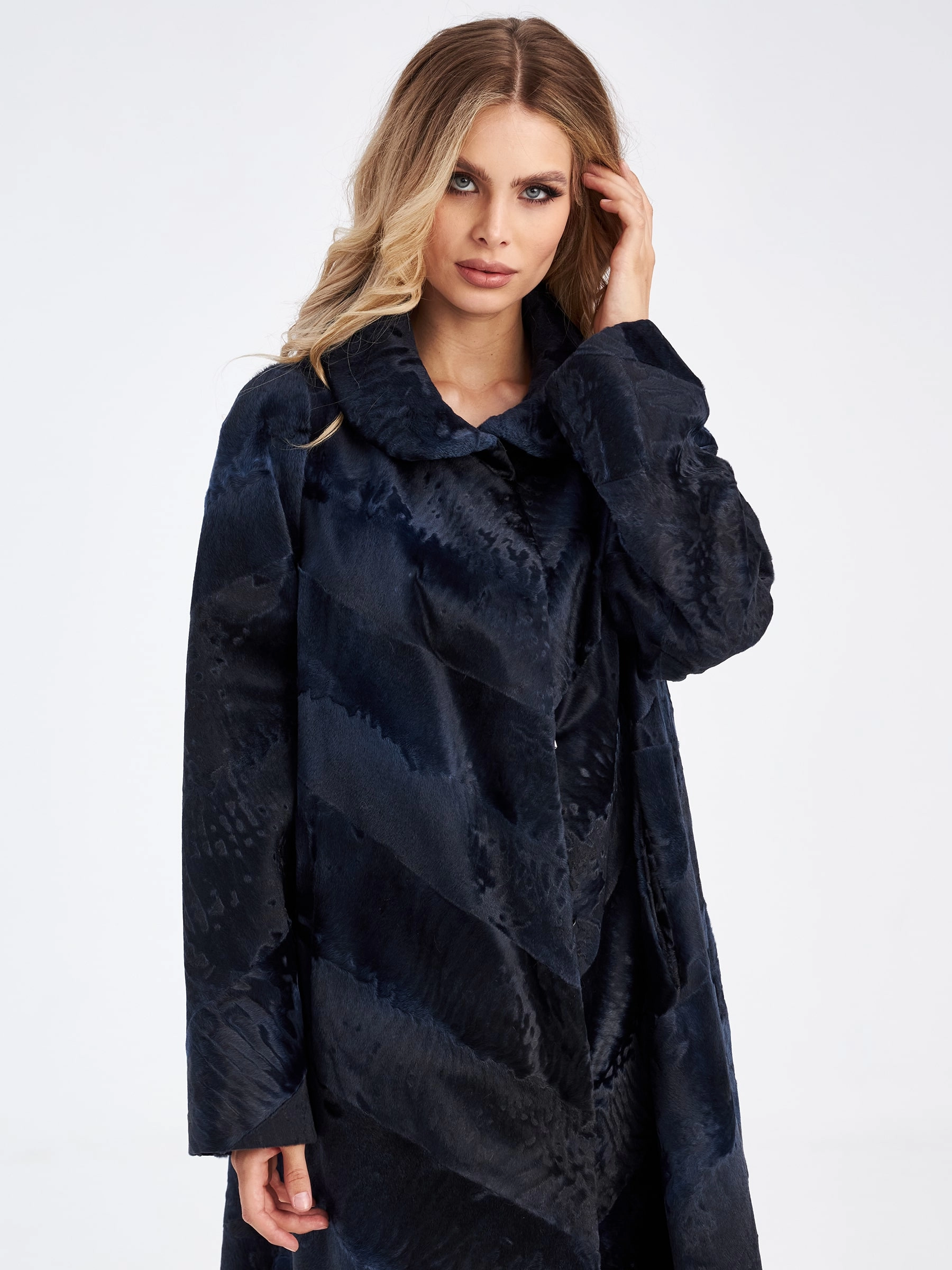 Товар шуба из меха каракуля женская елизавета-д(в), синяя, размер 56, артикул 33770 выполнен из каракульча с застежкой клипсы. Рассчитан на сезон: осень-зима. Длина изделия 117 см, силуэт расклешенный.