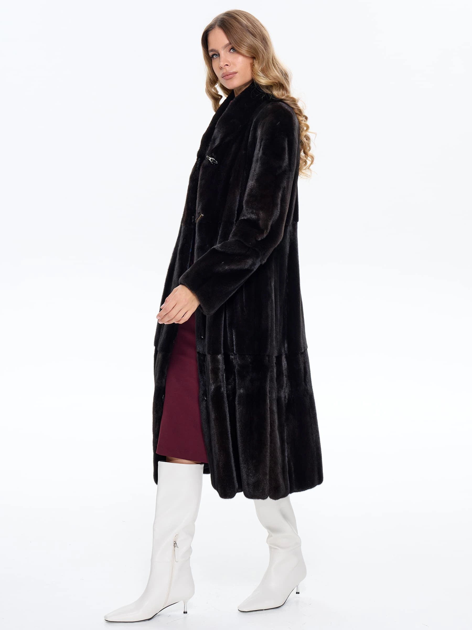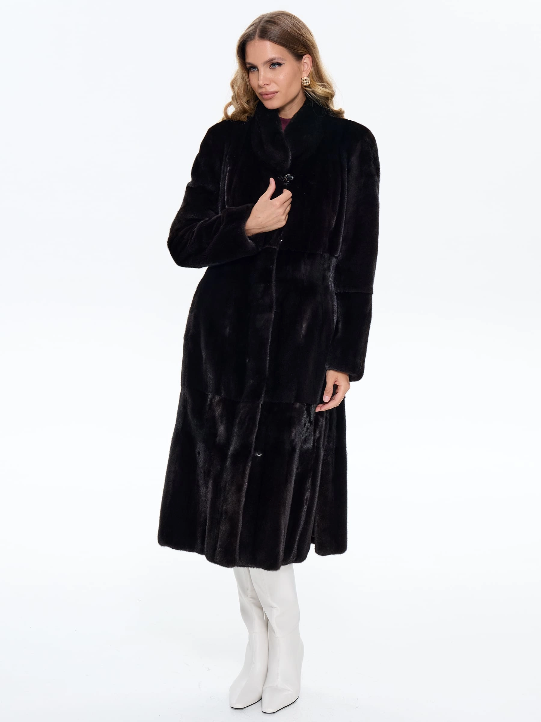Для пошива длинной классической шубы мастера использовали нежный густой мех норки глубокого черного цвета. Полуприлегающий крой с анатомическими вытачками в талии подчеркивает силуэт, не стягивая фигуру, и дополнен двумя боковыми карманами. Строгая шалевидная стойка обеспечивает защиту в ветреную погоду, а свободный крой от бедра мягко маскирует особенности фигуры. Изделие отлично сохраняет тепло в зимние морозы. Застёжка выполнена на невидимых клипсах с прочным титановым покрытием.