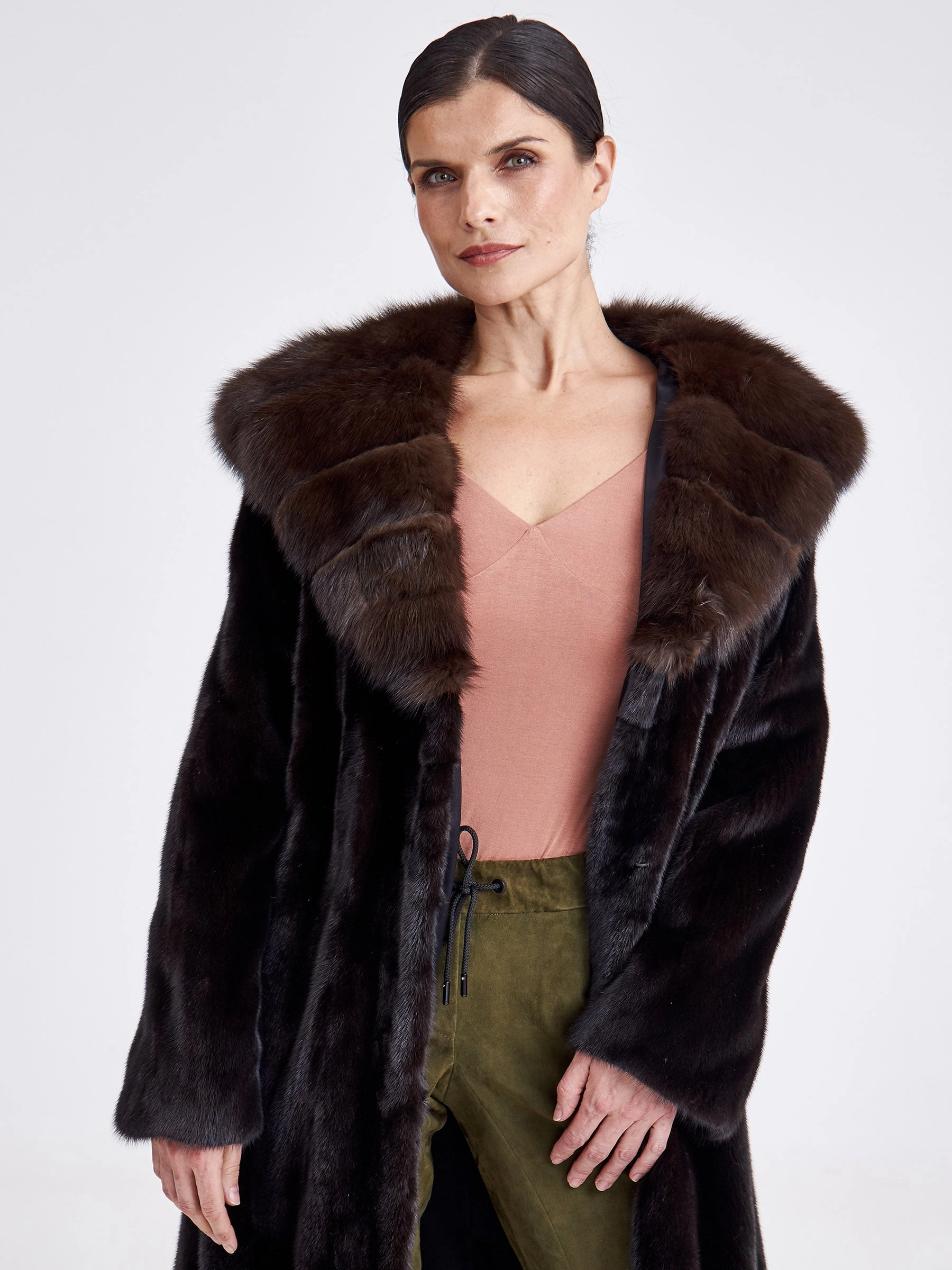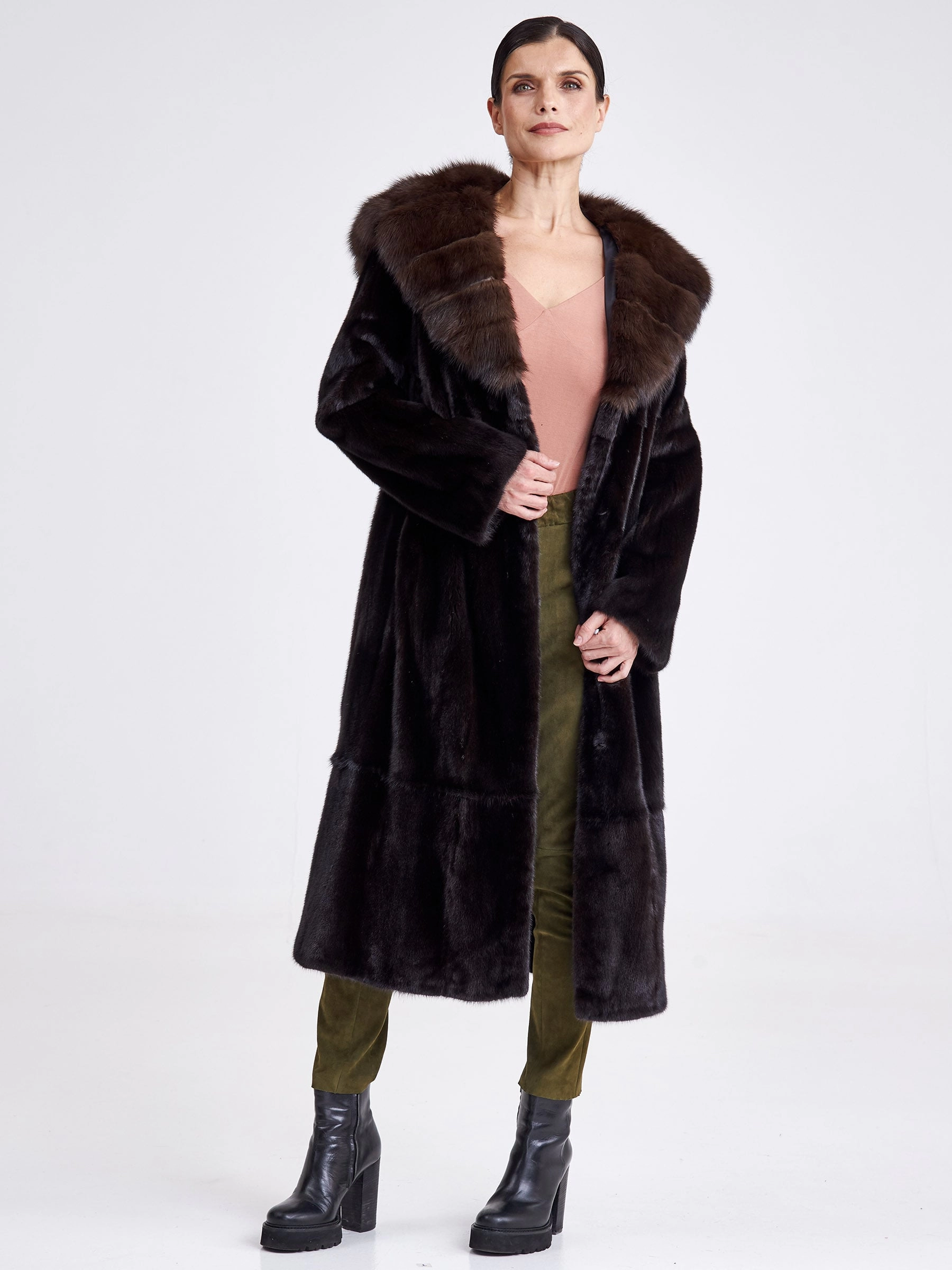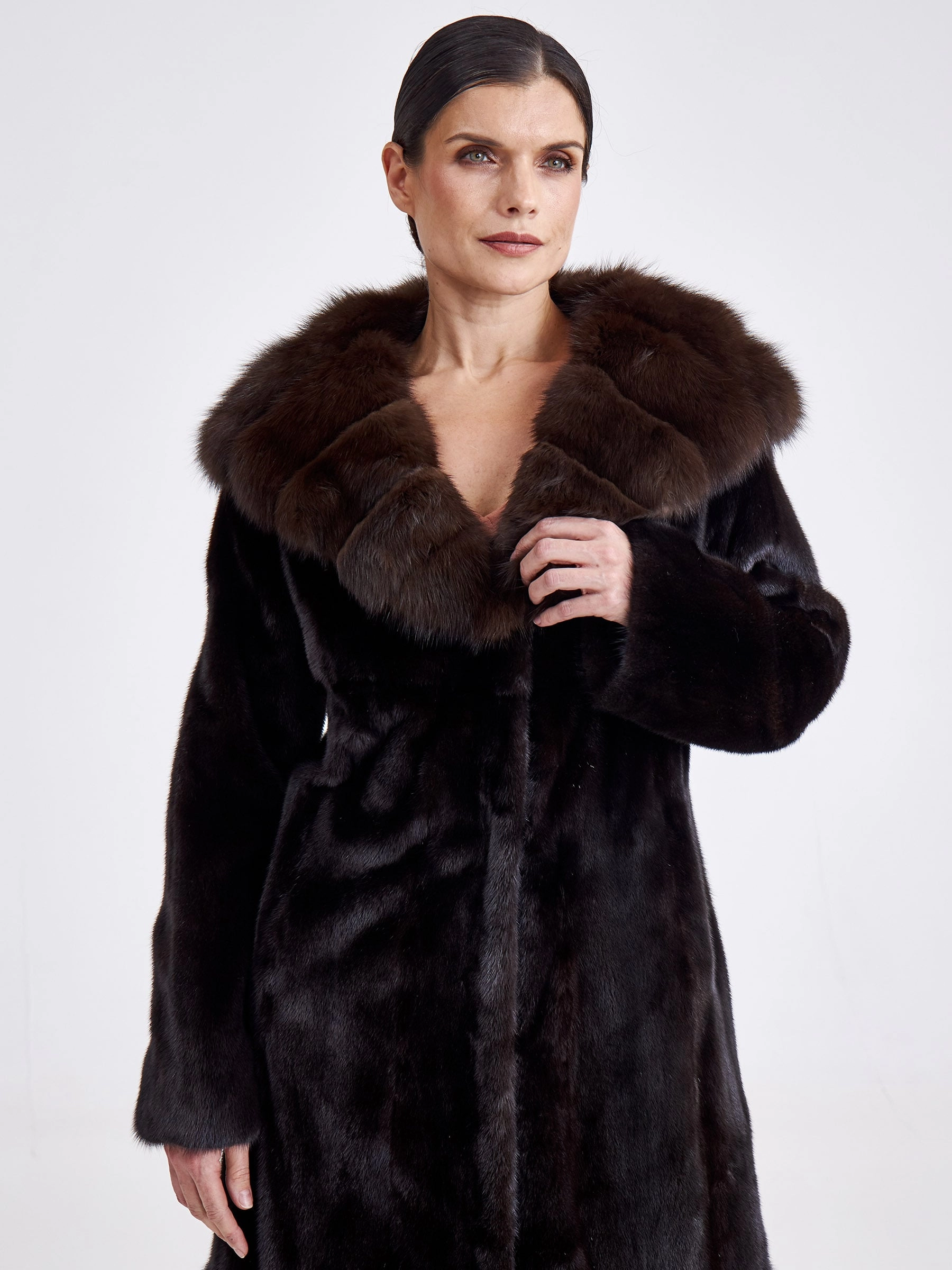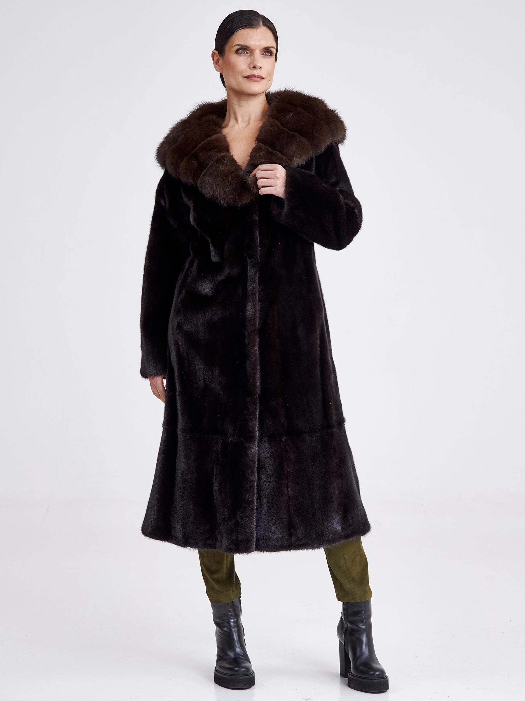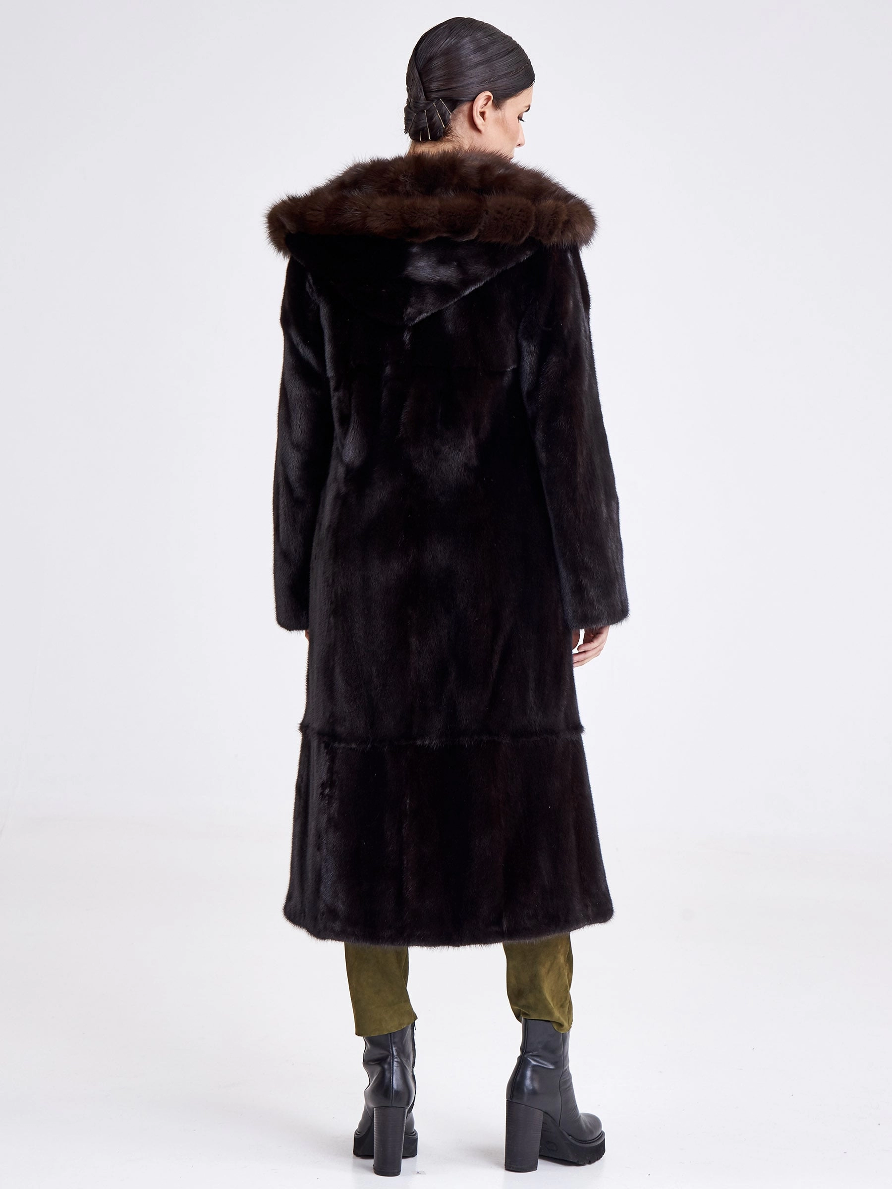 Товар шуба из меха норки с капюшоном женская 17231(кс), длинная, с отделкой капюшона из меха соболя, черная, размер 44, артикул 33280 выполнен из норка крашенной с застежкой клипсы. Рассчитан на сезон: зима. Длина изделия свыше 90 см, силуэт полуприлегающий.