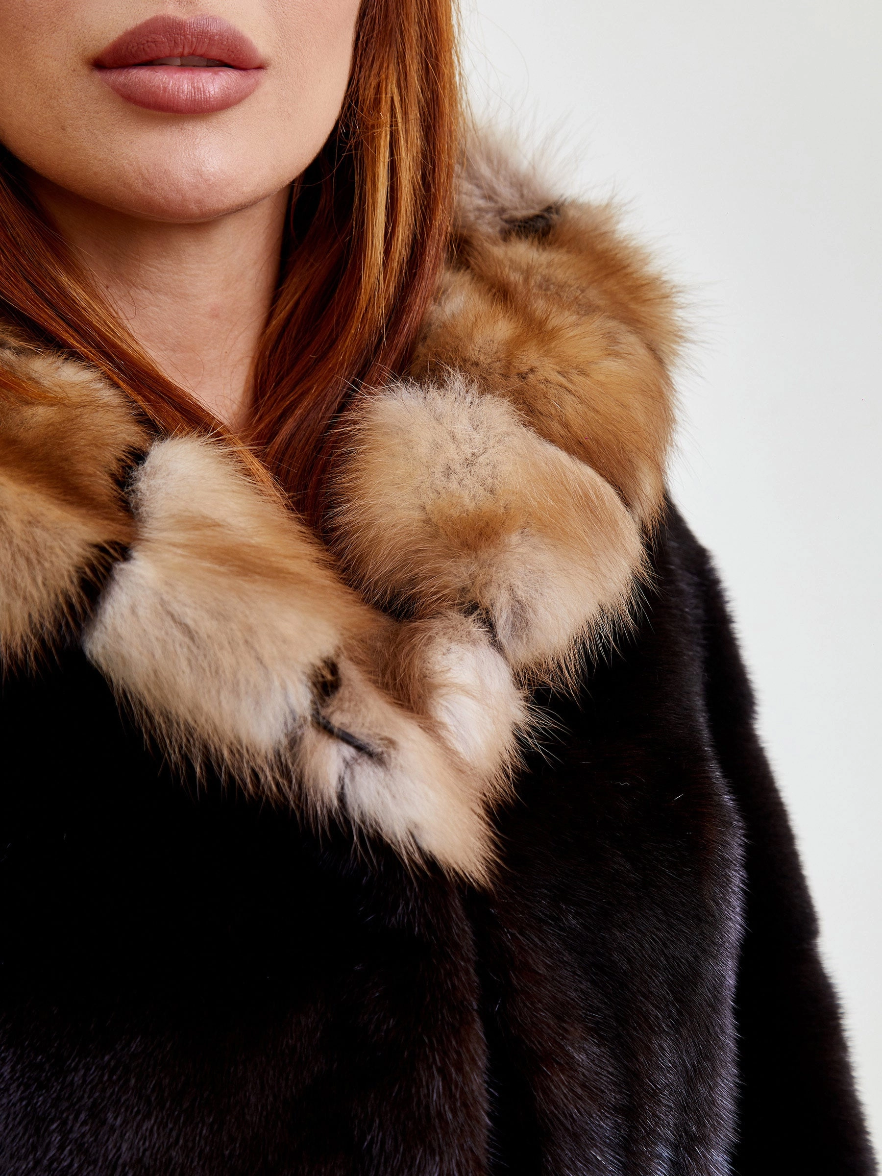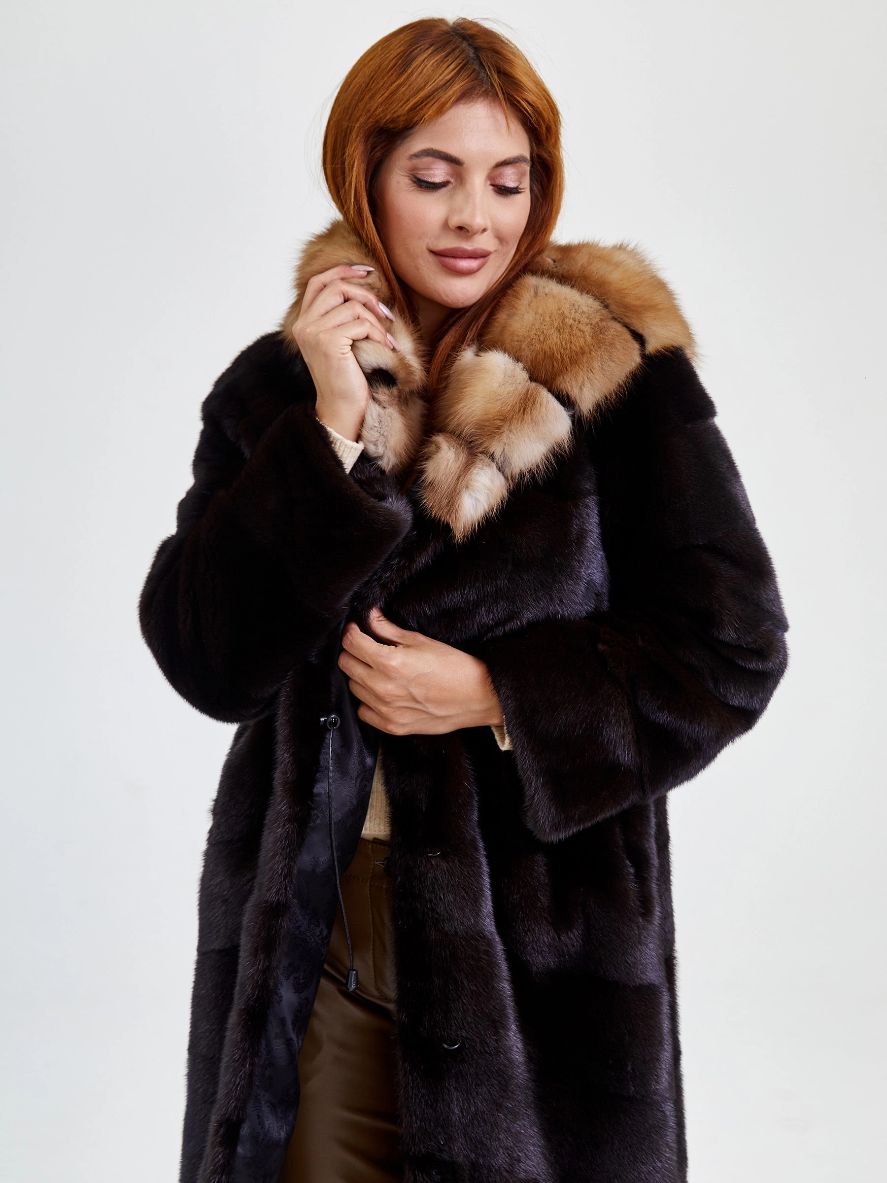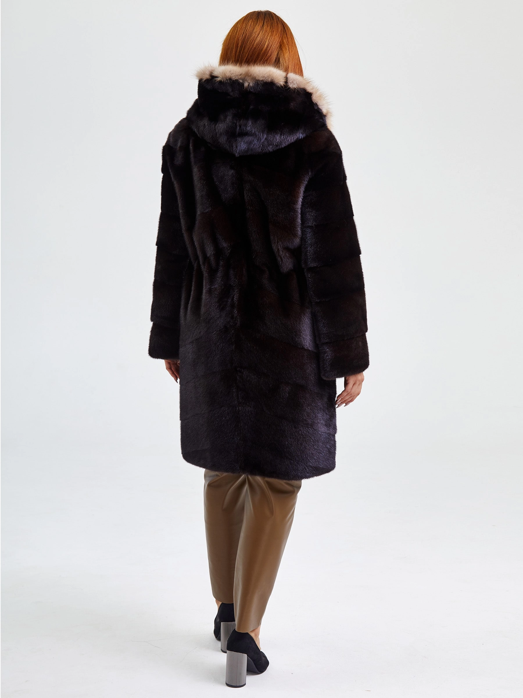 Элегантная шуба из натурального меха норки с капюшоном, отделанным мехом куницы. Прямой силуэт с утягивающей кулиской на талии обеспечивает идеальную посадку по фигуре, а поперечная пластинчатая раскладка меха подчеркивает современную эстетику. Глубокий неcъёмный капюшон — это дерзкая альтернатива головному убору, которая добавляет образу функциональности и стиля. Сочетайте с кожаными леггинсами и уггами для создания мощного повседневного образа, где роскошь встречается с комфортом.