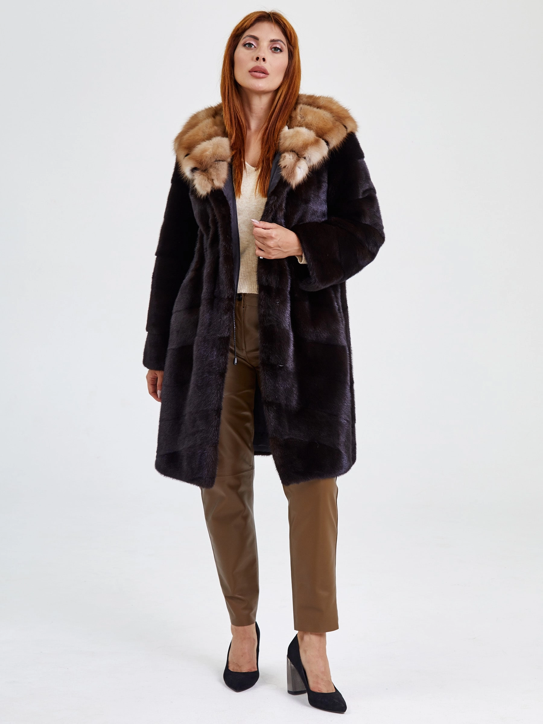 Норковая шуба женская с капюшоном из меха куницы 2а, баклажановая, размер 48, артикул 33410