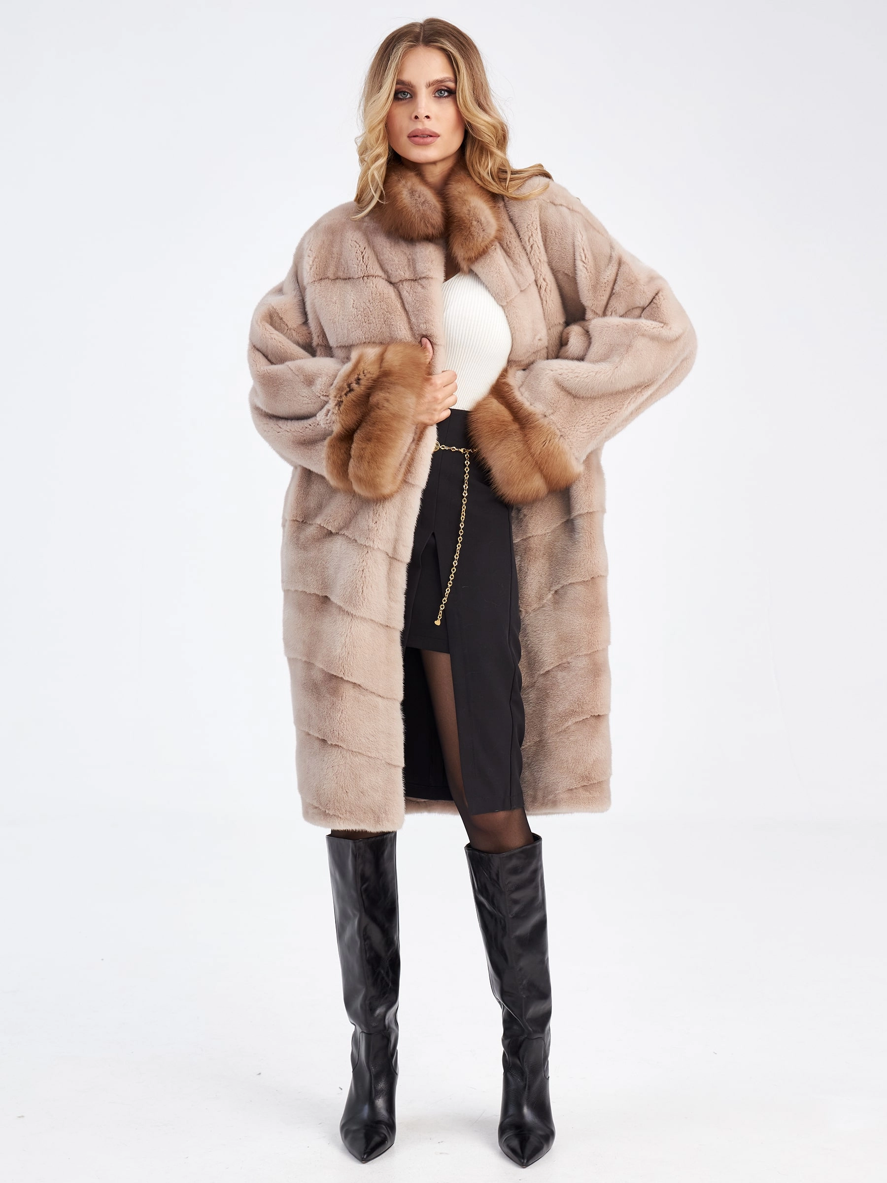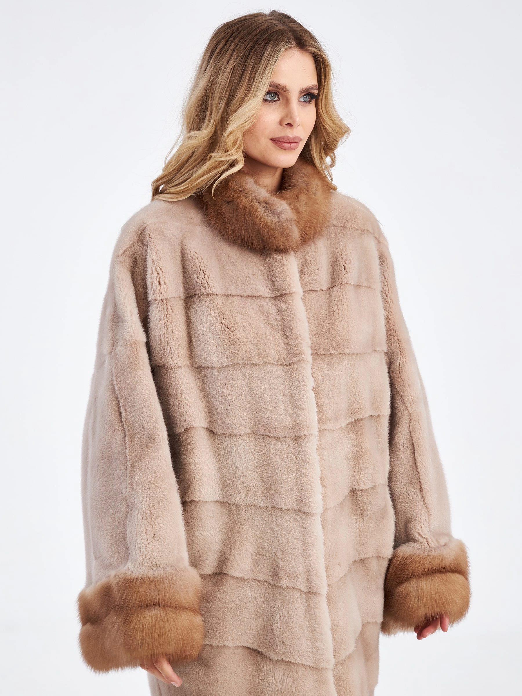 Поперечная длинная женская шуба из меха норки с отделкой из меха куницы Анастасия(ск), пудровая, размер 38, артикул 33700