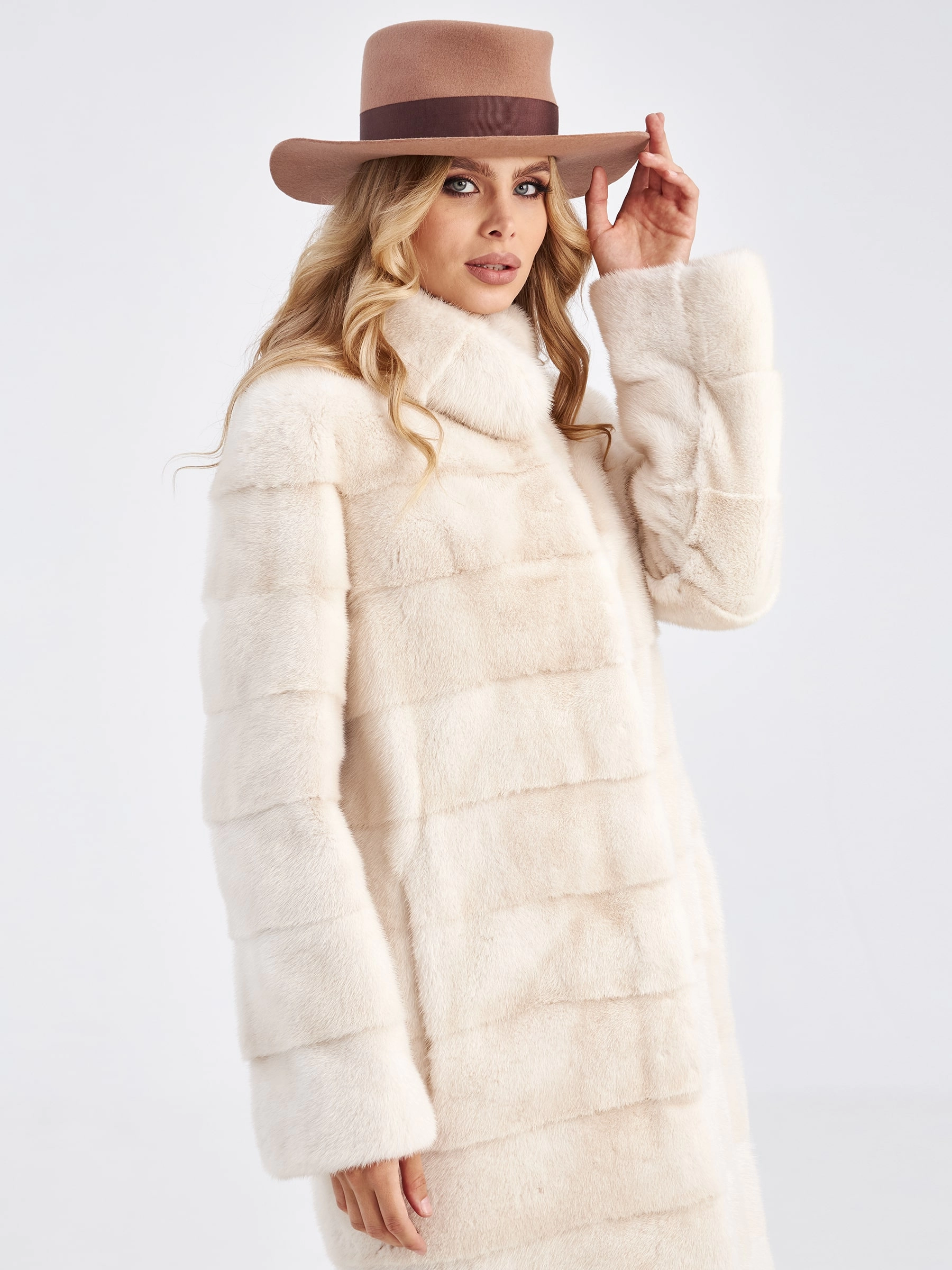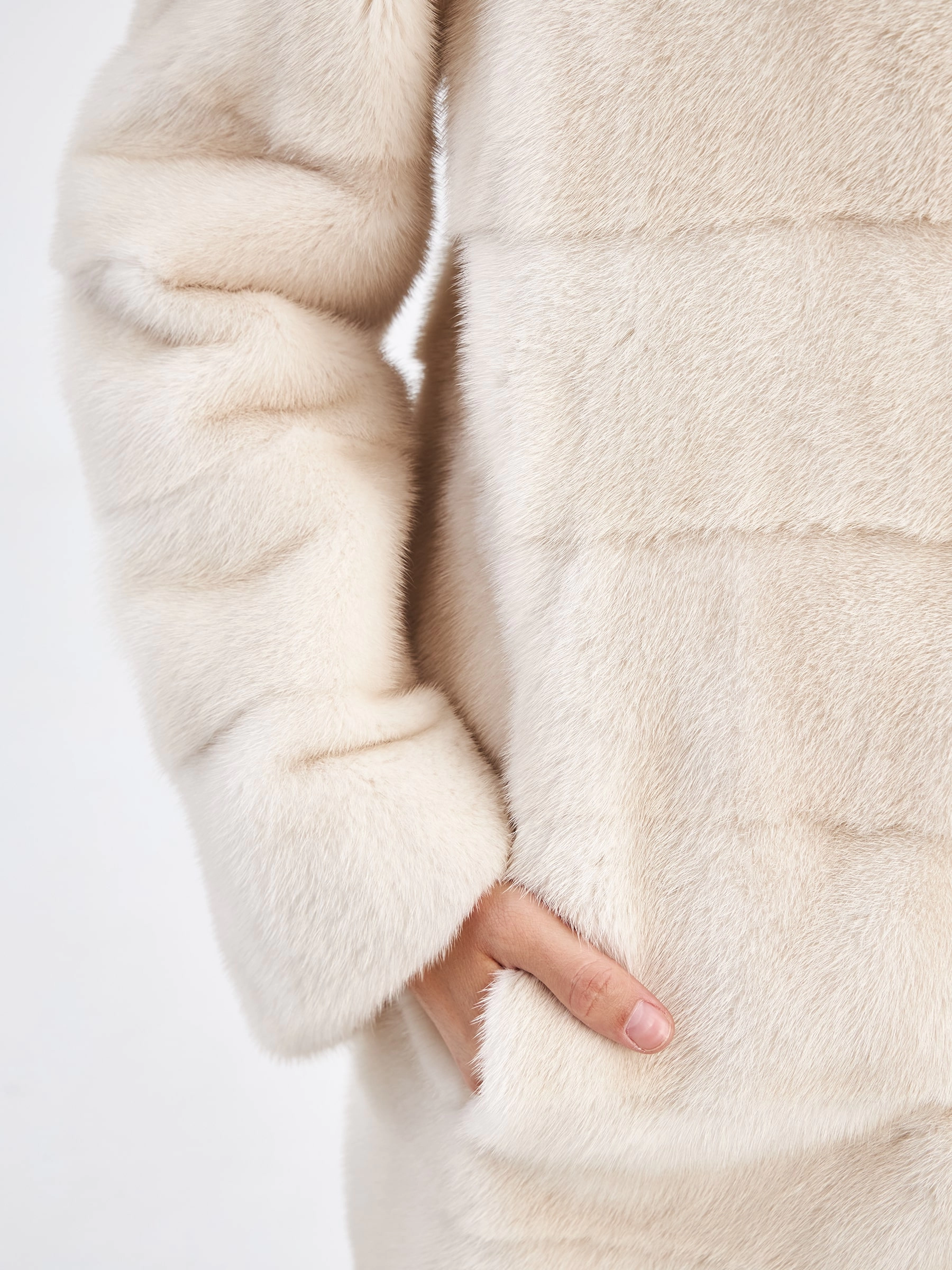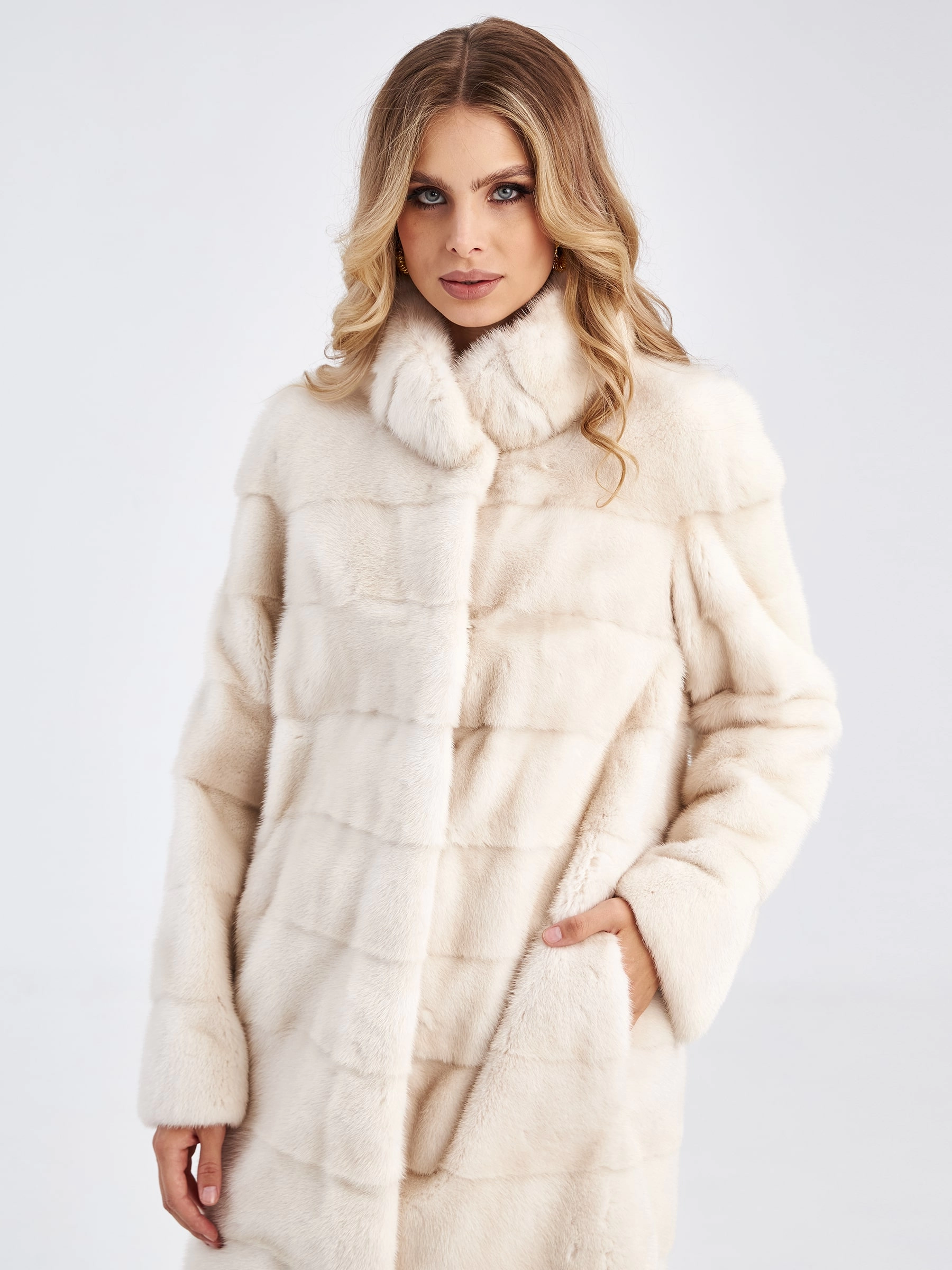 Поперечная норковая шуба с воротником стойкой для женщин Ася(в), жемчужная, размер 44, артикул 33760