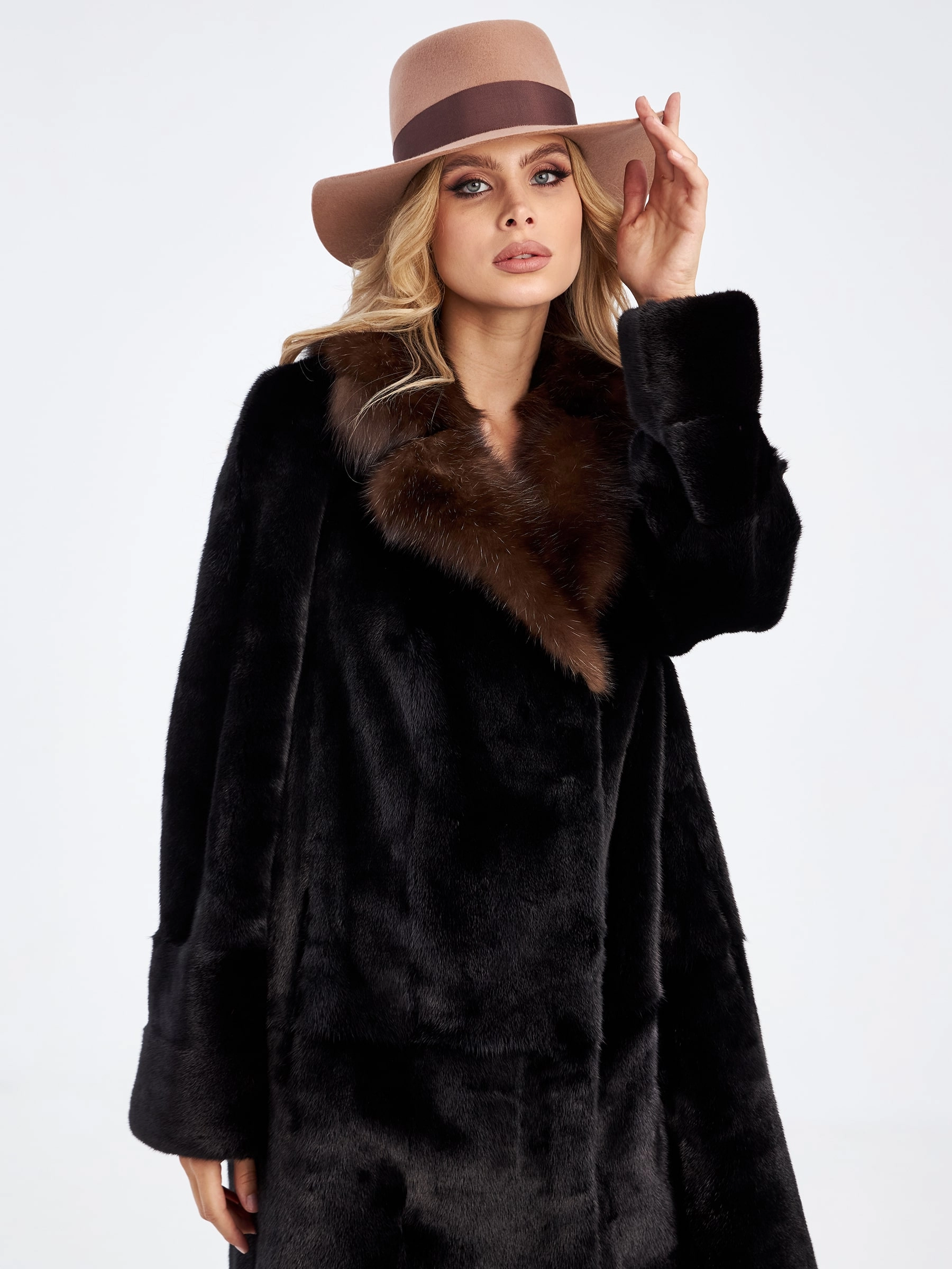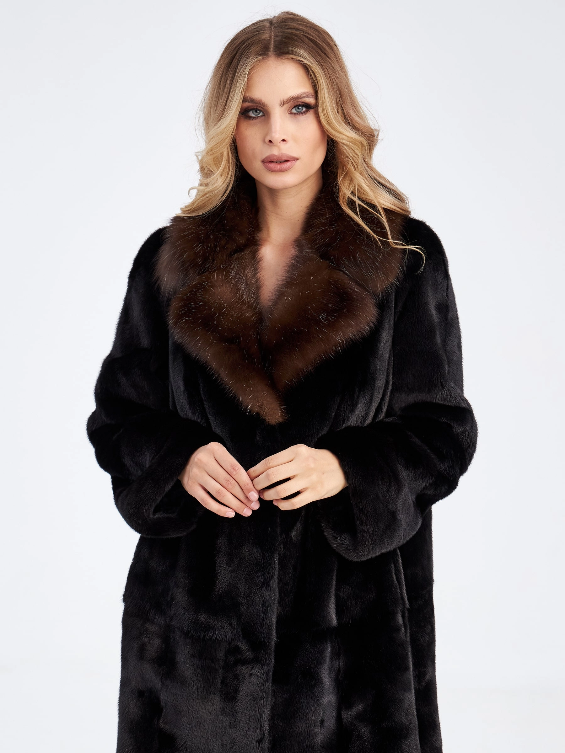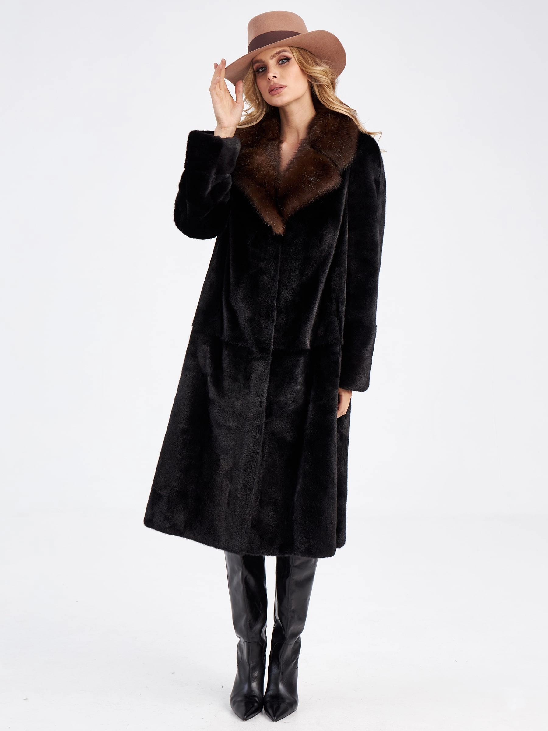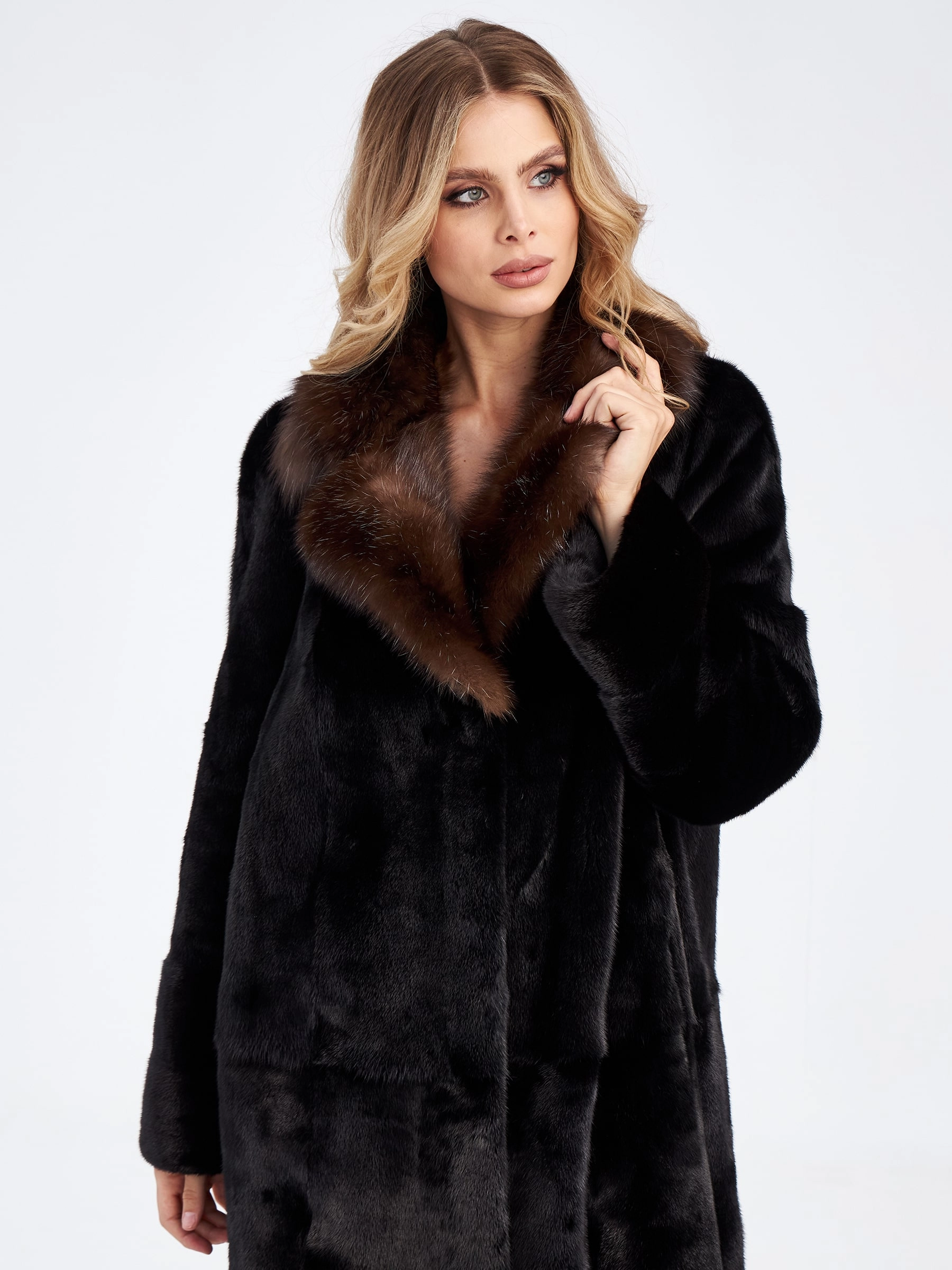 Товар шуба из меха норки с воротником из меха соболя для женщин лола(ав), черная, размер 52, артикул 33870 выполнен из норка с застежкой клипсы. Рассчитан на сезон: осень-зима. Длина изделия 113 см, силуэт прямой.
