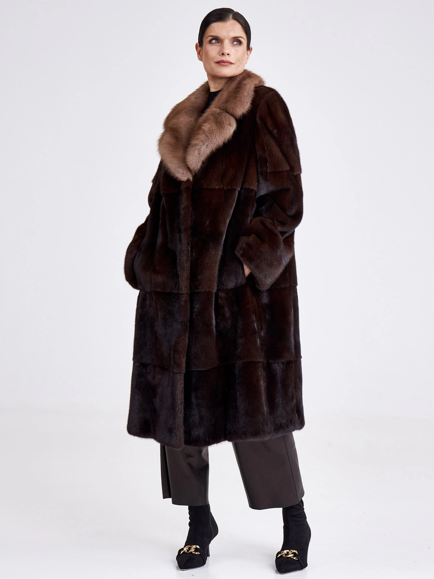 Товар шуба из меха норки женская лола(вк), длинная, с воротником из меха куницы, темно-коричневая, размер 54, артикул 33300 выполнен из норка крашенной с застежкой клипсы. Рассчитан на сезон: зима. Длина изделия свыше 90 см, силуэт прямой.