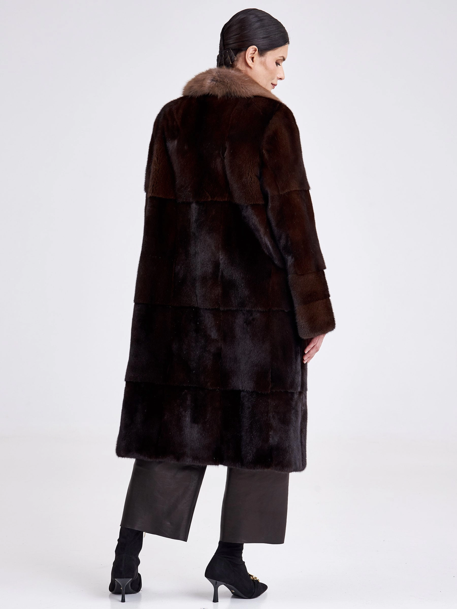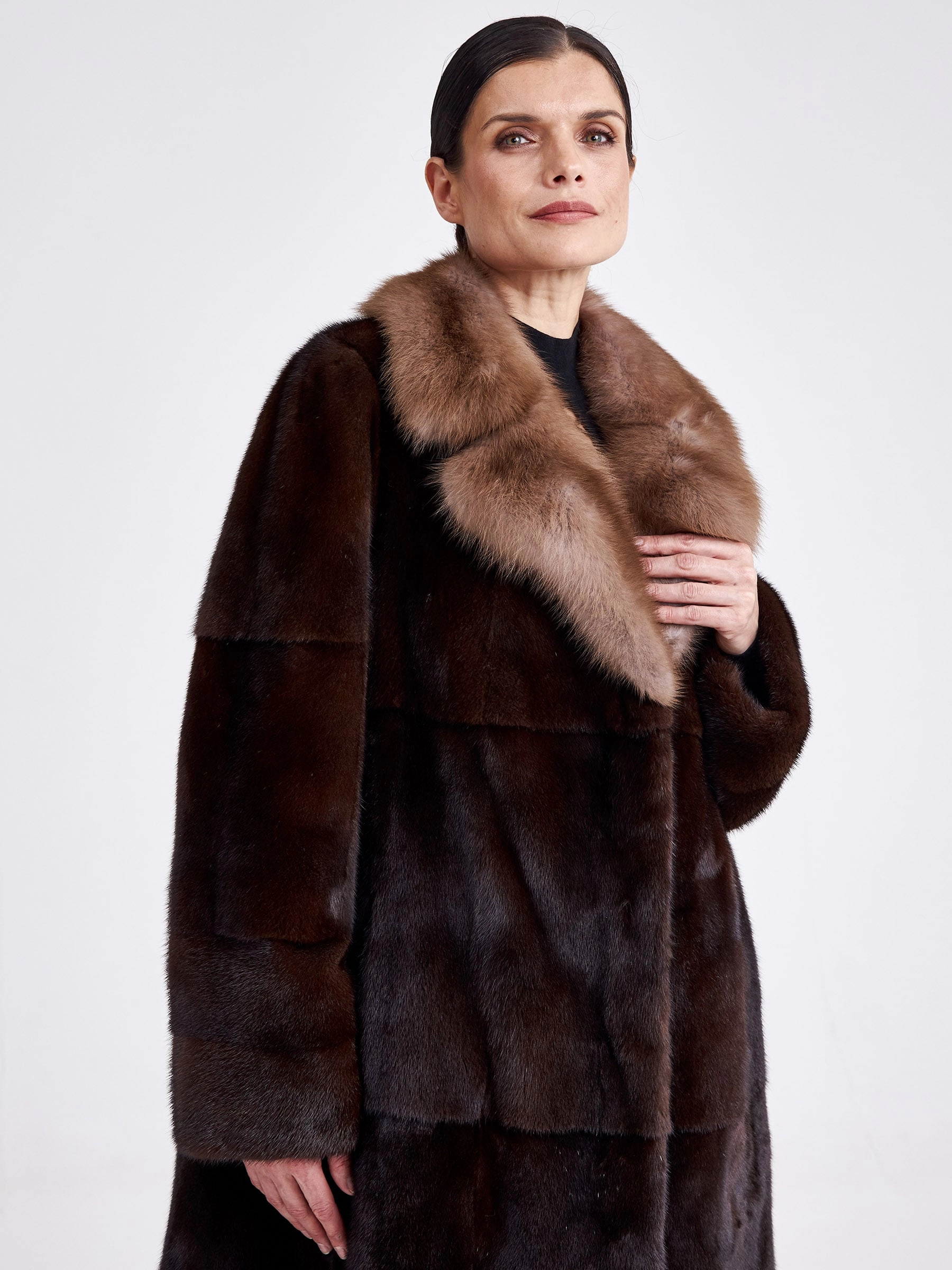 Женская шуба из тёмно-коричневой норки с английским воротником из куницы — вневременная классика, созданная для ценительниц элегантности. Эта модель прямого кроя и длины «макси» (свыше 90 см) сшита из скандинавской низковорсовой норки, а её строгий английский воротник выполнен из шелковистой куницы, что добавляет образу статусности и утончённости. Сдержанный дизайн без лишних деталей, втачной рукав, застёжка на клипсах и удобная подкладка из 100% вискозы обеспечивают безупречный комфорт и тепло в холодный сезон. Совет стилиста: сбалансированная строгость и лаконичность этой шубы делают её основой стильного зимнего гардероба — дополните её узкими брюками и водолазкой для делового лука или наденьте поверх платья-футляра и сапог на устойчивом каблуке для элегантного вечернего образа.
