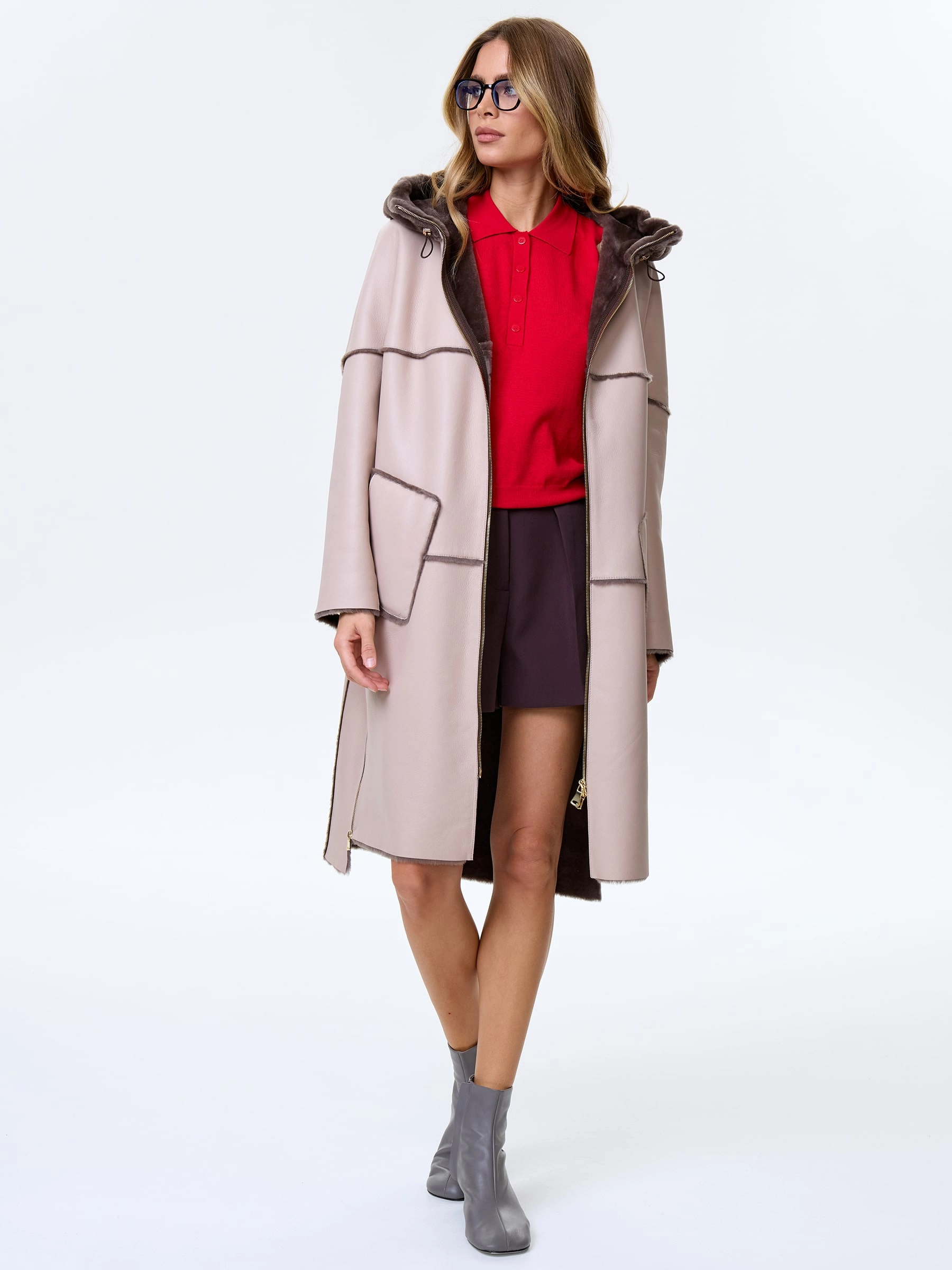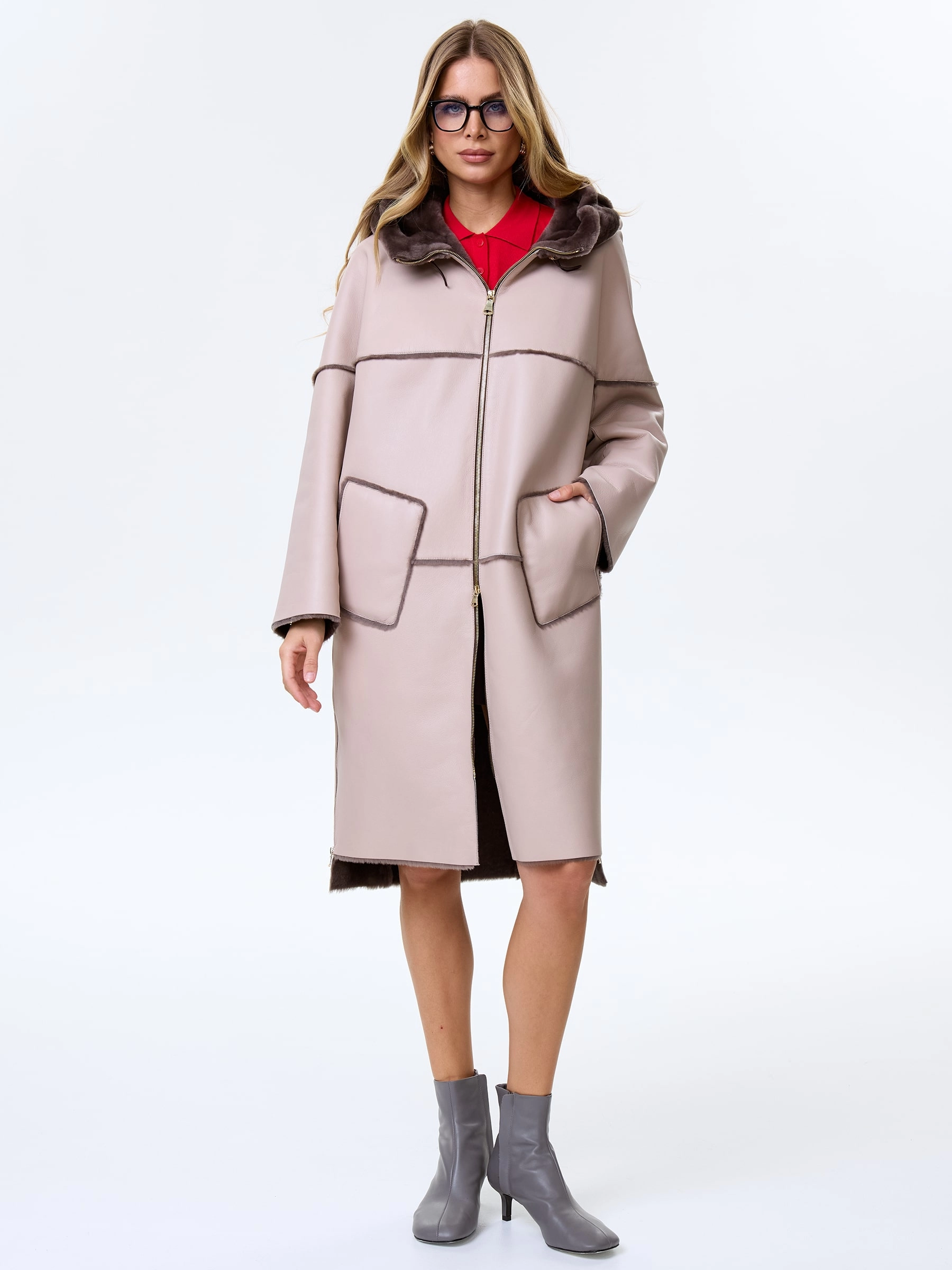 Модель свободного кроя выполнили из плотной овчины с гладкой фактурой и вывернутыми наружу швами. Дубленка получилась максимально теплой, но при этом легкой и комфортной. Боковые разрезы как и само изделие застегиваются крупными молниями. Для защиты от ветра предусмотрели объемный капюшон.