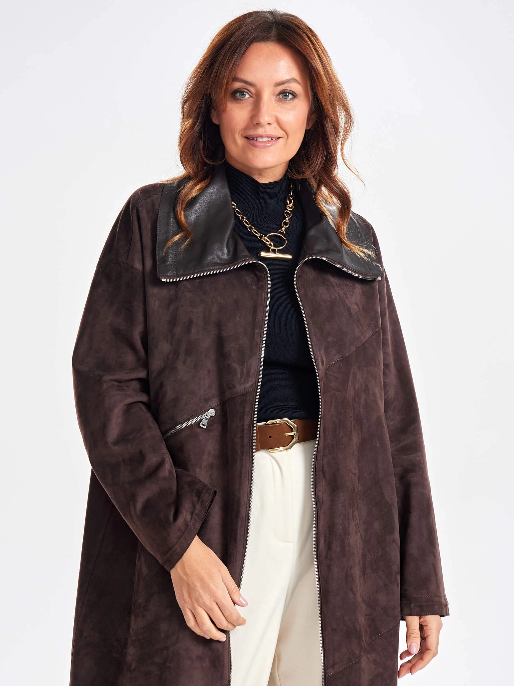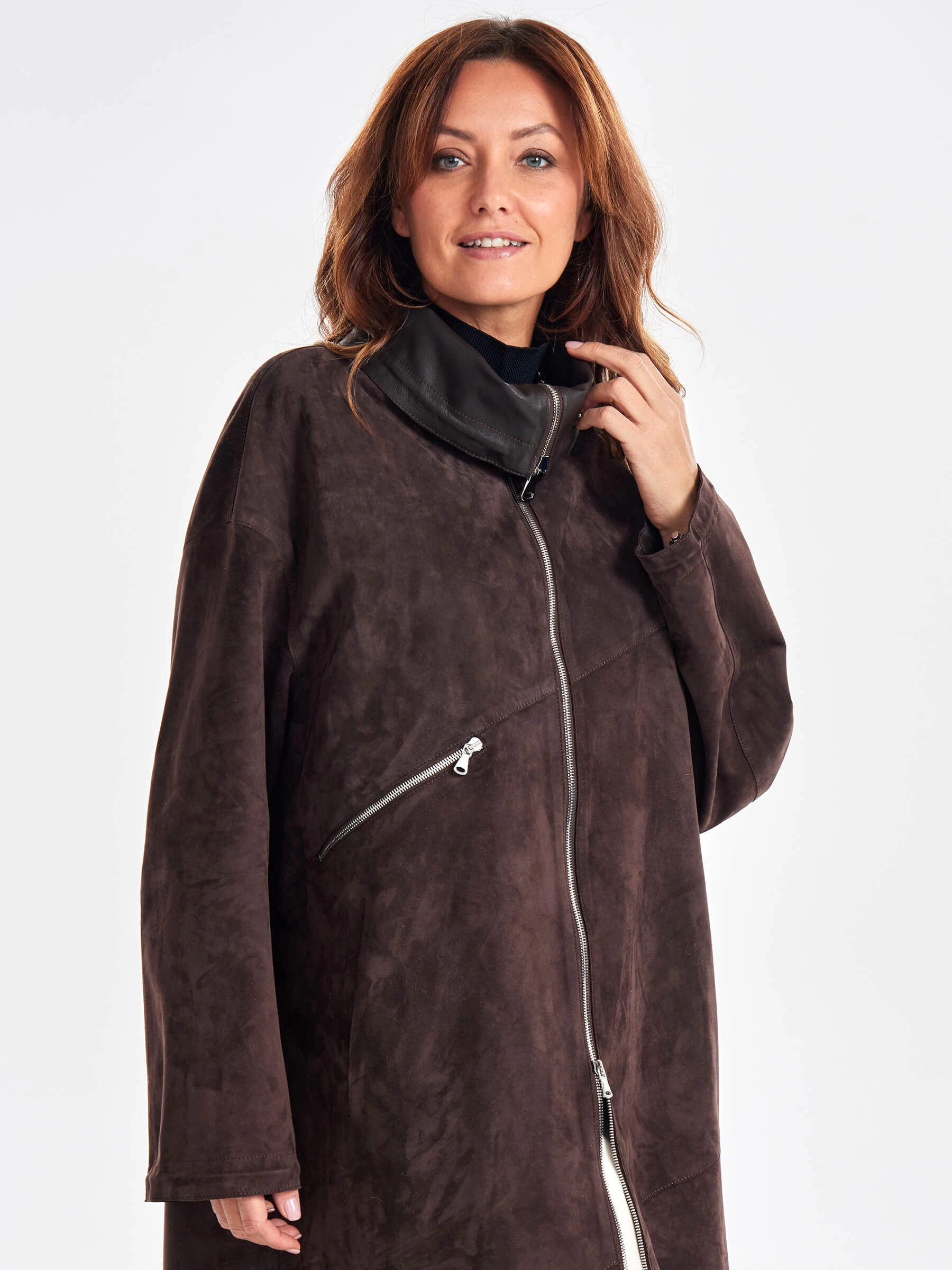 Товар трендовое женское замшевое пальто оверсайз премиум класса 3061з, коричневое, размер 50, артикул 63430 выполнен из натуральной замши с застежкой молния. Рассчитан на сезон: весна-лето. Длина изделия 115 см, силуэт оверсайз.