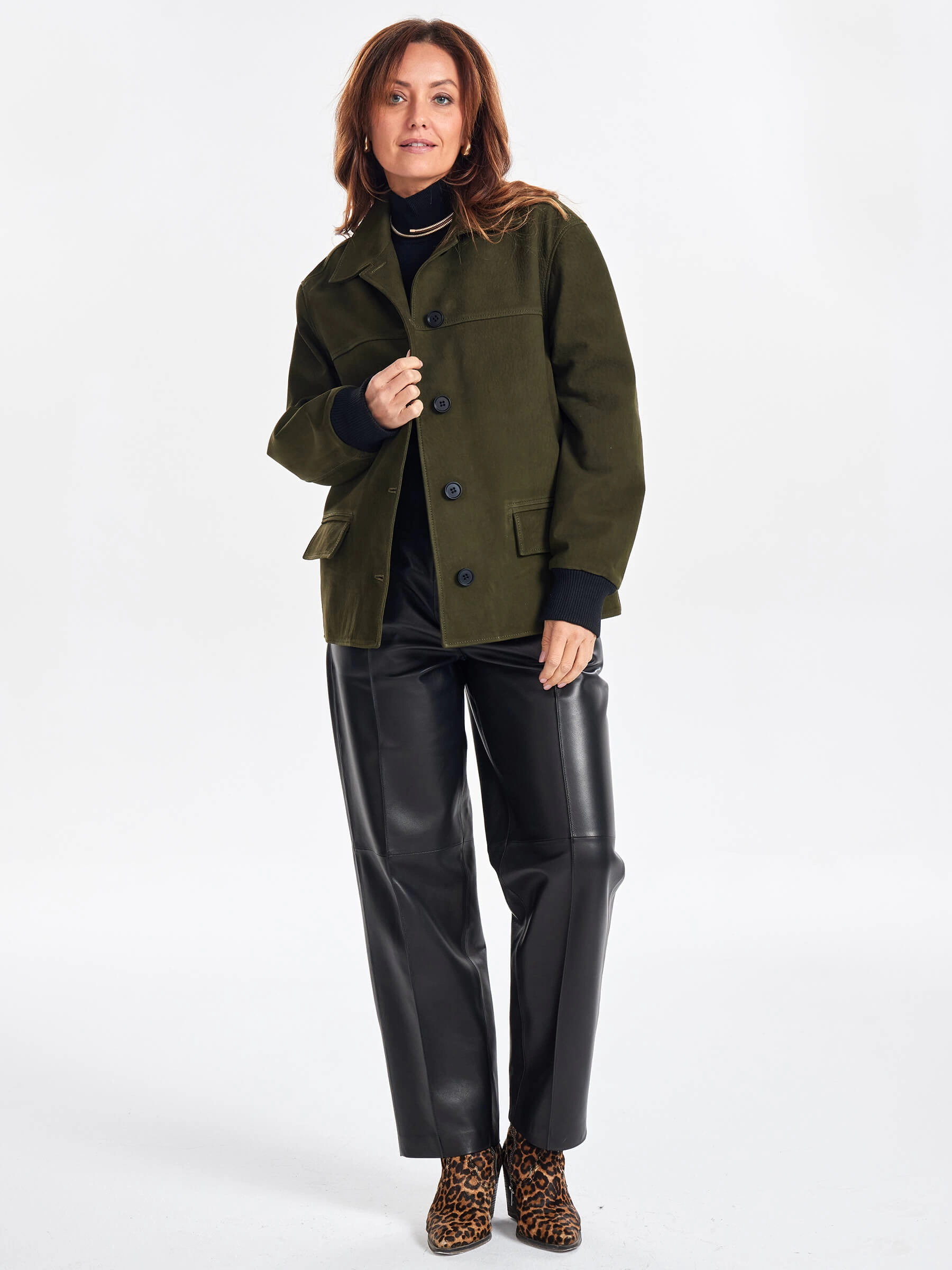 При пошиве этой лаконичной куртки с английским воротником и двумя карманами использовали мягкую кожу премиум класса. Модель свободного силуэта, со спущенной линией плеч не сковывает движения, удобно садится по фигуре. Дополнительный комфорт добавят трикотажные манжеты и пояс. Классический дизайн изделия будет одинаково гармонично смотреться как с брюками так и с платьем.
