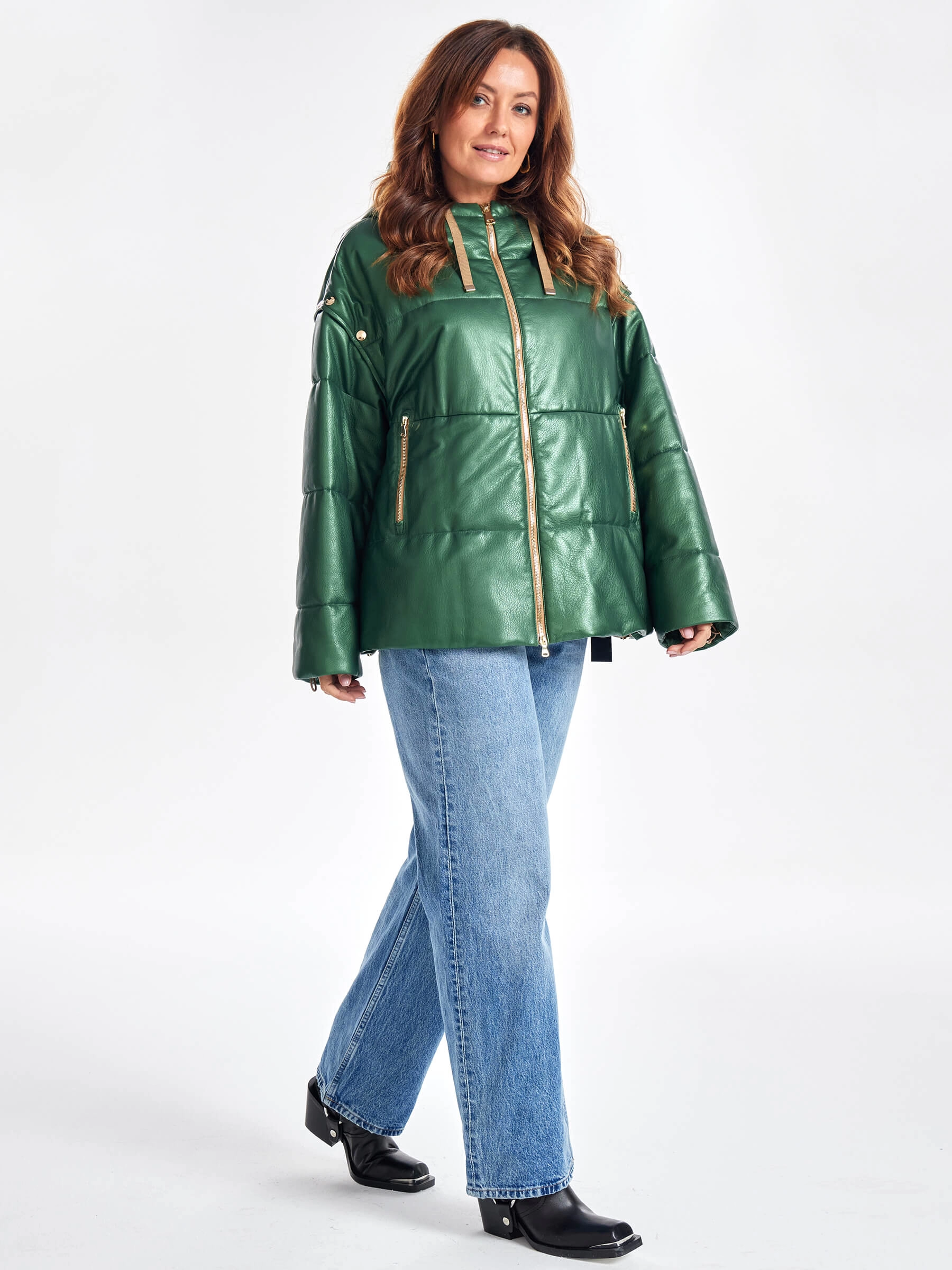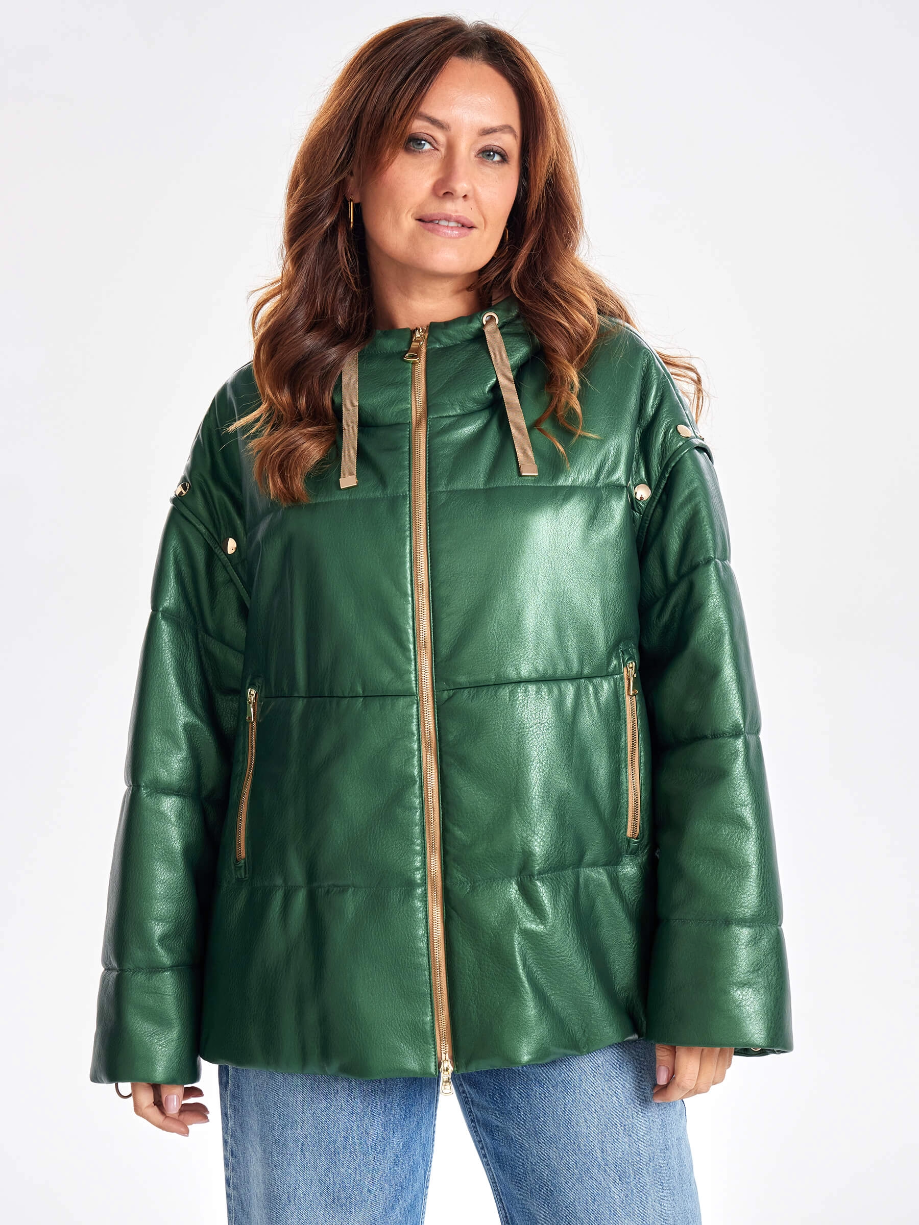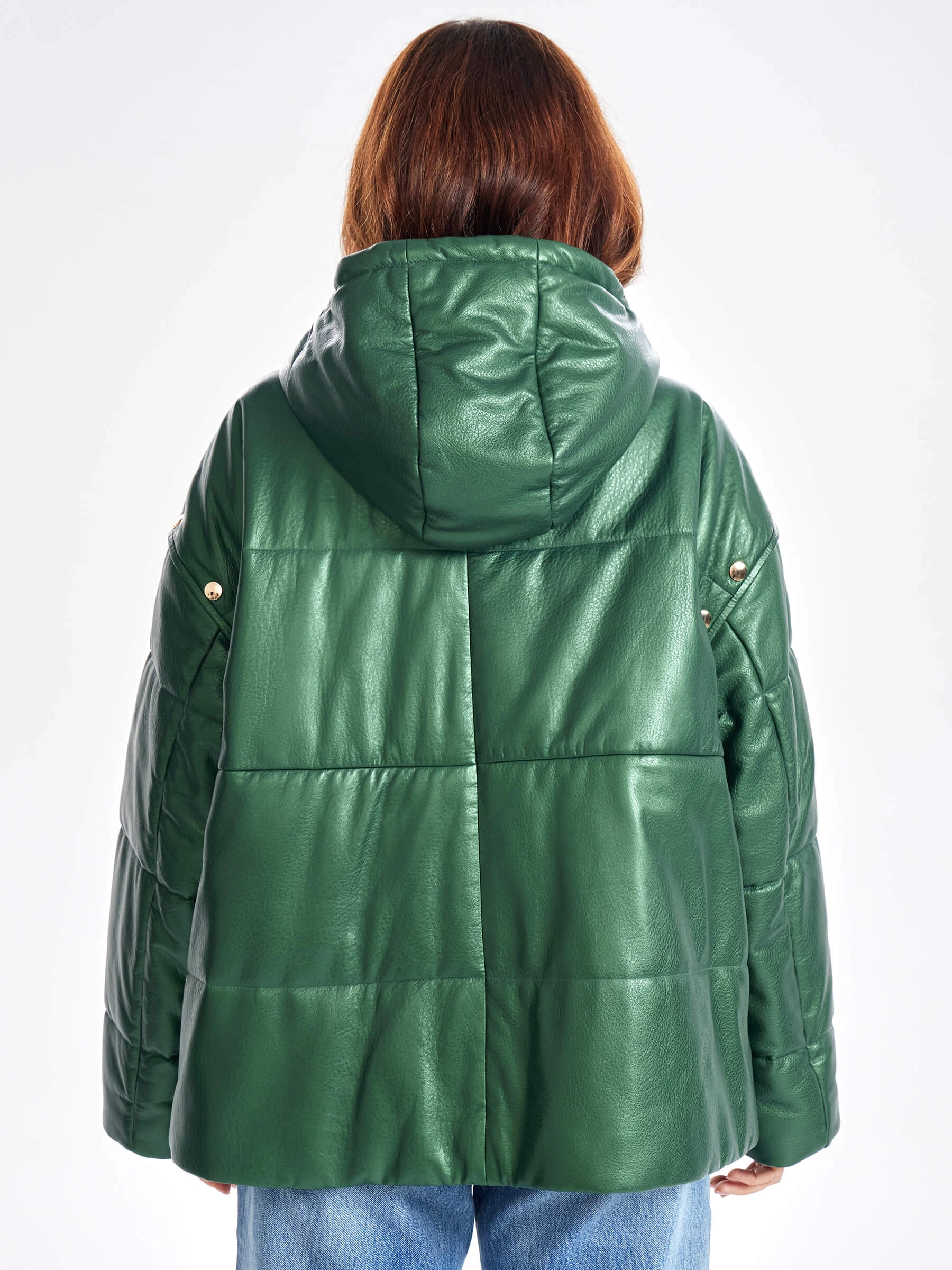Утепленная женская кожаная куртка оверсайз с капюшоном премиум класса 3023, зеленая, размер 52, артикул 23330