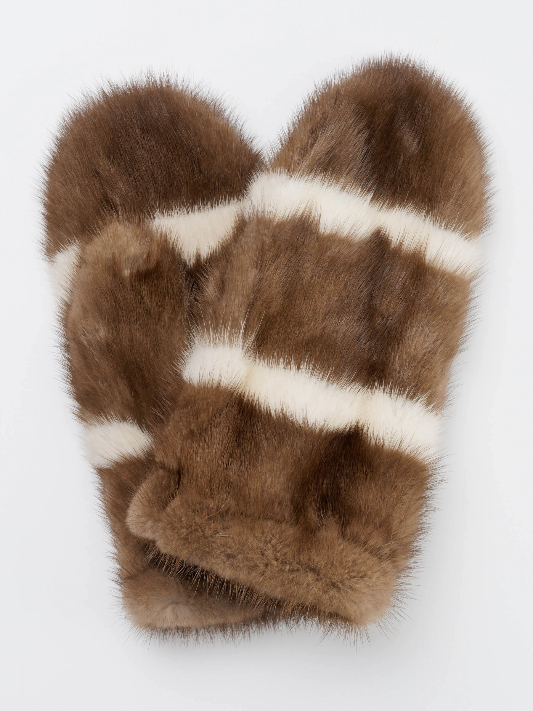 Варежки меховые из норки комбинированные. Верх выполнен из частей меха норки, ладошка из замши коричневого цвета, вшит трикотажный манжет. Внутренняя подкладка изготовлена из вискозы. Данные варежки удобны для автоледи.