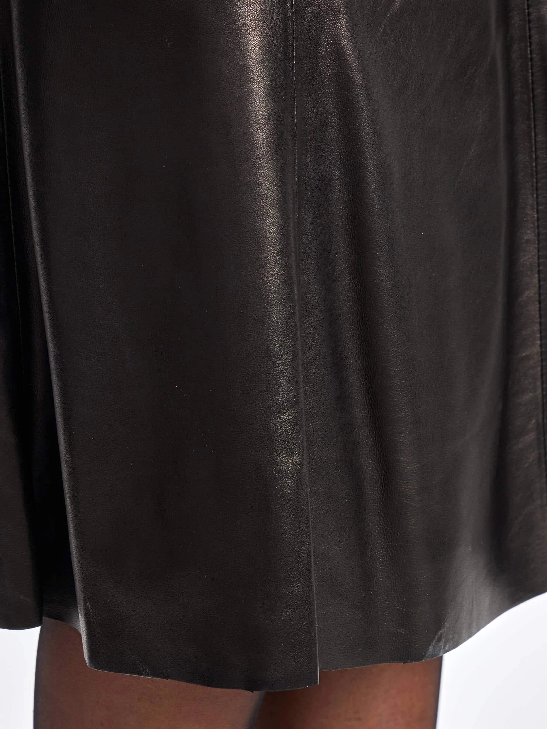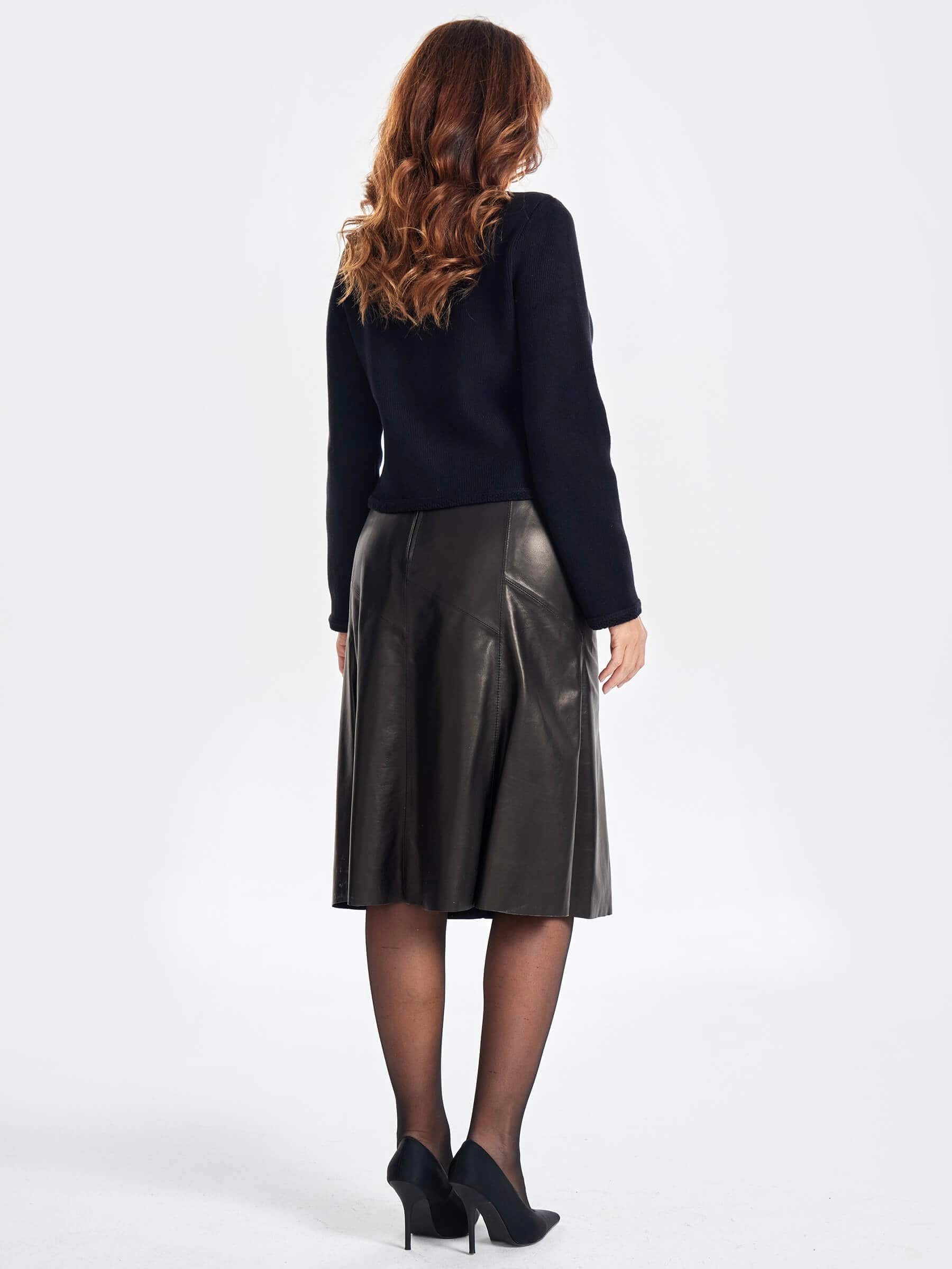 Стильная юбка из натуральной кожи с заниженной талией без пояса сочетает изысканность с современной дерзостью, демонстрируя идеально гладкую пластичную кожу премиального качества, которая облегает бёдра и мягко расклешёвывается книзу благодаря элегантным вставкам-годе, создавая при каждом шаге эффектный струящийся объём. Потайная молния на спинке обеспечивает удобство и сохраняет чистоту линий, а универсальный дизайн делает модель идеальной для создания разнообразных образов — от офисных до вечерних. Эта юбка легко сочетается с базовыми топами, классическими лодочками, модными кроссовками или изысканными аксессуарами, сохраняя все преимущества натуральной кожи: пластичность, комфорт и благородный блеск, что делает её прекрасным выбором для города, работы и особых случаев.
