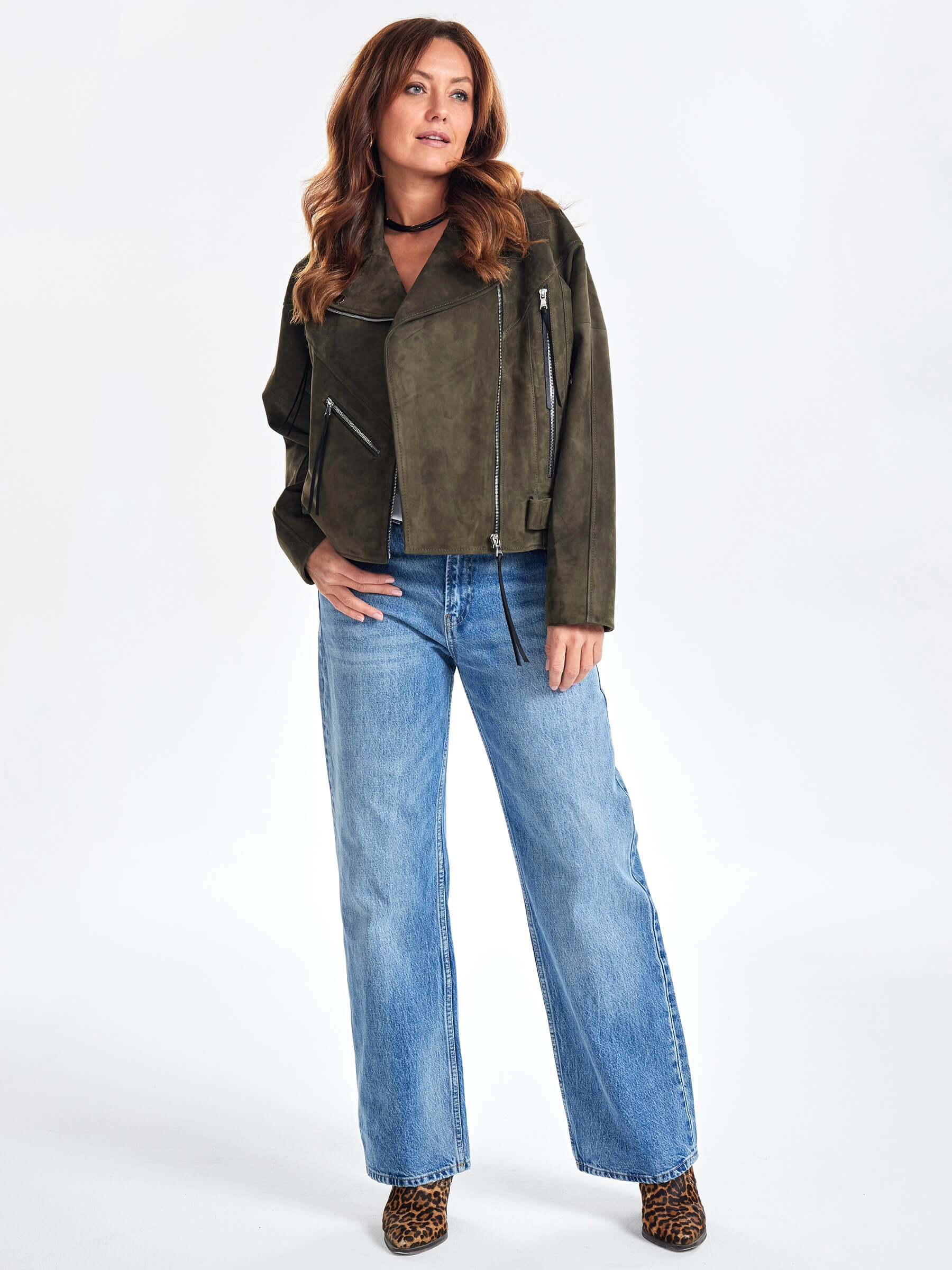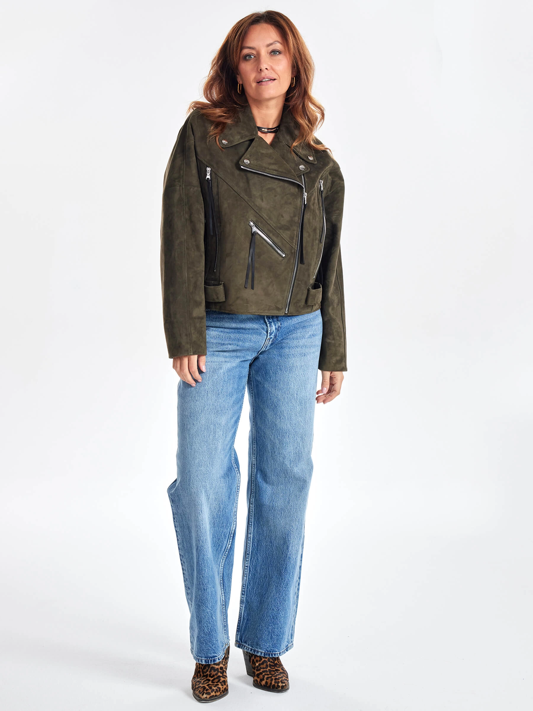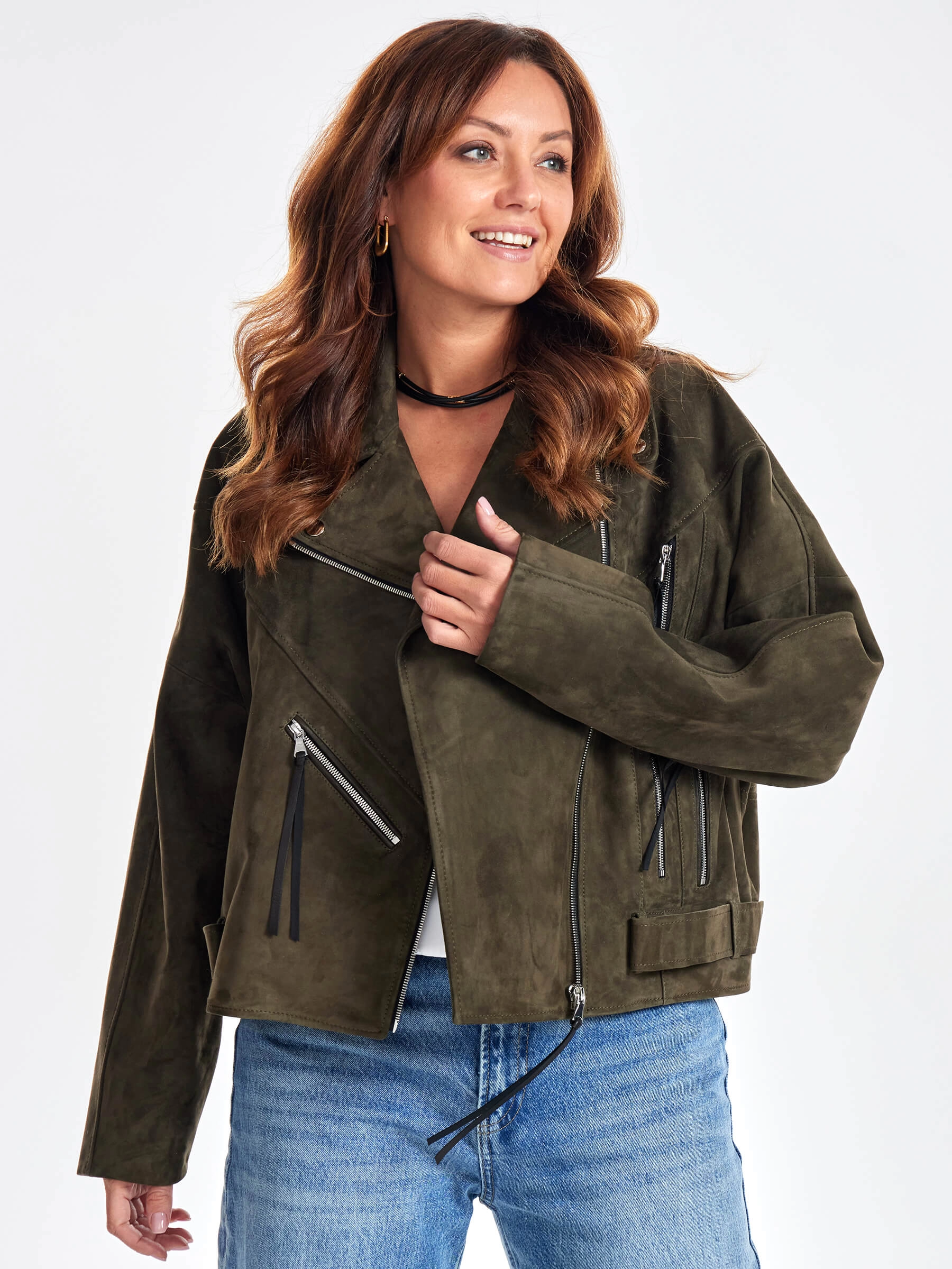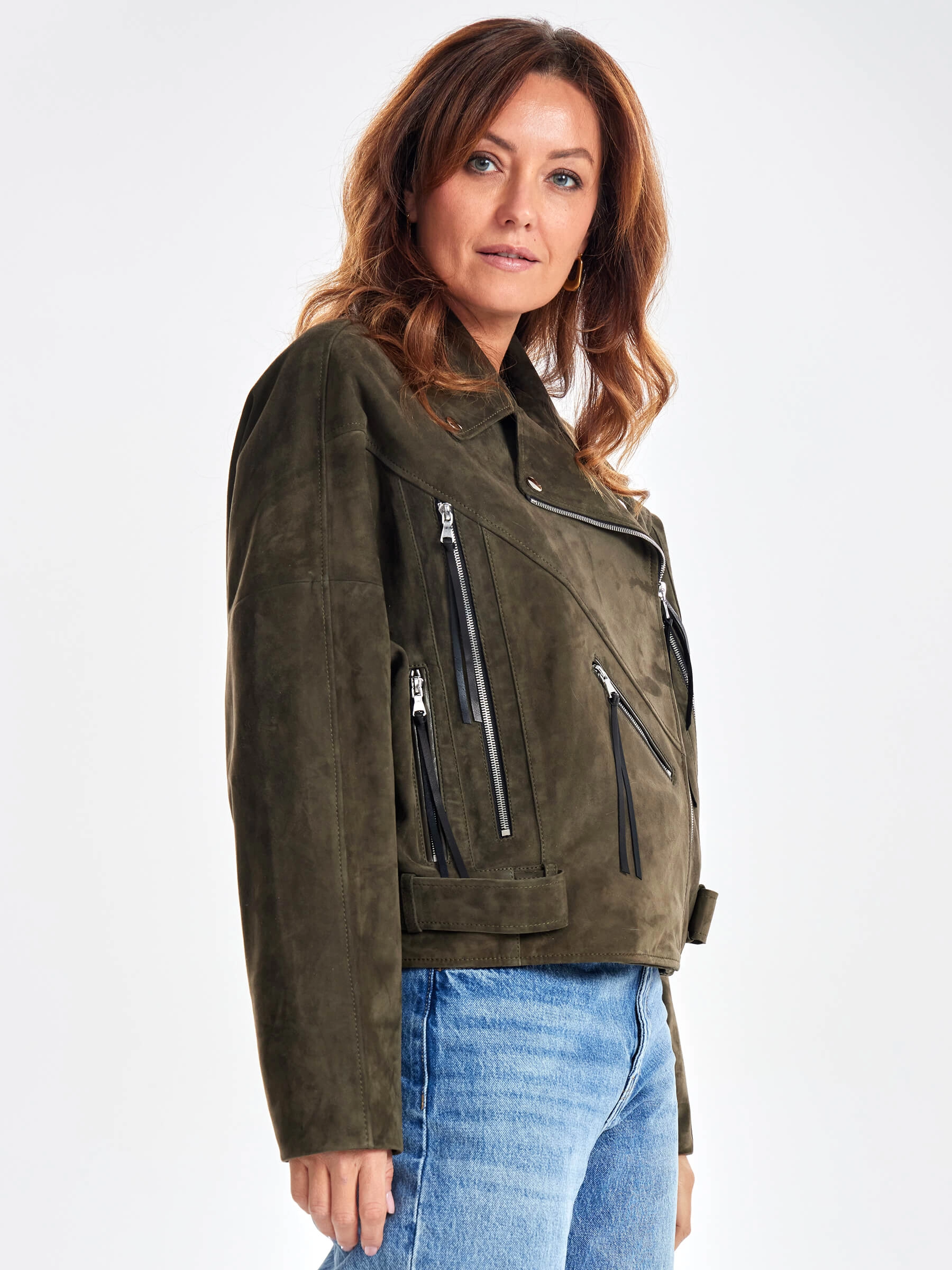 Замшевая короткая куртка косуха для женщин премиум класса 3051з, хаки, размер 44, артикул 23420